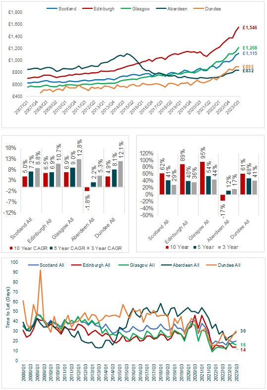 Zoopla reported that rent inflation in Edinburgh & Glasgow was higher than in any other UK city, rising by c.16% and c.14% respectively between June 2022 and June 2023. The same report concluded that the next highest inflation was in London at 12%.