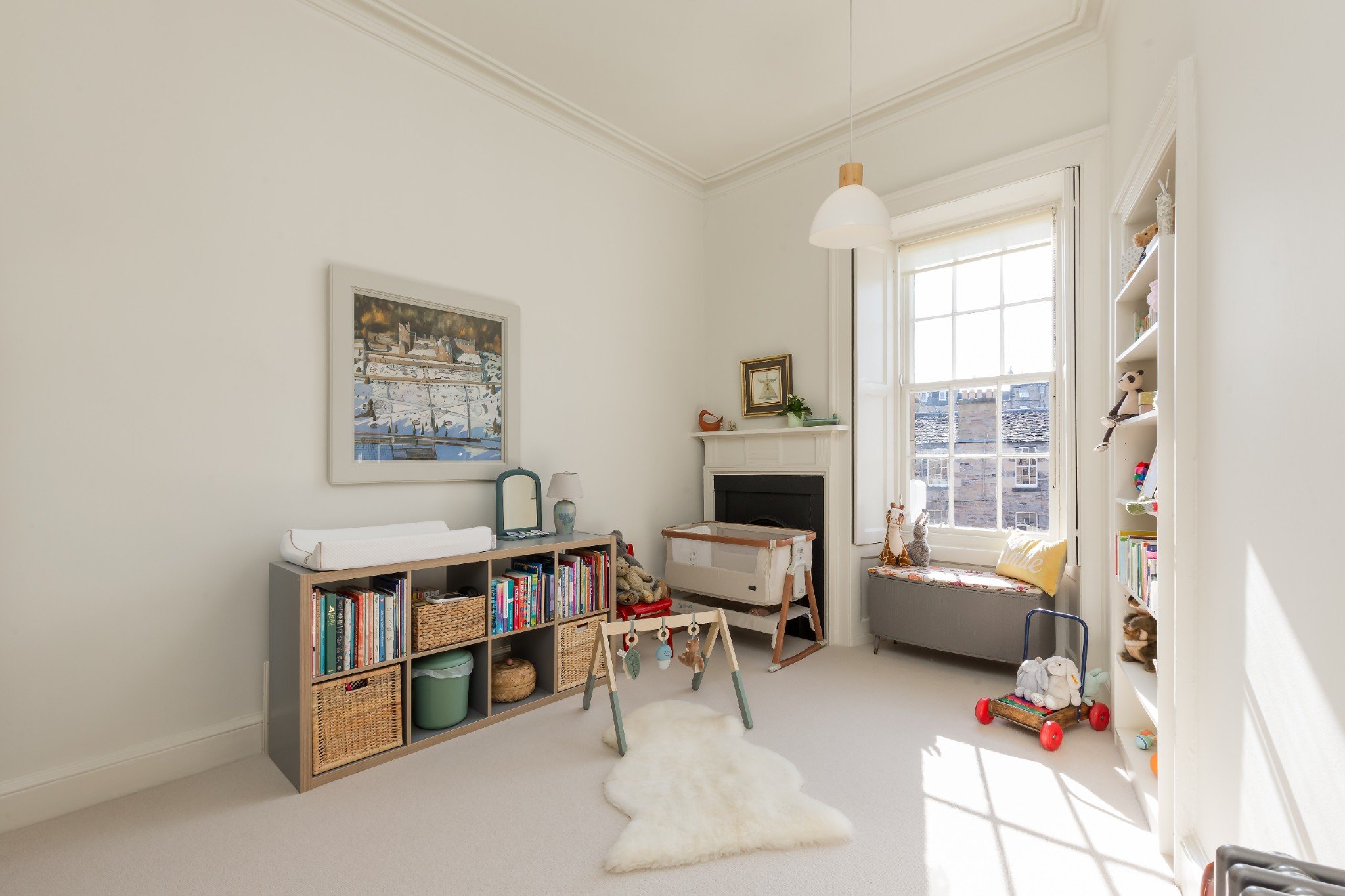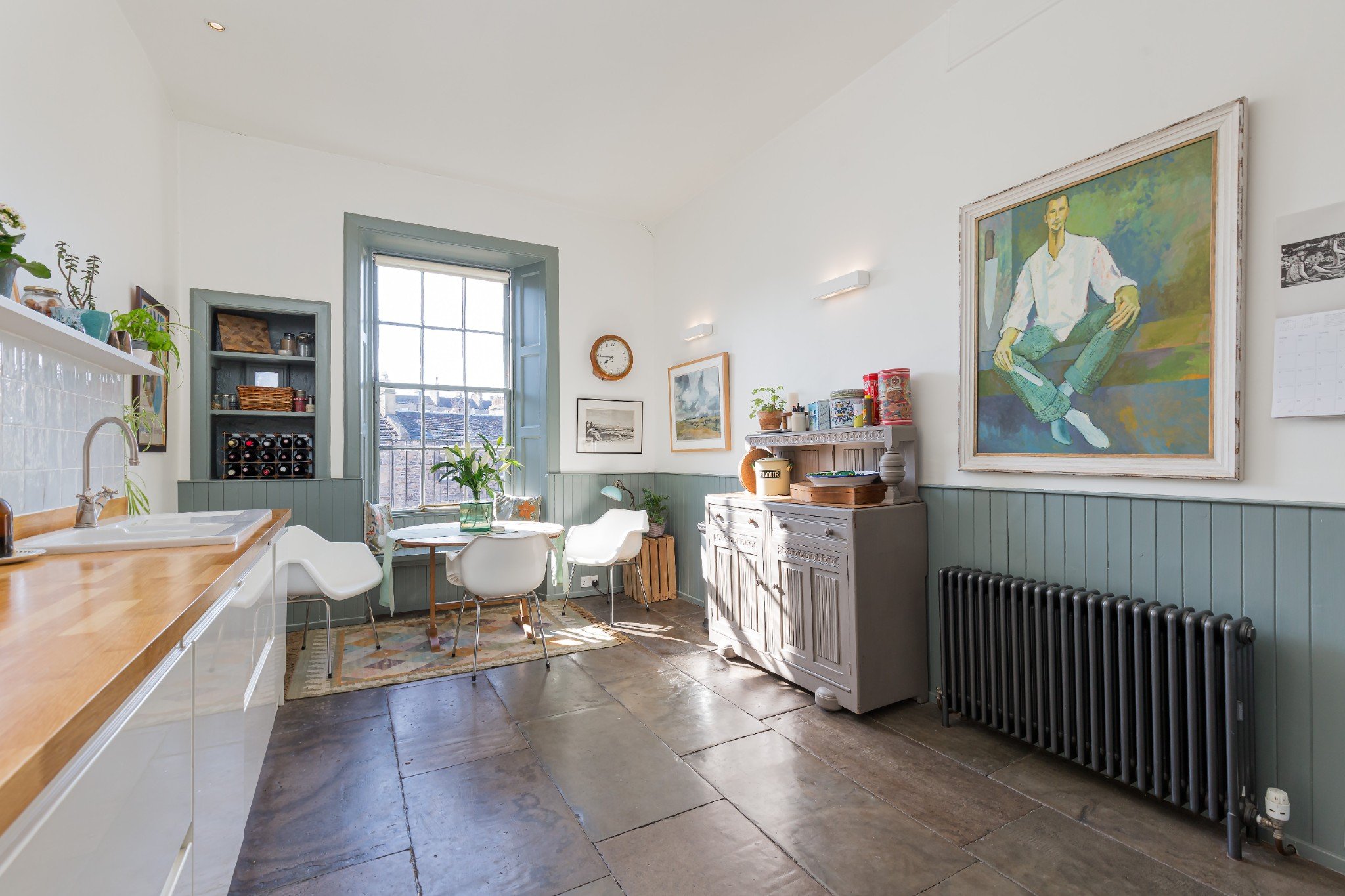 Flooded with natural light through tall sash windows, the property offers sweeping views over the communal gardens and the rooftops of the New Town. Quiet yet central, it's perfectly placed: just a short stroll to Stockbridge, the West End, and the cultural pulse of the city.