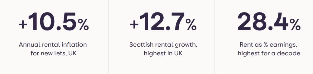 Scotland is recording the fastest growth in rents at 12.7% where rent controls are forcing landlords to maximise rents for new lets.