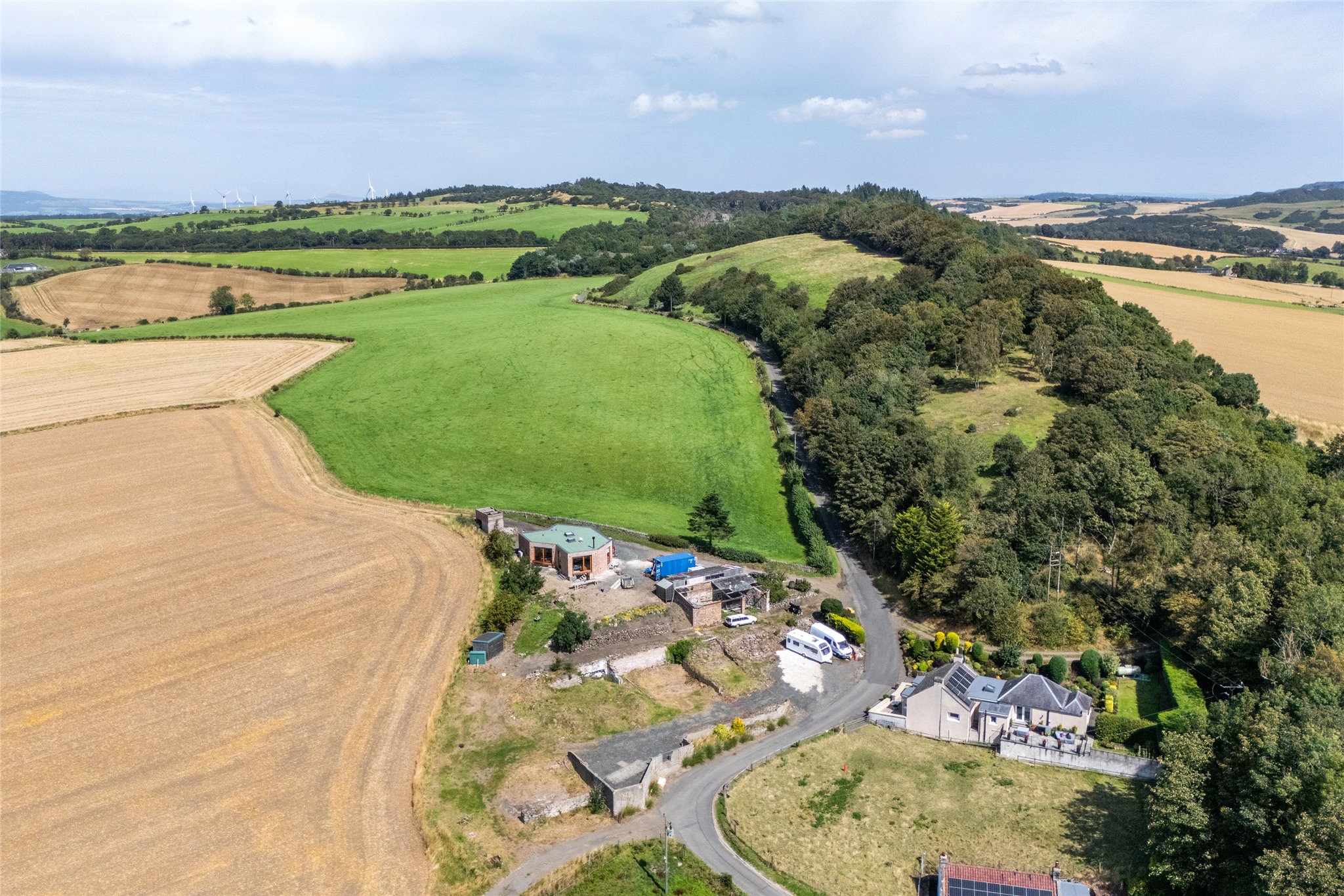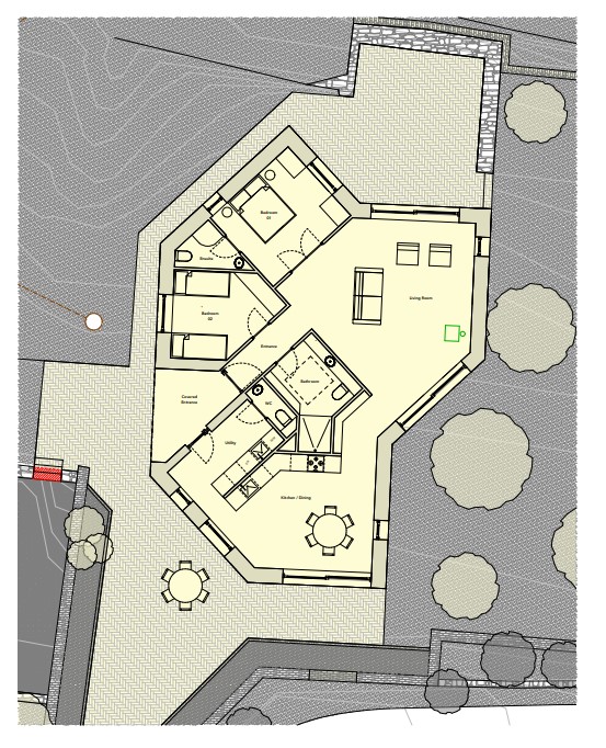 The proposed development offers a spacious open plan kitchen, living and dining space that provides garden access through sliding doors, offering views across the Forth. The two bedrooms are accessed from the entrance hallway and off the living room respectively. A generous parking area is provided to the east of the house and is accessed from the farm track to the south. There is potential to extend the design to include a private garage. The house is accessed directly from a new driveway off Otterston Loch Rd.