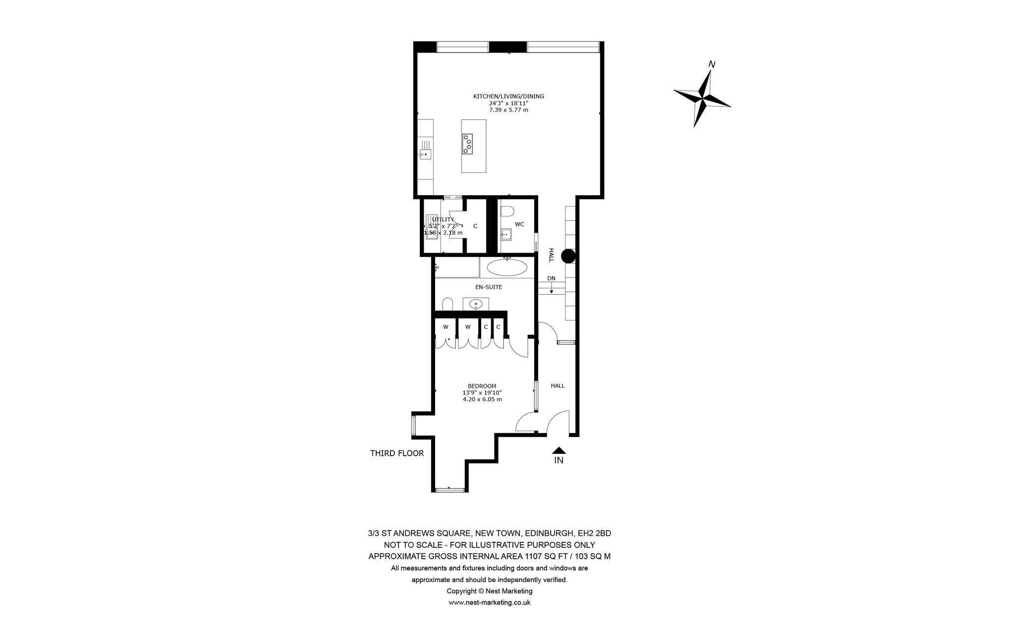 One luxury bedroom with stunning bathroom and dressing area, there is a further guest cloakroom, a spacious lounge and dining area with large front facing windows on to St Andrews Square, kitchen with luxury appliances, utility room and work area.