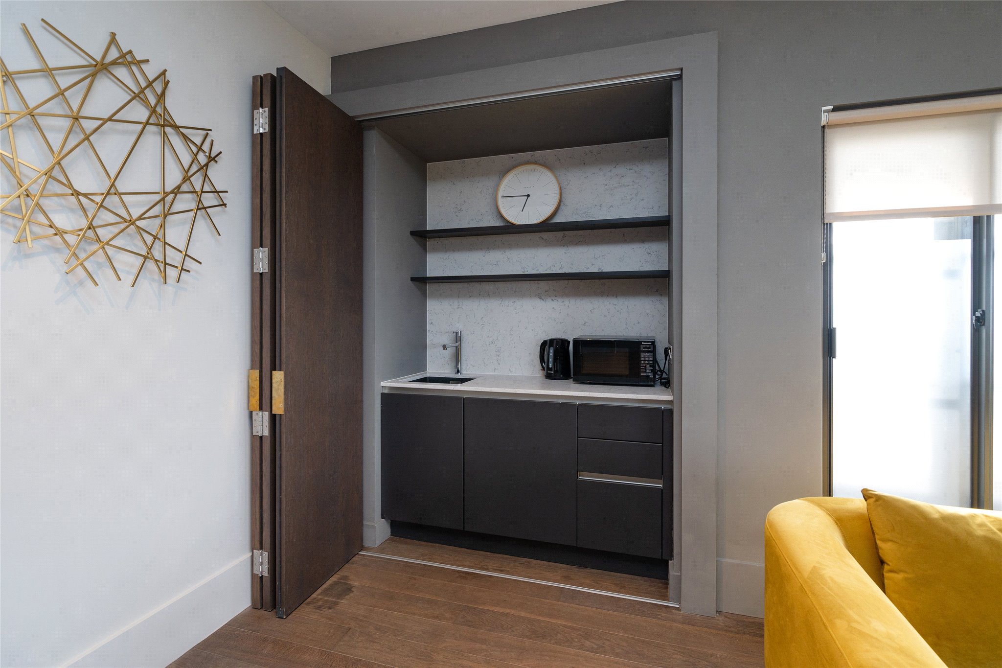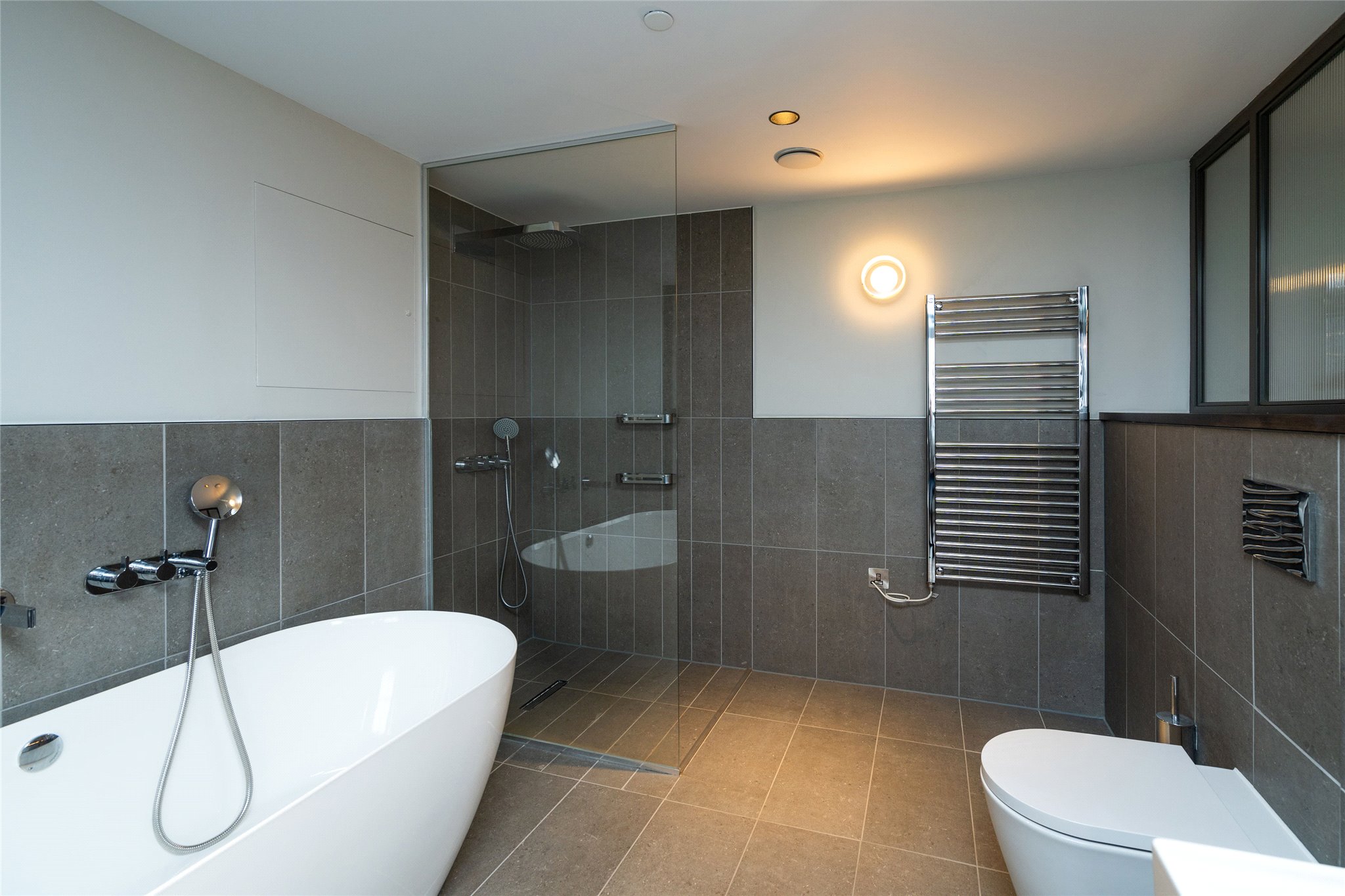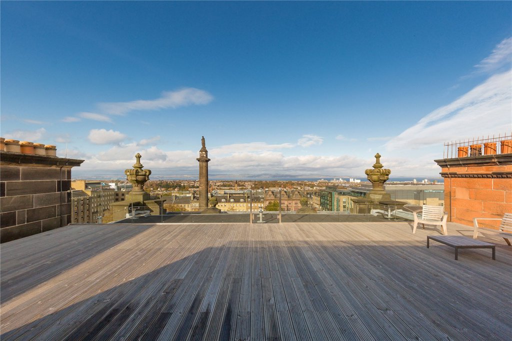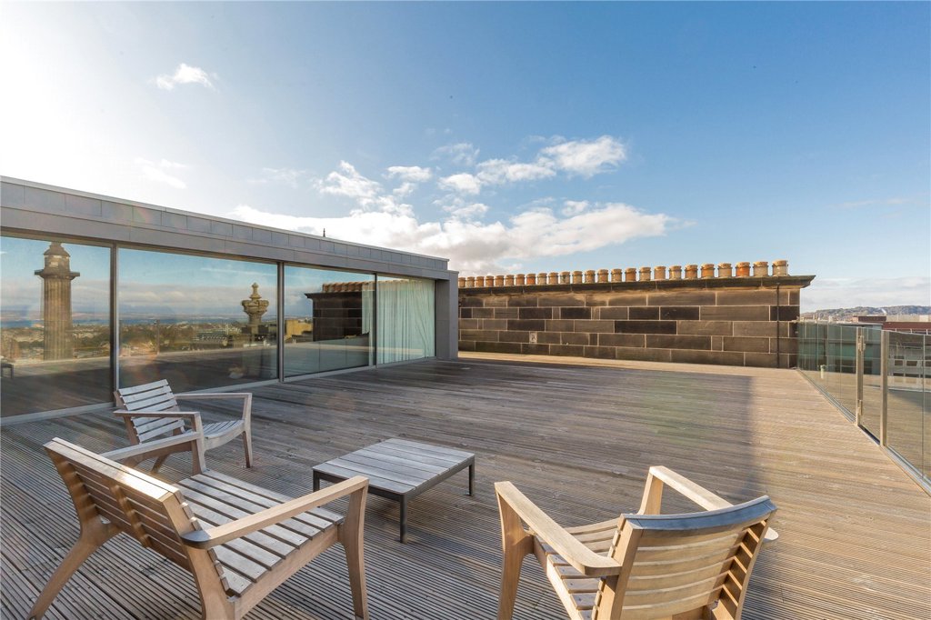 The upper floor boasts a luxurious glass fronted living area outfitted with air conditioning. The kitchen has fully integrated appliances and stone worktops, a prep kitchen, and dining area that look onto the spectacular 50 sqm roof terrace, which offers 360-degree views across Edinburgh and beyond. A service entrance is also on this floor.