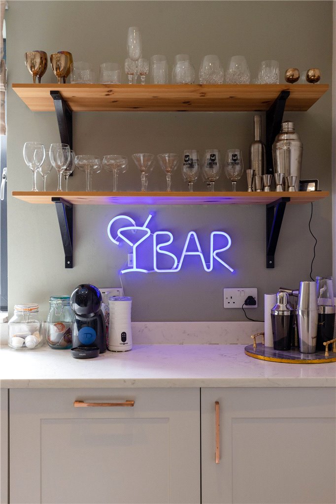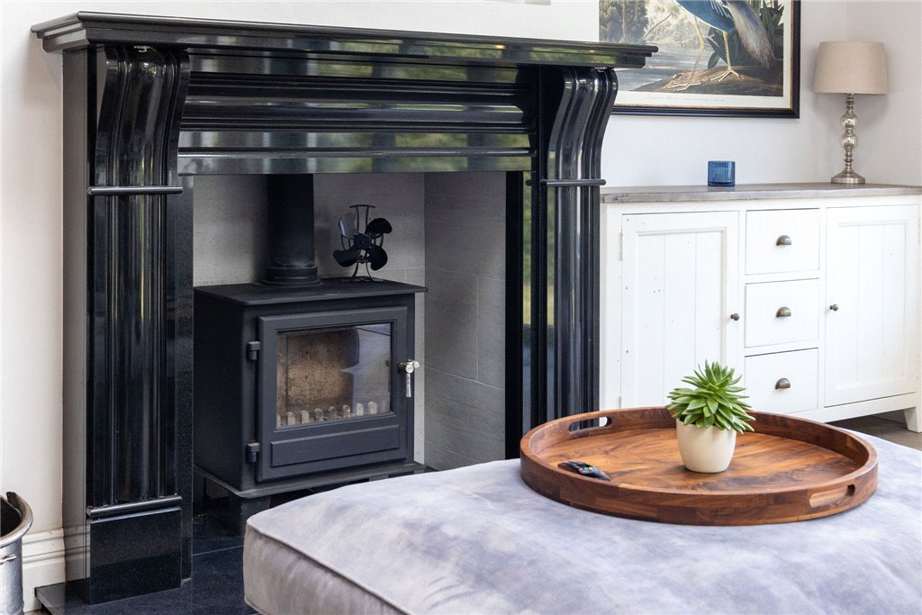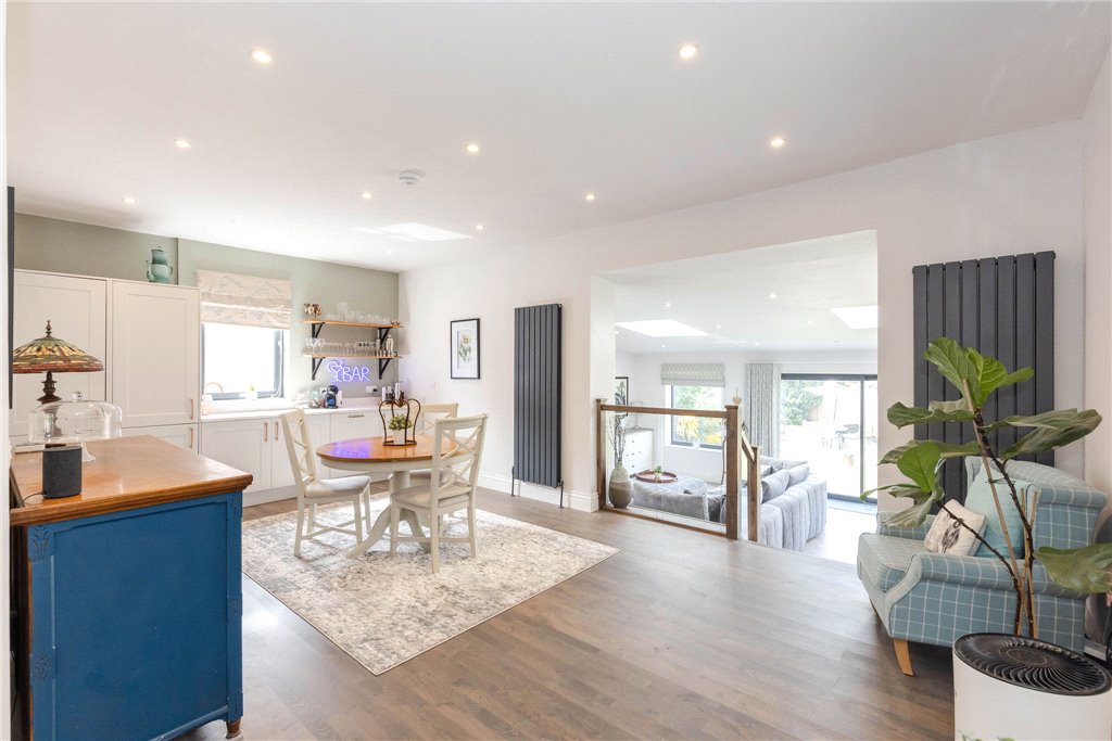 Entrance vestibule; Hallway; Impressive open-plan kitchen and living room, with breakfast bar, wine cooler, pantry and log burning stove; Separate dining room with bar area; Principal bedroom with ensuite shower-room; Two further double bedrooms; Family Bathroom with bath and separate shower cubicle.