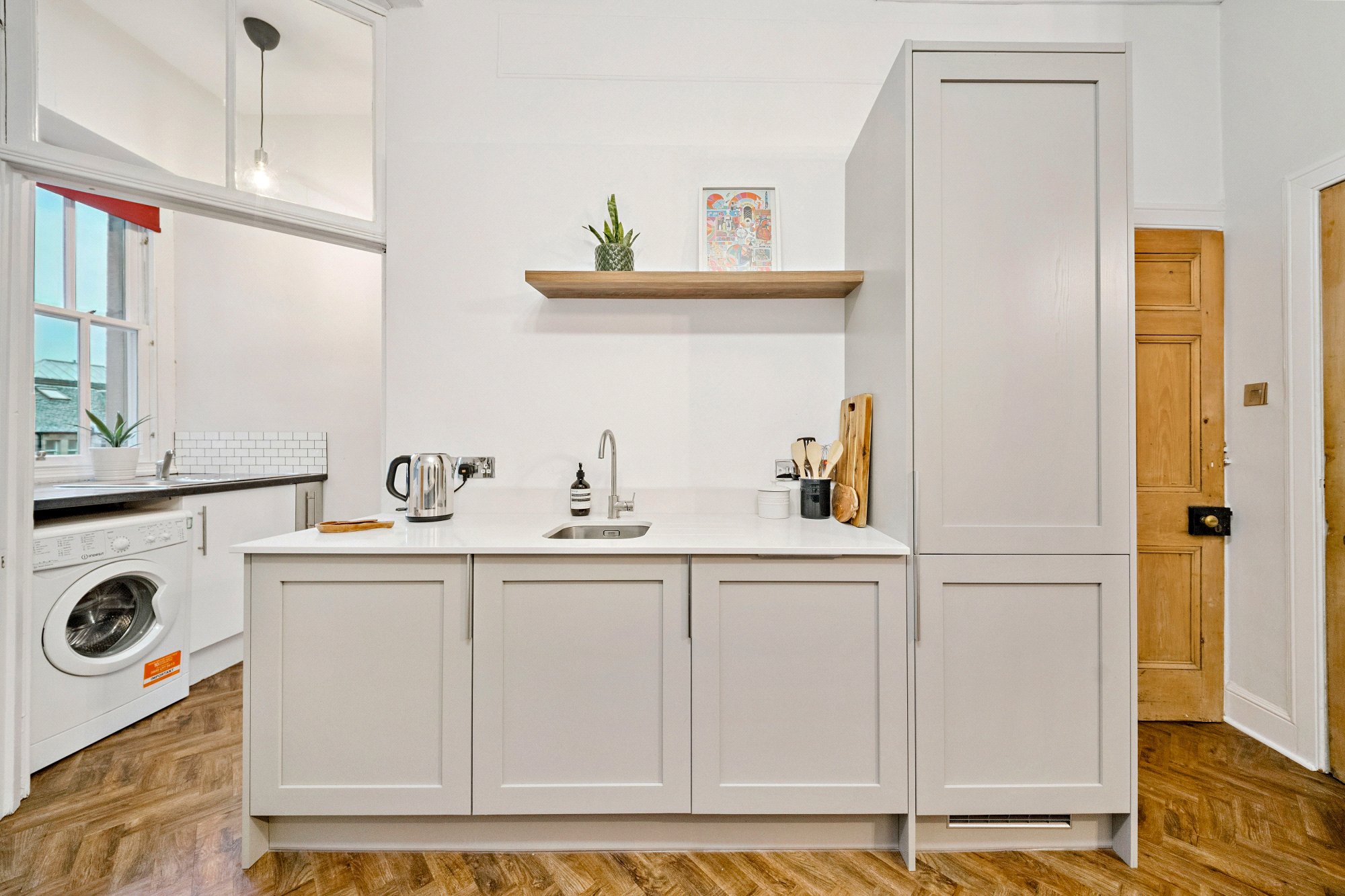 The flat features a large and bright lounge, ideal for relaxing or entertaining, alongside a well appointed kitchen and dining area with a separate pantry for additional storage. A utility room provides further practicality, keeping everyday living neat and organised. In addition to two comfortable bedrooms, the property benefits from a separate office, perfect for home working or study. The accommodation is completed by a modern bathroom and access to a garden.