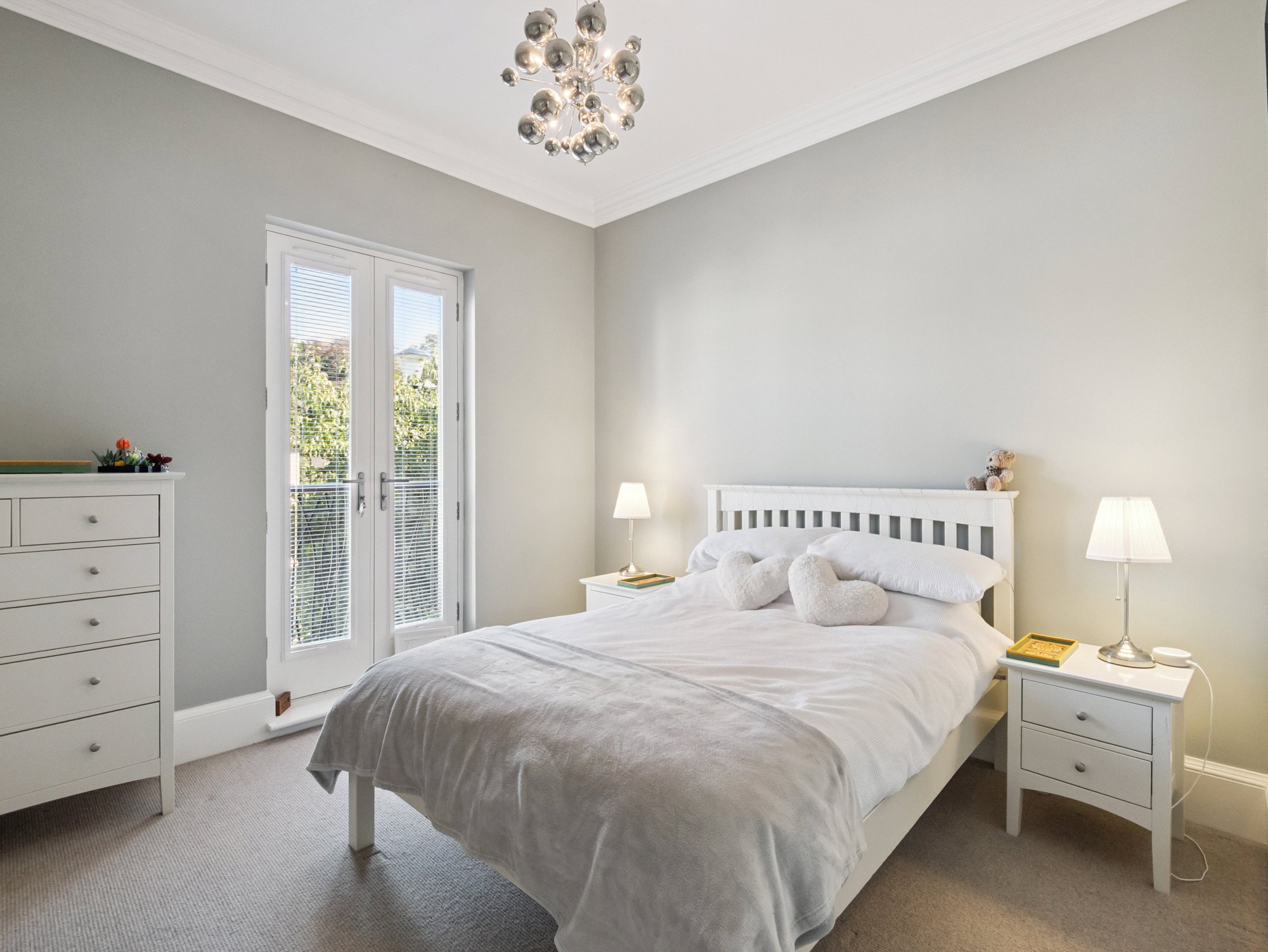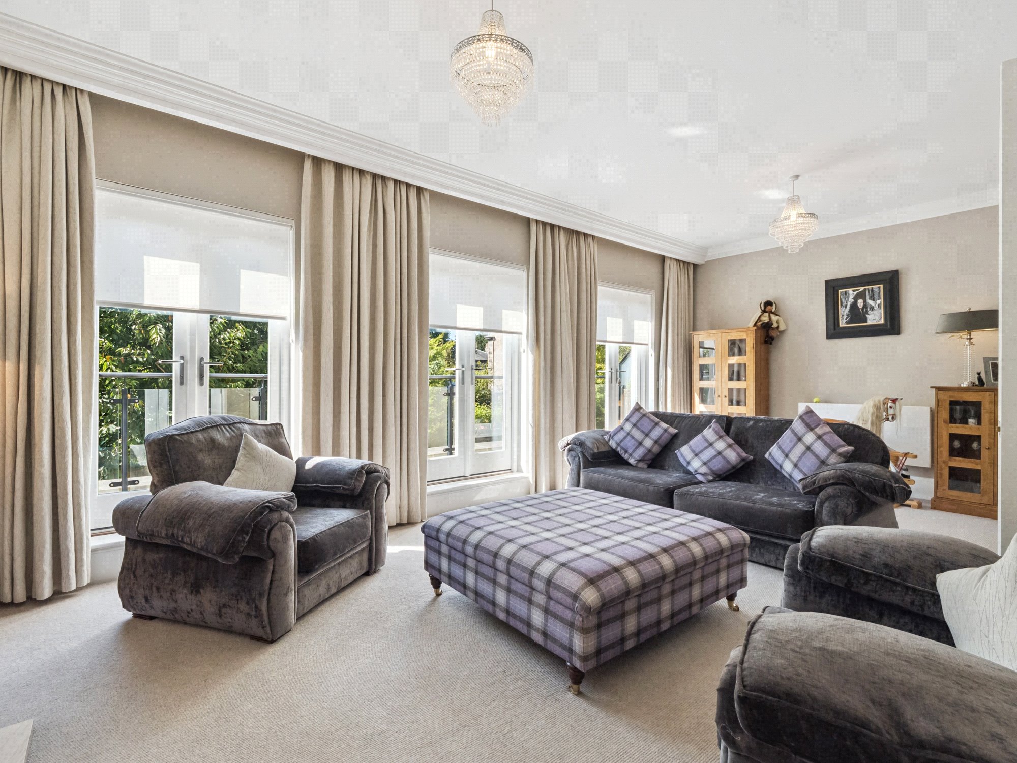 First floor – Landing with two cupboards; Beautiful spacious sitting room with living flame gas fire and three sets of doors leading out to the balcony; Double bedroom with dressing area and en-suite shower room; Additional double bedroom; WC.