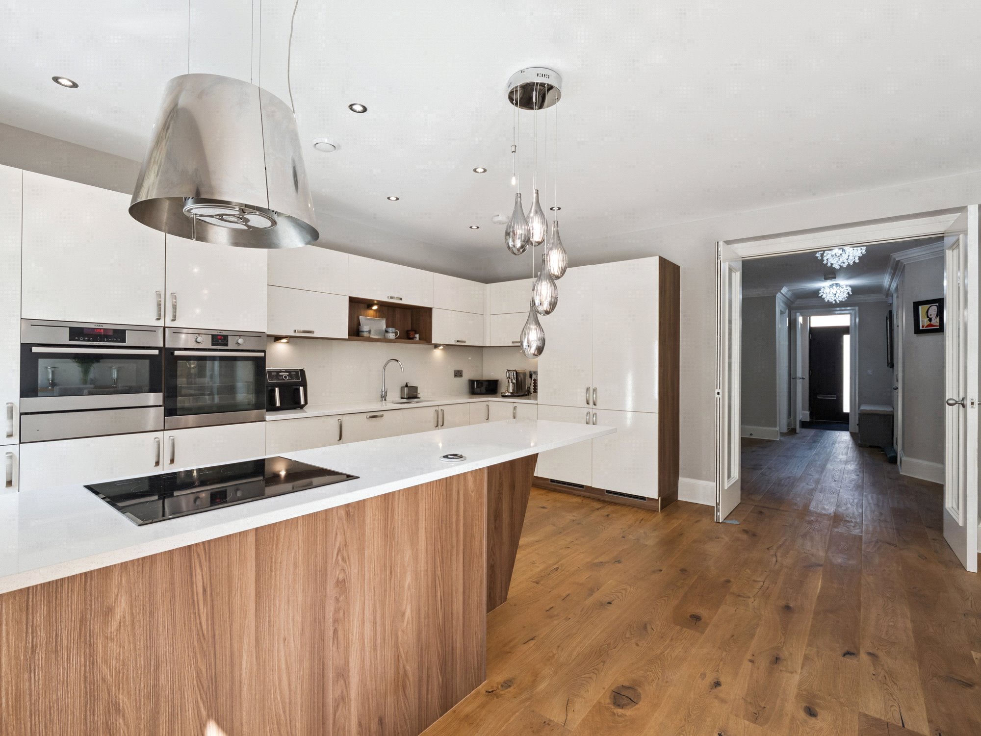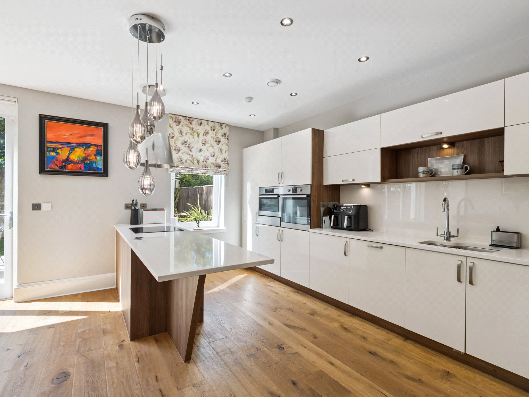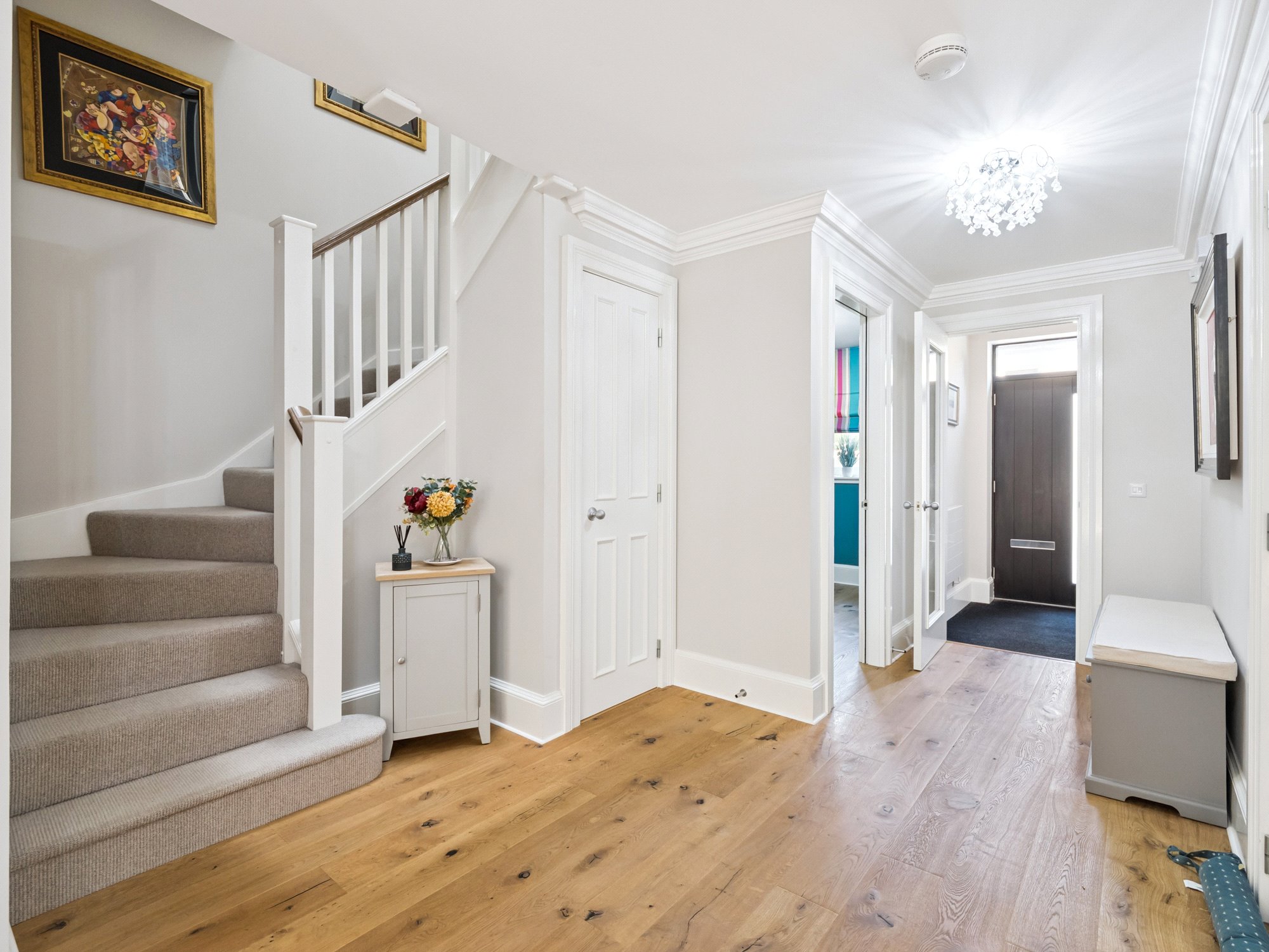 Ground floor – Entrance vestibule and welcoming hallway with under stair cupboard; Large open-plan dining kitchen with breakfasting island and direct garden access through French doors; Study/Bedroom 5; Utility room; Shower room; Integral garage with internal access, plus driveway parking.