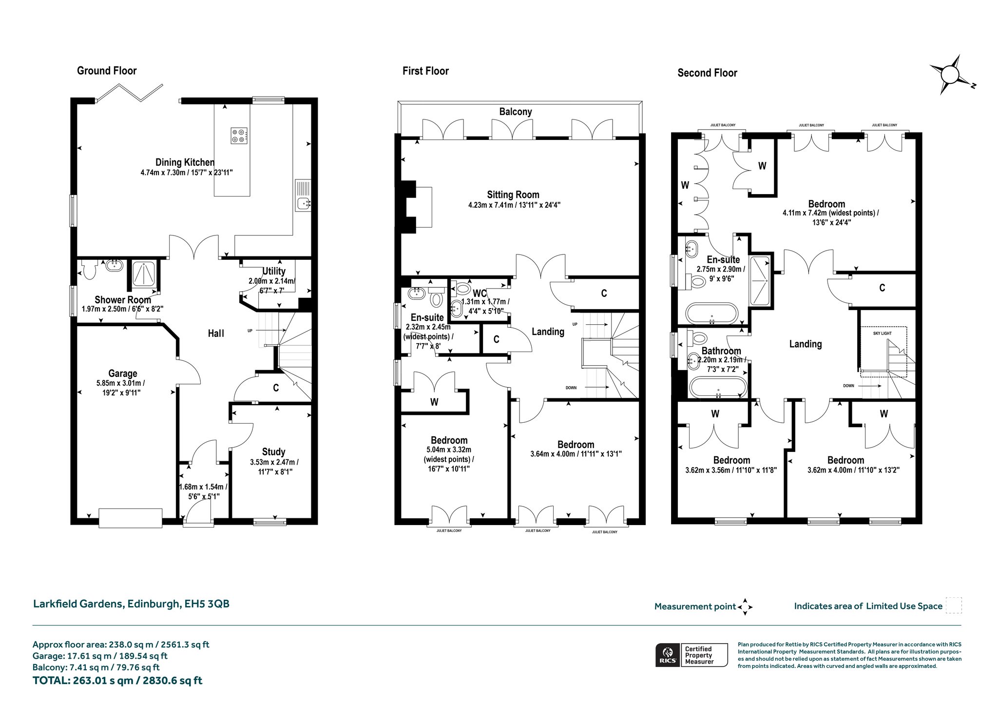 Second floor – Principal bedroom with dressing room, en-suite bathroom, and Juliet balcony; Two further double bedrooms; Family bathroom.