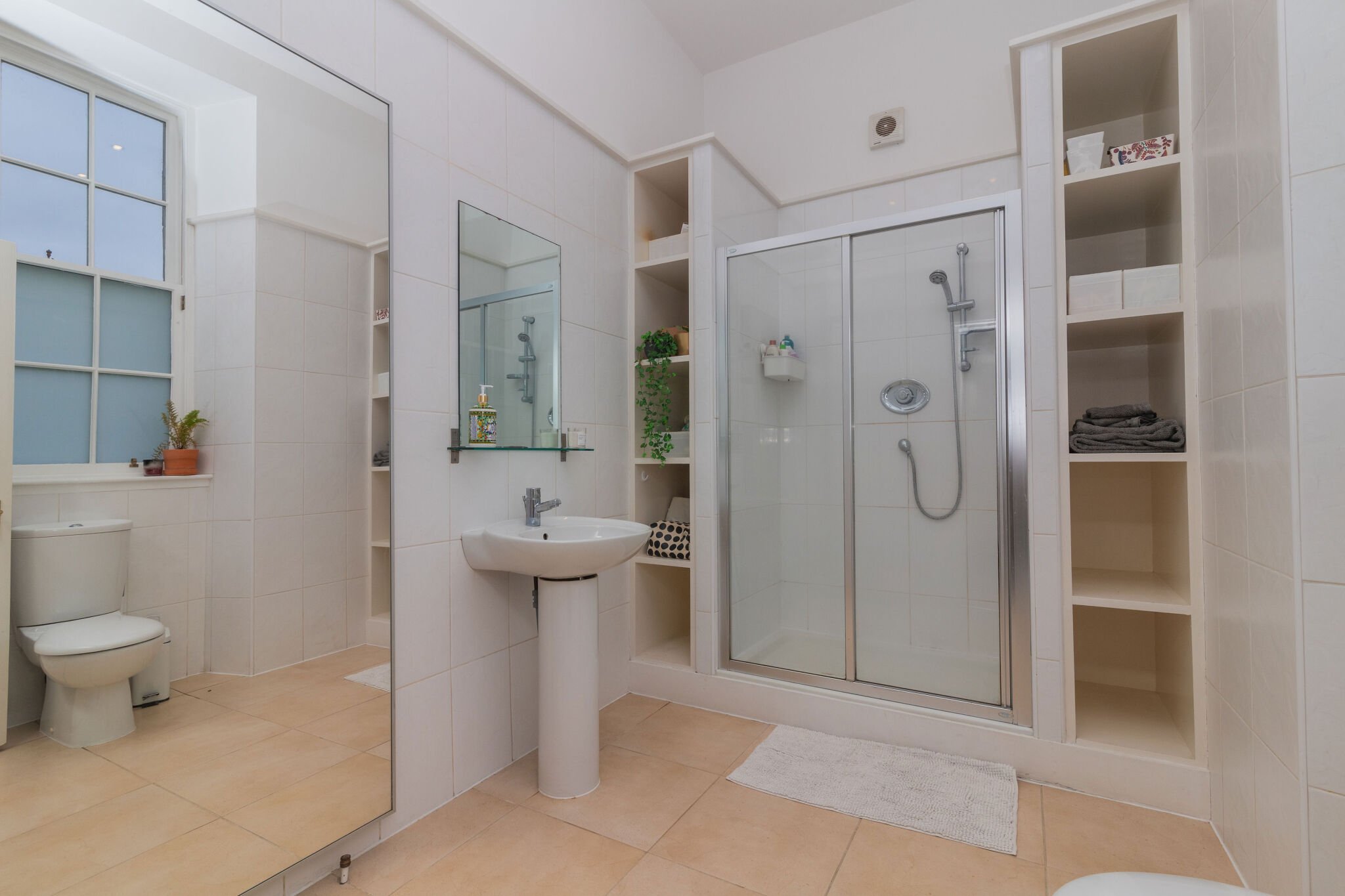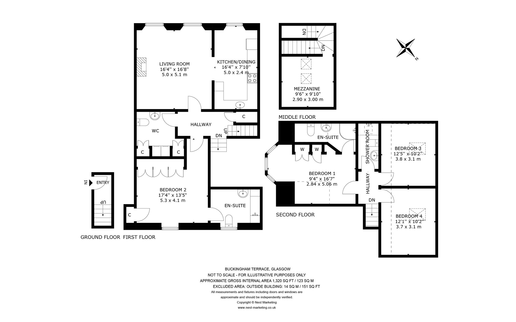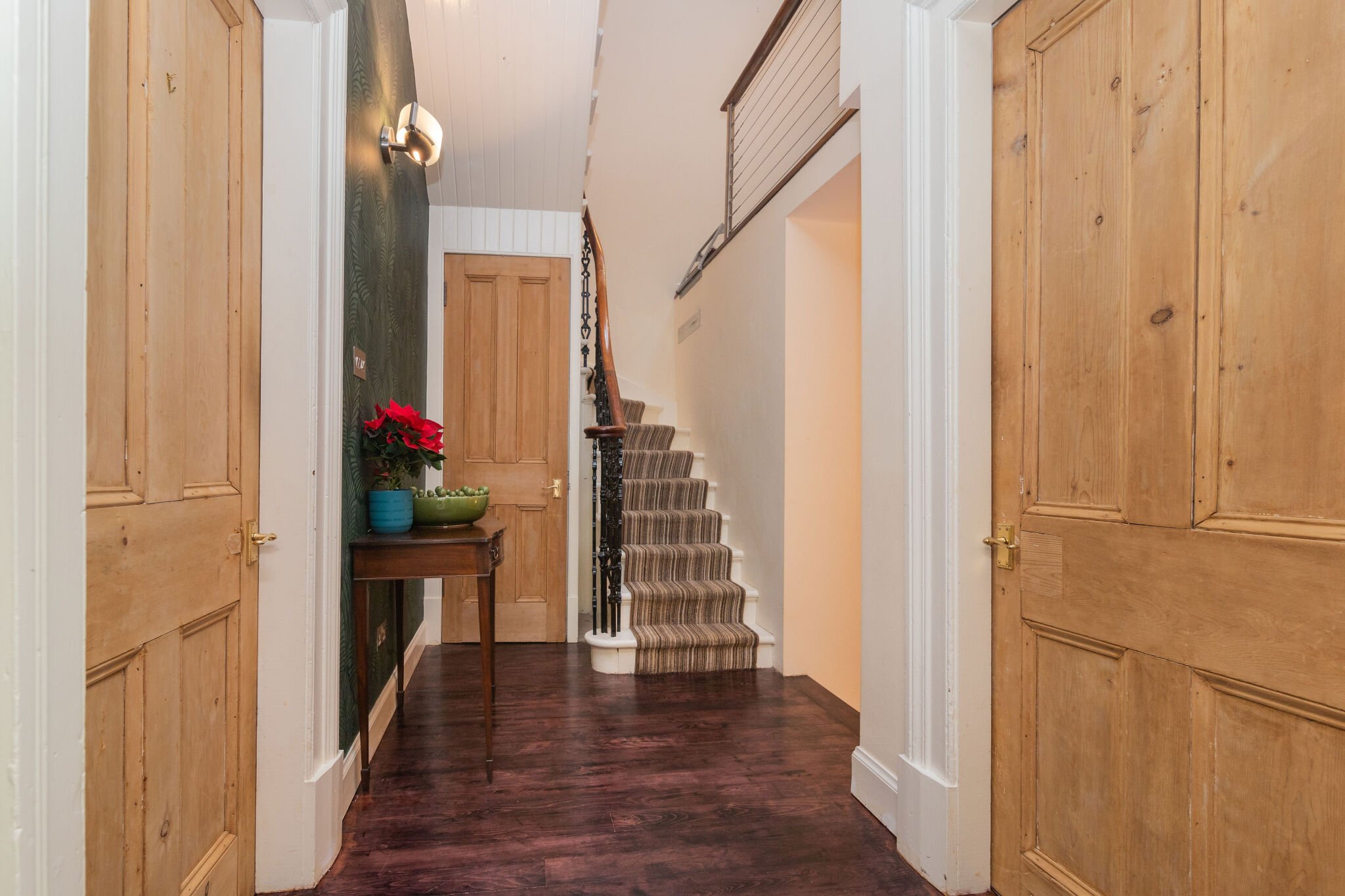 The apartment is accessed via a grand reception hall with original floor tiles and a sweeping staircase with wrought iron balustrade to the first floor. There is then a staircase that leads to the lower level accommodation. The floor plan shows there is a hallway that with access to a bright lounge with traditionally styled living flame gas fire and open views. There are double door that lead to a luxurious fitted kitchen with integrated appliances . In addition there is a large master bedroom with contemporary en-suite shower room. Lastly there is a three piece bathroom. A unique feature of the apartment is a mezzanine level bathed in light from velux windows above which is ideal for a home office. The upper floor includes three double bedrooms including the second bedroom with an en-suite shower room. There is a mixture of hardwood, carpeted and tiled flooring as well as gas central heating, low voltage lighting and some restored original details.