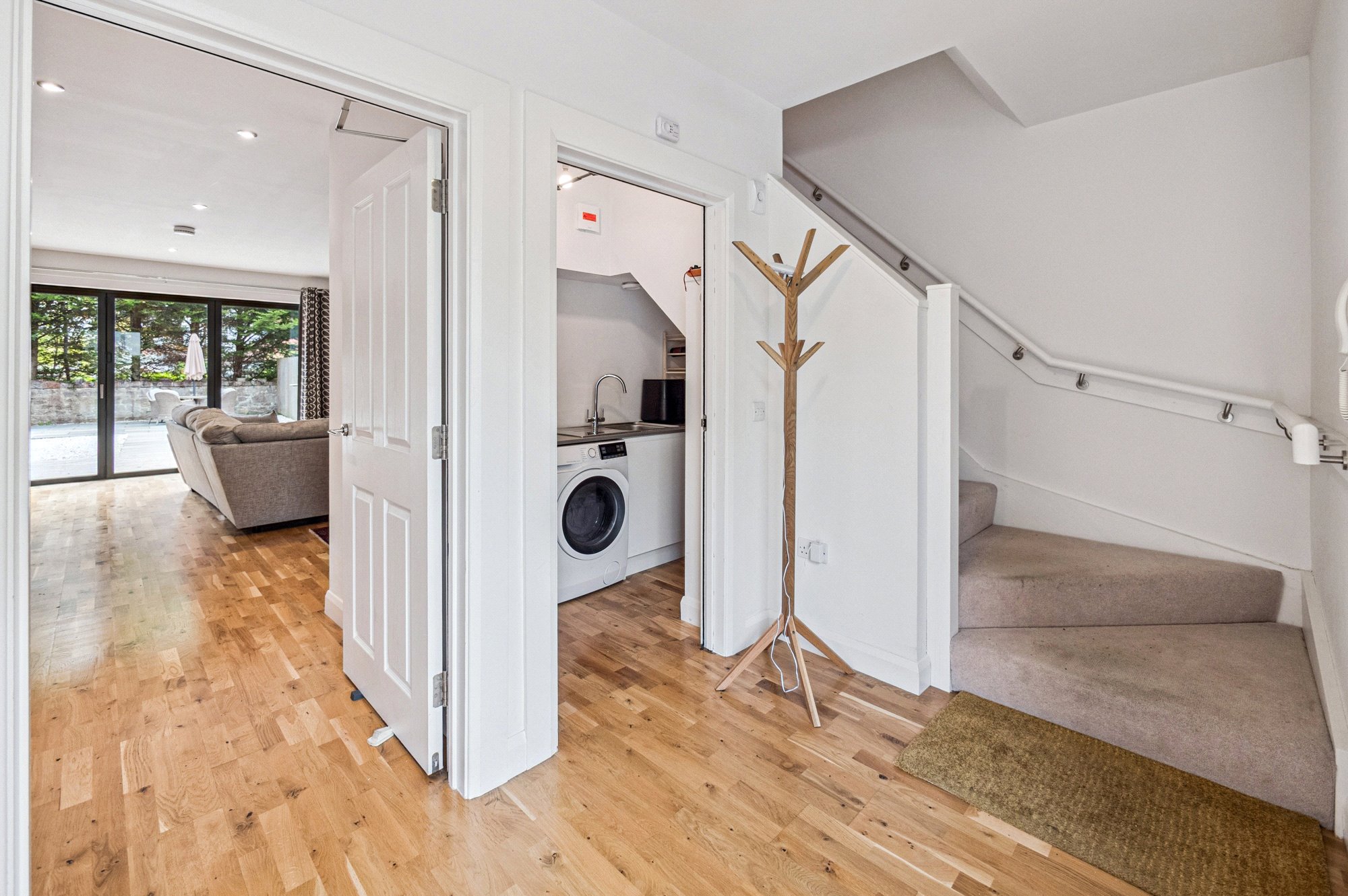 Welcoming entrance hall with accessible W.C. and utility room / large storage cupboard with plumbing; Magnificent open-plan living area, accommodating a sleek modern kitchen with breakfast bar and integrated appliances, dining space and relaxing lounge. Triple bi-fold doors allows seamless access to the private rear garden and patio.