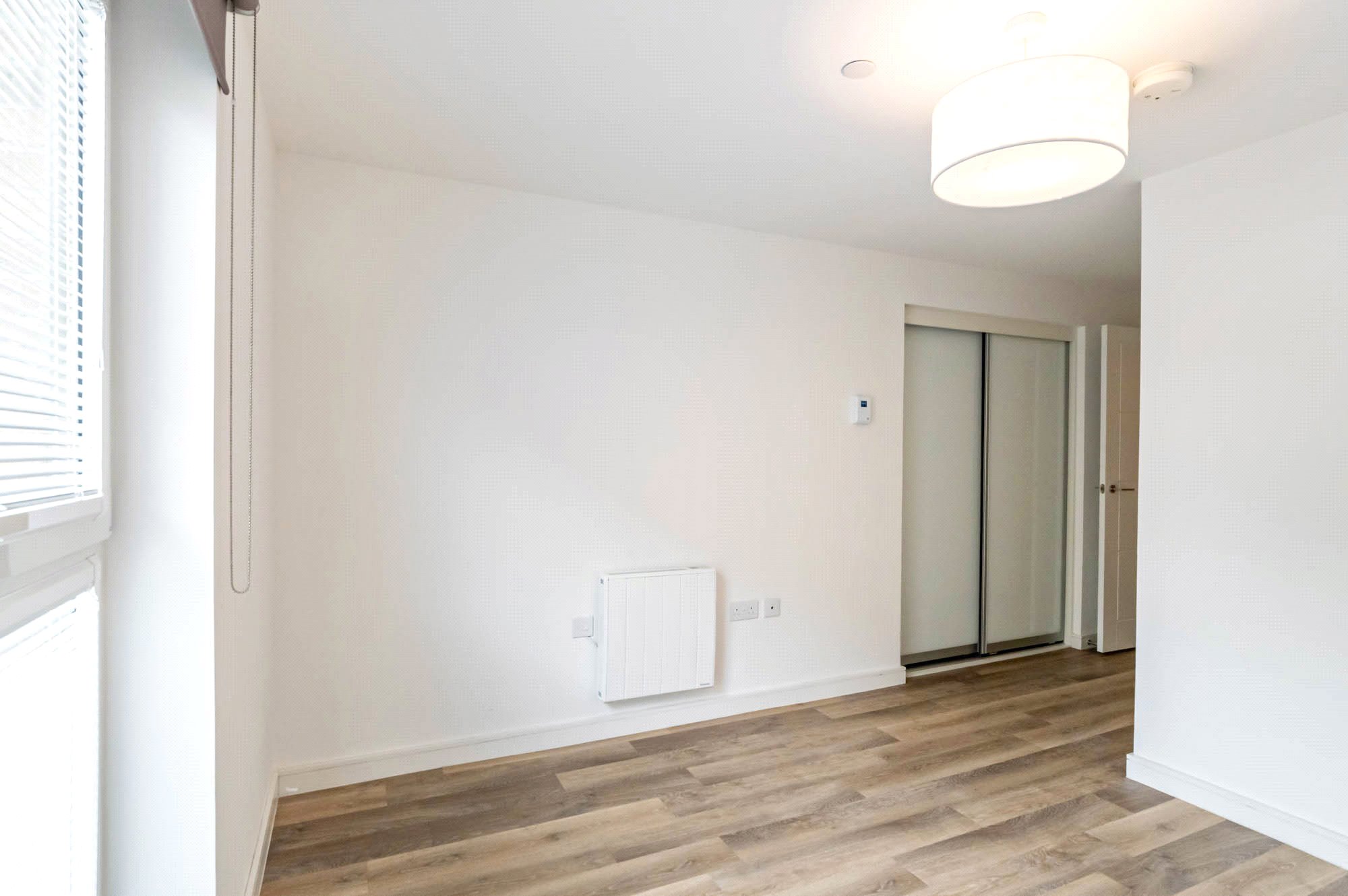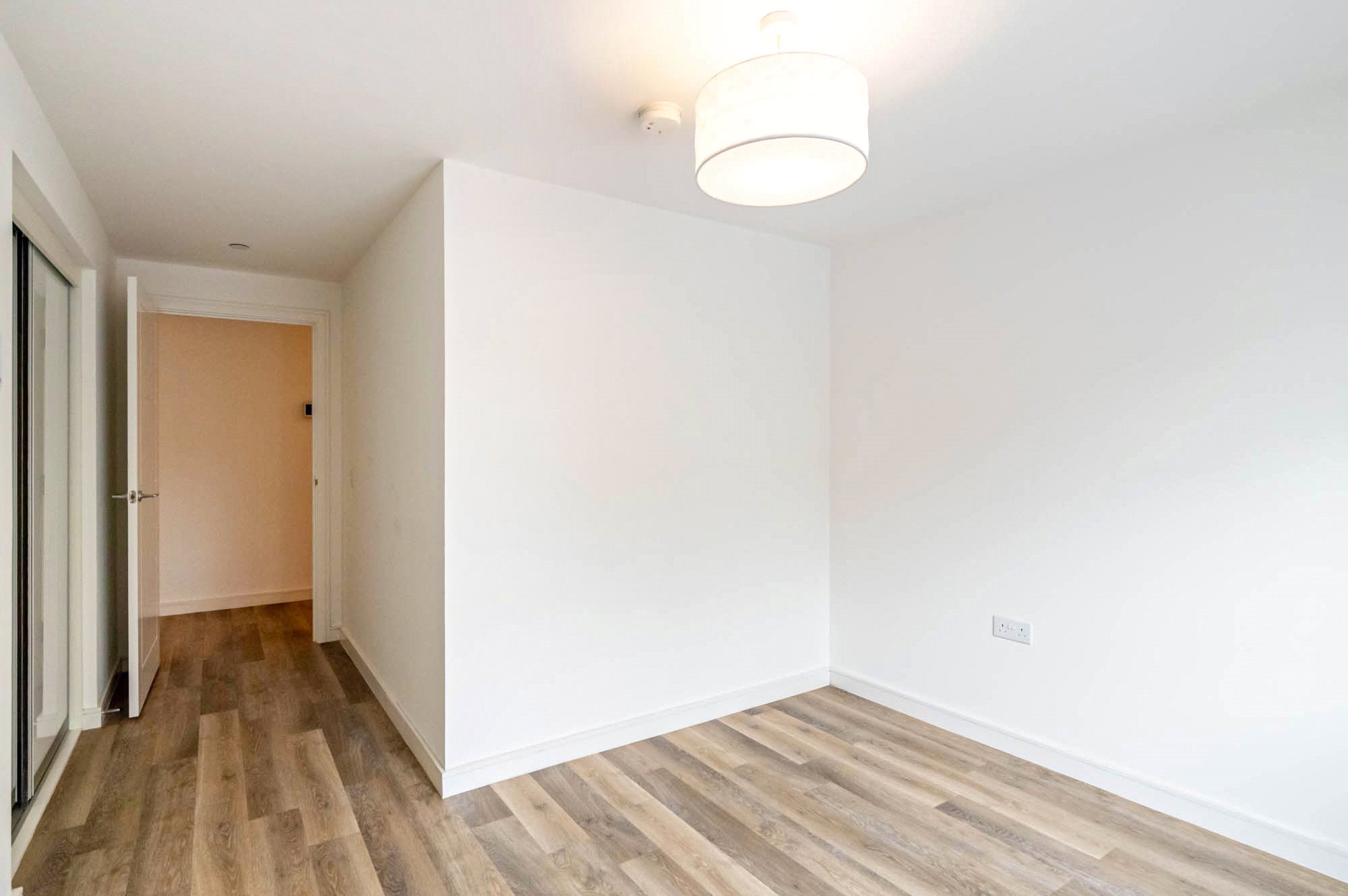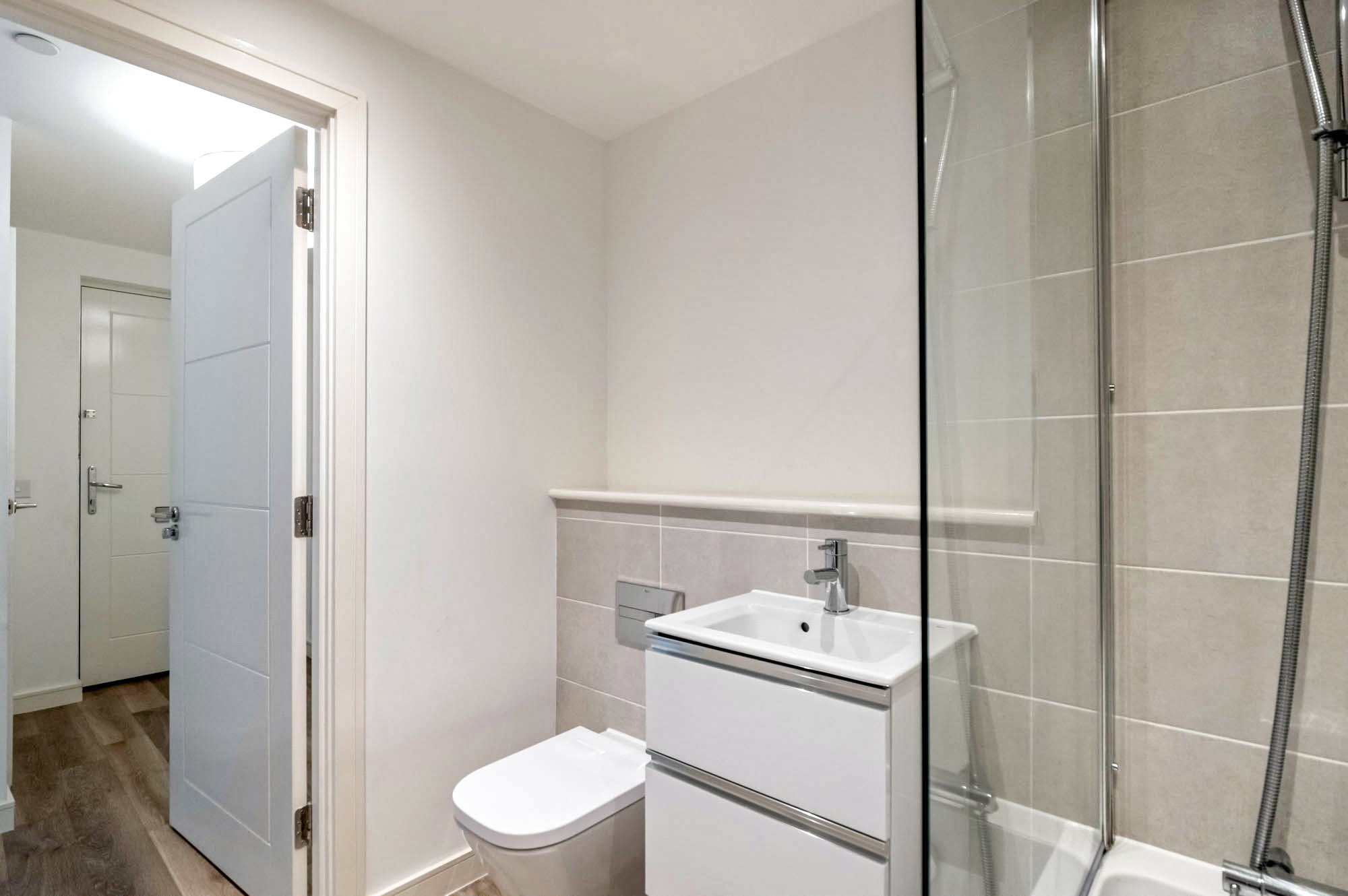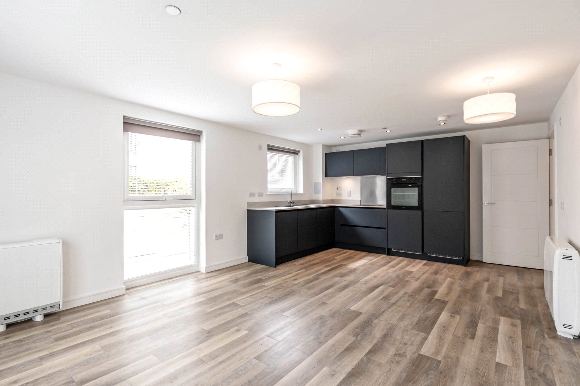 Entrance hallway with two storage cupboards; Spacious open-plan living space with kitchen and ample space for separate seating and dining, opening on to a private terrace; Two bright double bedrooms, one with fitted wardrobes; a well-appointed bathroom with shower above bath, sink, WC and heated towel rail.