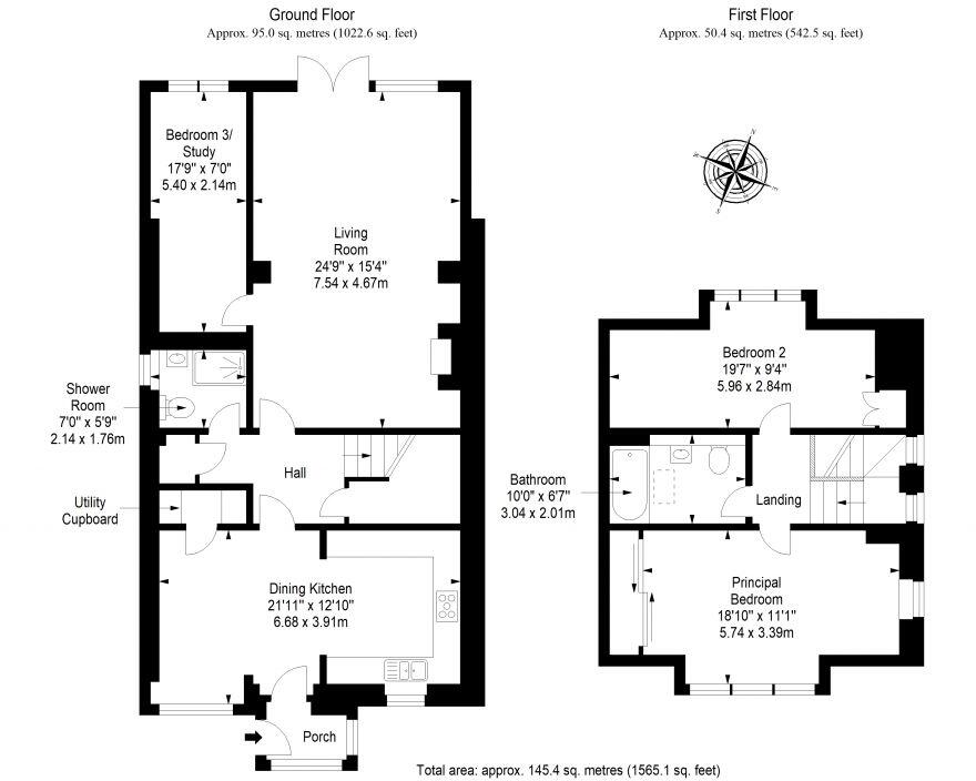 Ground Floor - Entrance porch leading directly into the open-plan dining kitchen, creating a bright and sociable heart to the home; Living room with French doors opening onto the garden; Bedroom 3/study situated off the living room; Shower room; Hall with storage cupboard and large under-stair cupboard; Stairs to first floor.