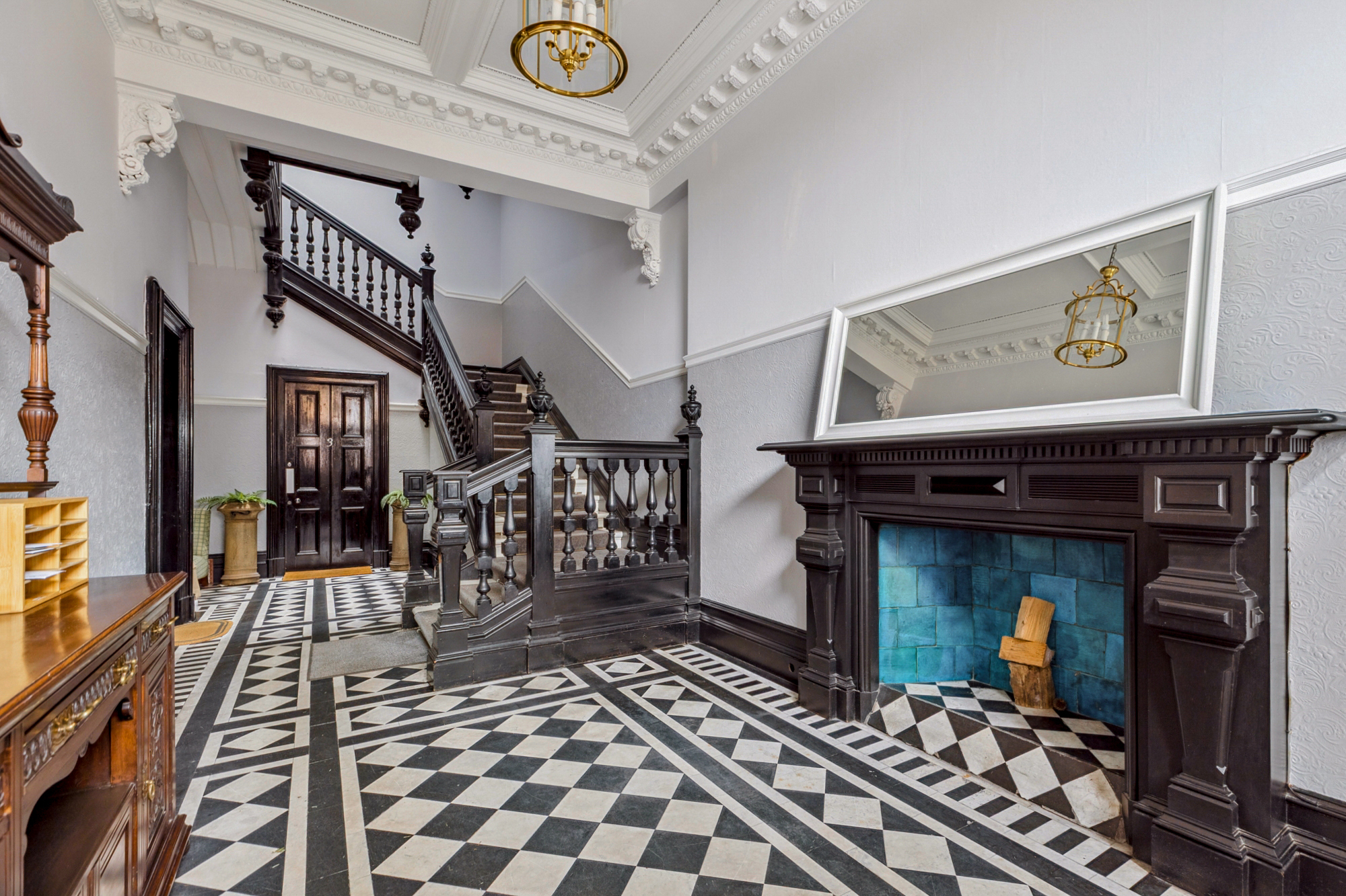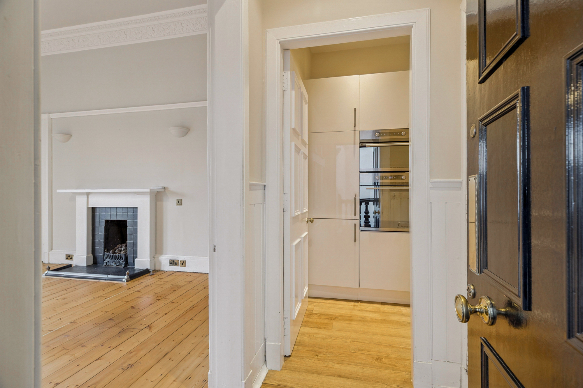 The property forms part of a handsome townhouse that has been thoughtfully subdivided into eight individual dwellings. Entry is via a secure door with intercom system, and the shared hall and stairway are in excellent order, showcasing original period features enhanced by bright contemporary décor. The home itself is positioned on the second floor, accessed via the left-hand door from the upper landing.