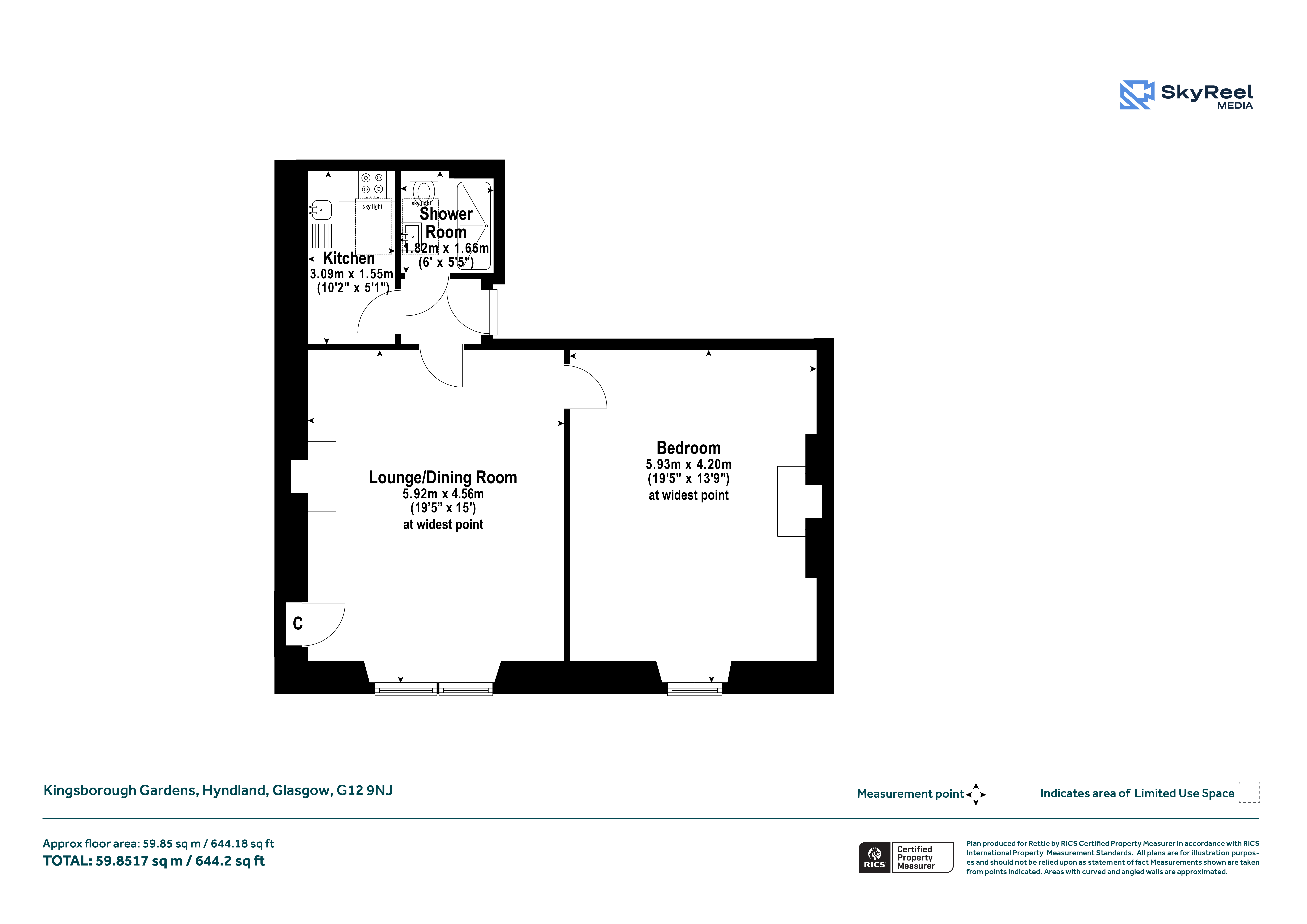 Internally, the accommodation offers bright and comfortable proportions. The impressive West-facing windows ensure superb natural light, particularly in the afternoon and evening. In brief, the layout comprises: welcoming entrance hall, a broad living room with feature fireplace and space for dining by the window, a generous king-sized bedroom with ample room for a desk or home working area, and a fitted bank of wardrobes to one side. The kitchen is a neat galley-style with wall and base mounted units, worktop space, and a range of integrated appliances including an oven, hob, extractor and fridge/freezer. Completing the layout is a well-presented shower room with a white suite.