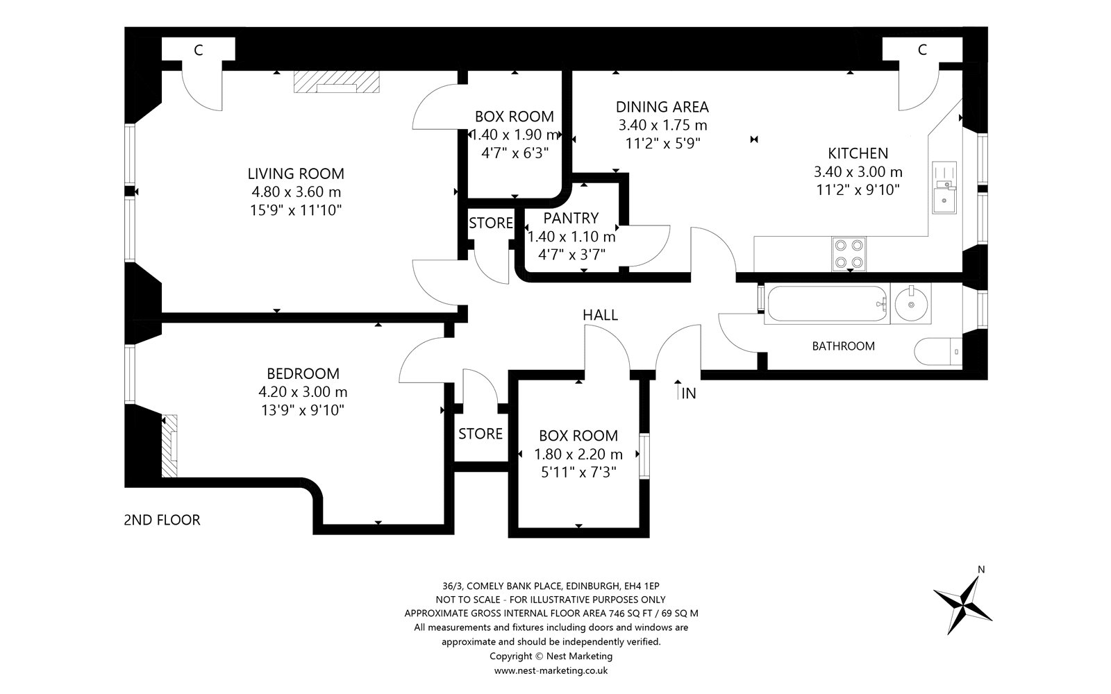 The accommodation comprises: hallway, large double bedroom, living room with box room off, further box room set up as a study, bathroom with shower over bath, large dining kitchen with pantry.