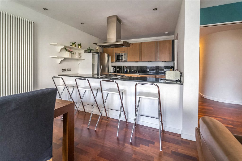 Bright and spacious living/dining/kitchen with high windows allowing plenty of light to flood in; Modern and well fitted kitchen complimented with high and low cabinets offering plenty storage, quality fixtures and fittings with a dishwasher and washer/dryer, and breakfast bar with high stools; Two spacious double bedrooms, both with fitted wardrobes; The larger bedroom benefits from a en-suite shower room and there is a further family bathroom; There is a secure underground allocated parking space, lift access, concierge service and well-maintained shared grounds. The development is factored and maintained by Trinity Factors.