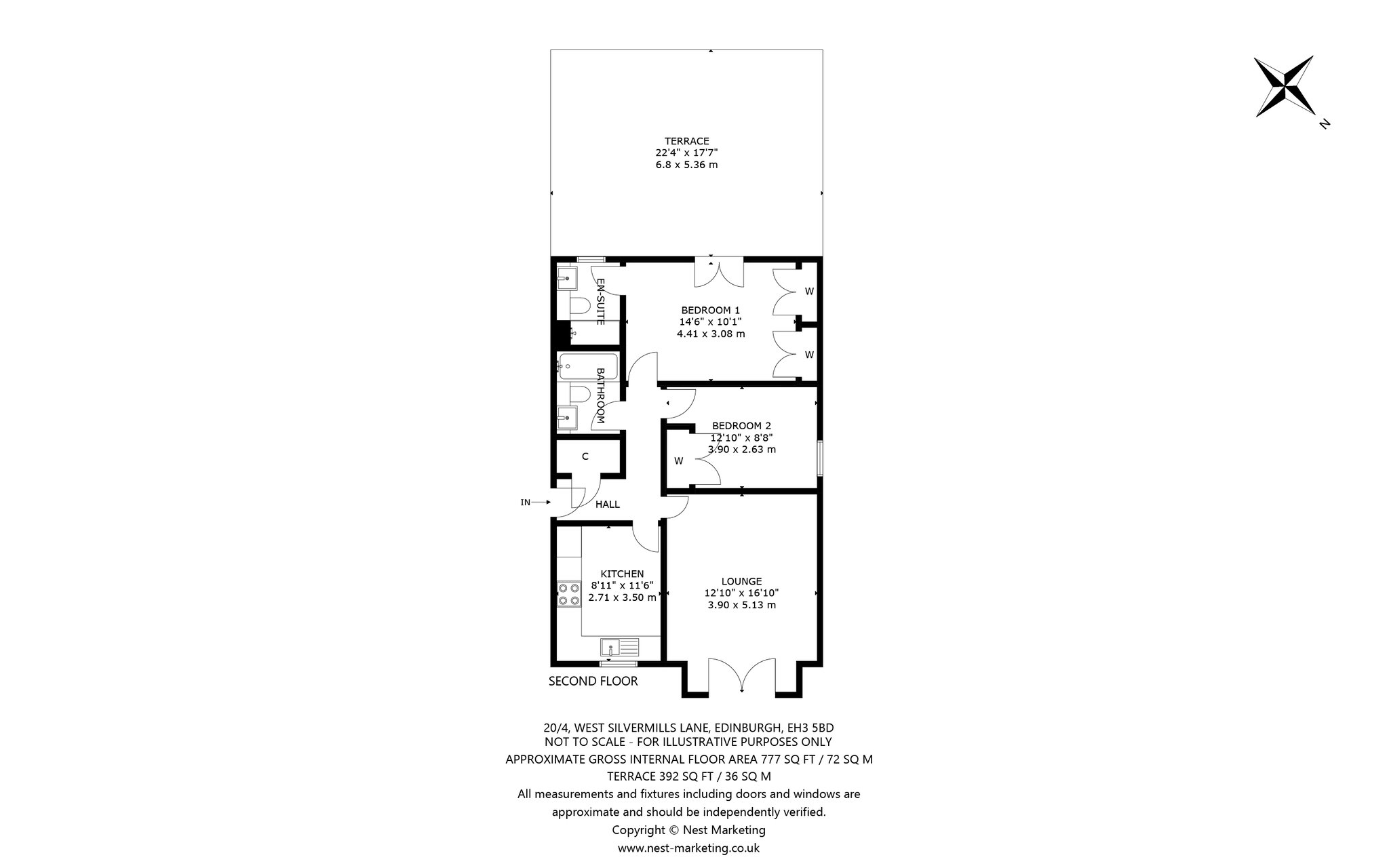 Entrance hall with storage cupboard; Spacious and bright living room with Juliet balcony; Functional and modern kitchen with ample high and low white gloss units unit, integrated appliances (including washer / dryer) and room for dining table and chairs; Principal bedroom benefits from double fitted mirrored wardrobes and modern tiled shower room. Leading off the principal bedroom is the large private roof terrace, around 36 sqm, the perfect secluded spot to enjoy some outdoor space; Further double bedroom with fitted mirrored wardrobes; Family bathroom with shower over bath; This property has GCH and offers underground secure parking, a real bonus in the central Edinburgh, and a bike store.