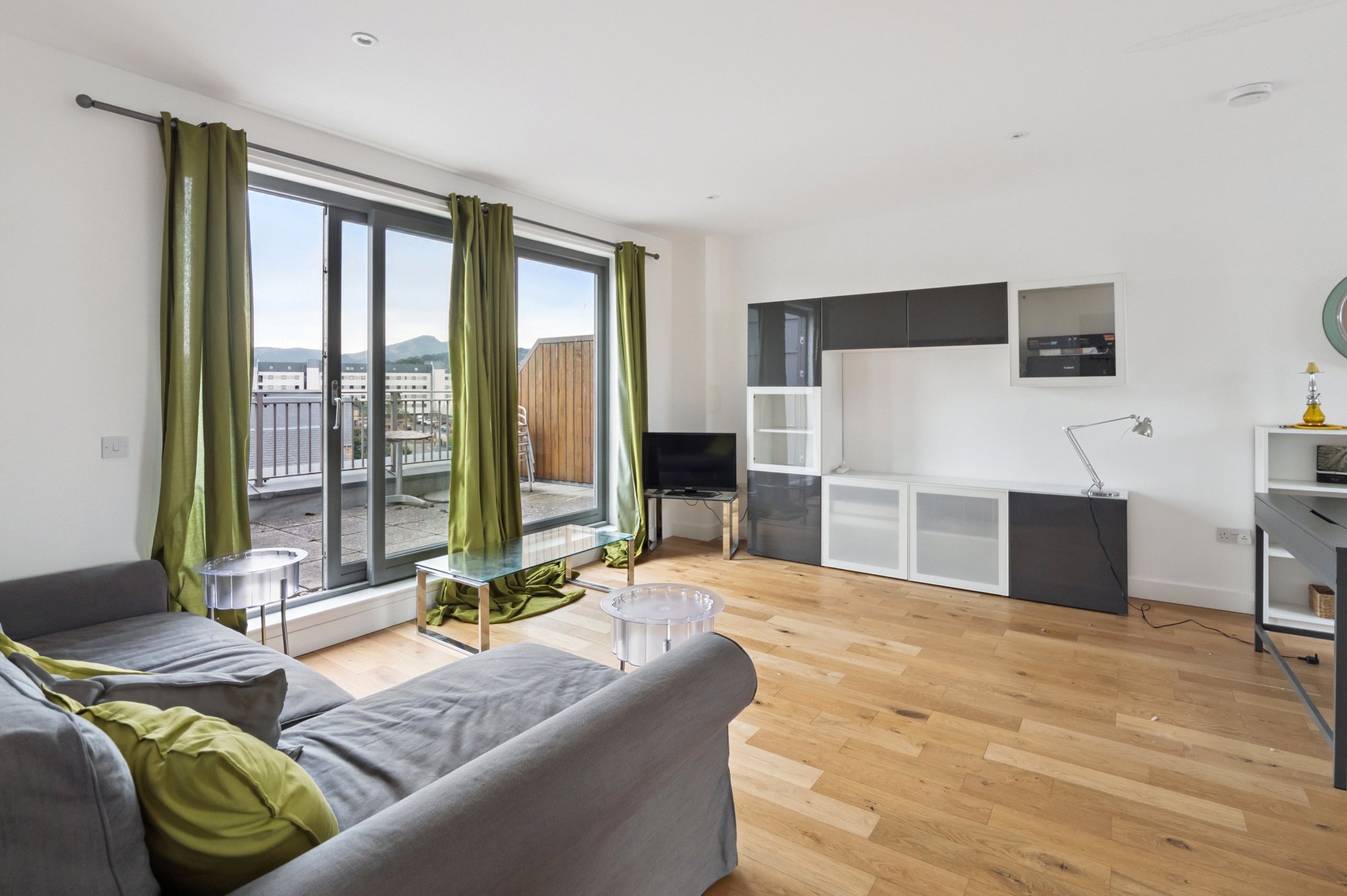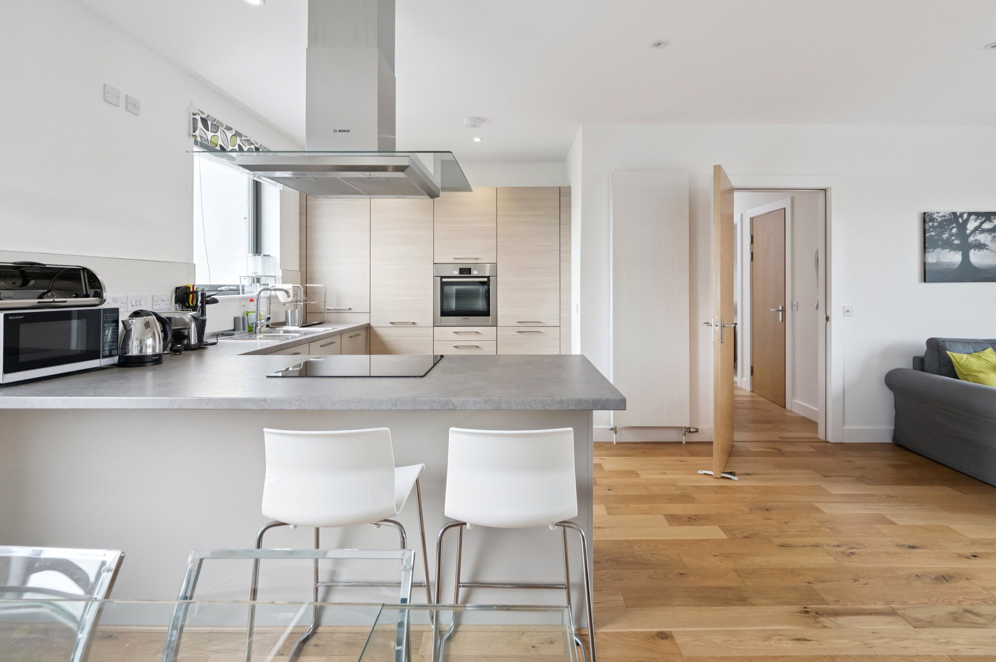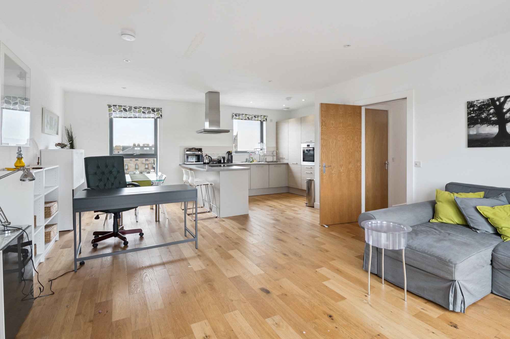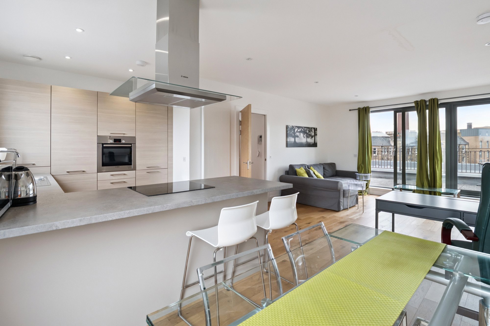 Entrance hall with storage cupboards; Open plan kitchen / living / dining space offering bright and modern flexible living. Contemporary kitchen with integrated appliances and balcony with gorgeous views all the way to Calton Hill; Two double bedrooms, both with fitted wardrobes and one benefitting from ensuite shower room; Family bathroom with shower over bath.