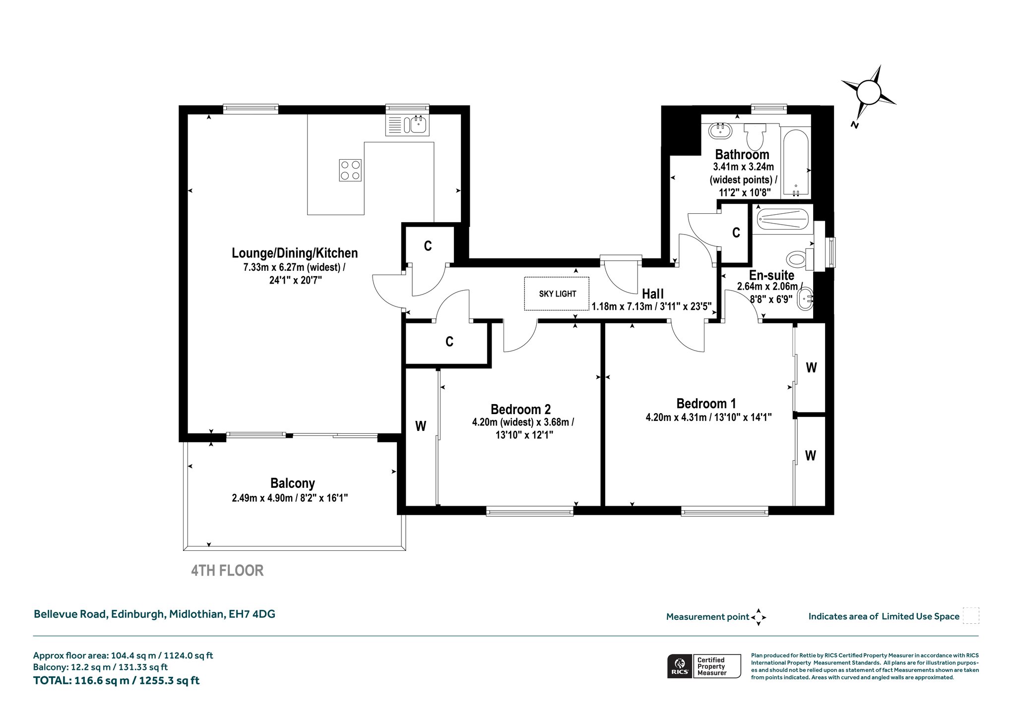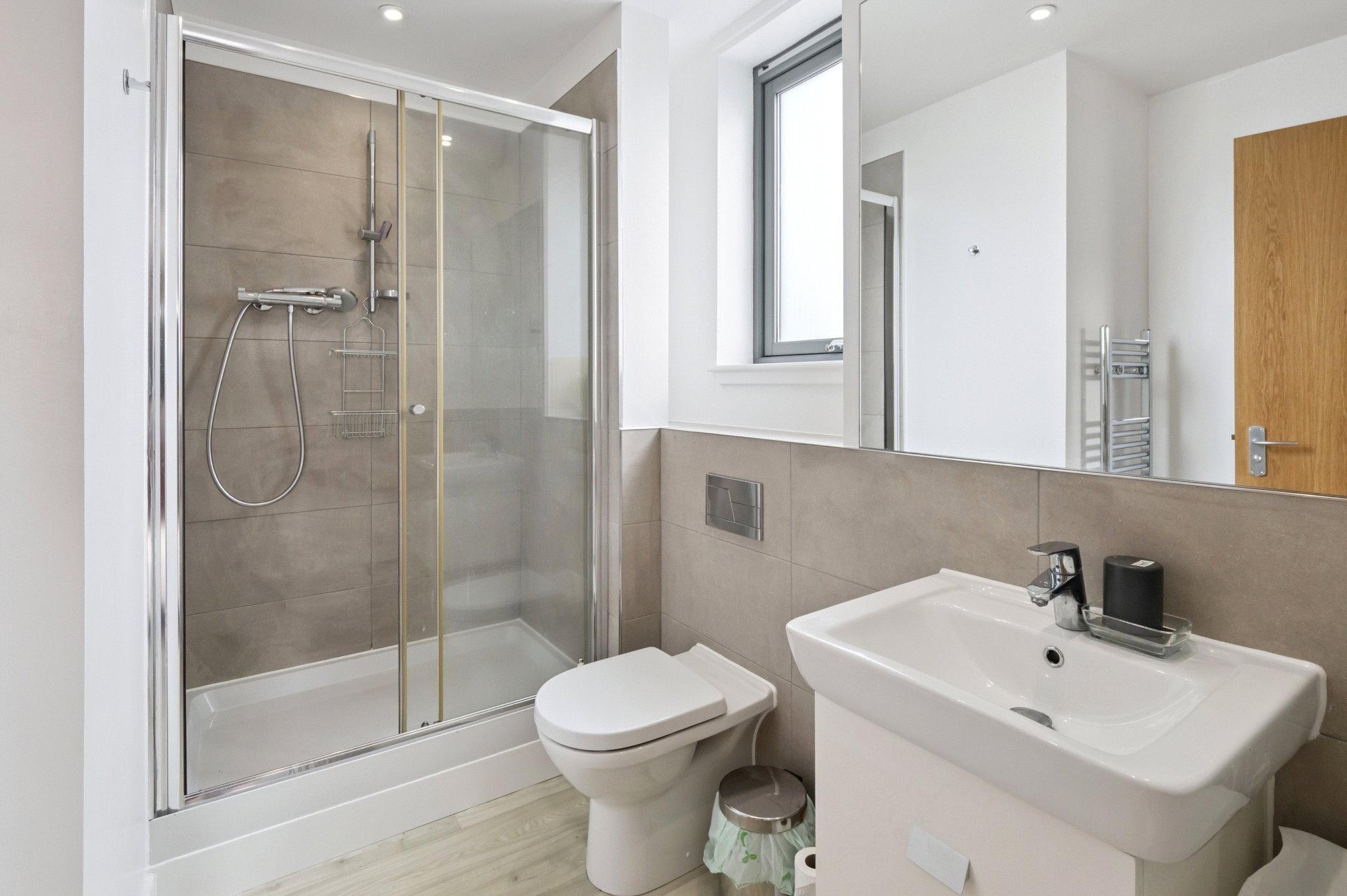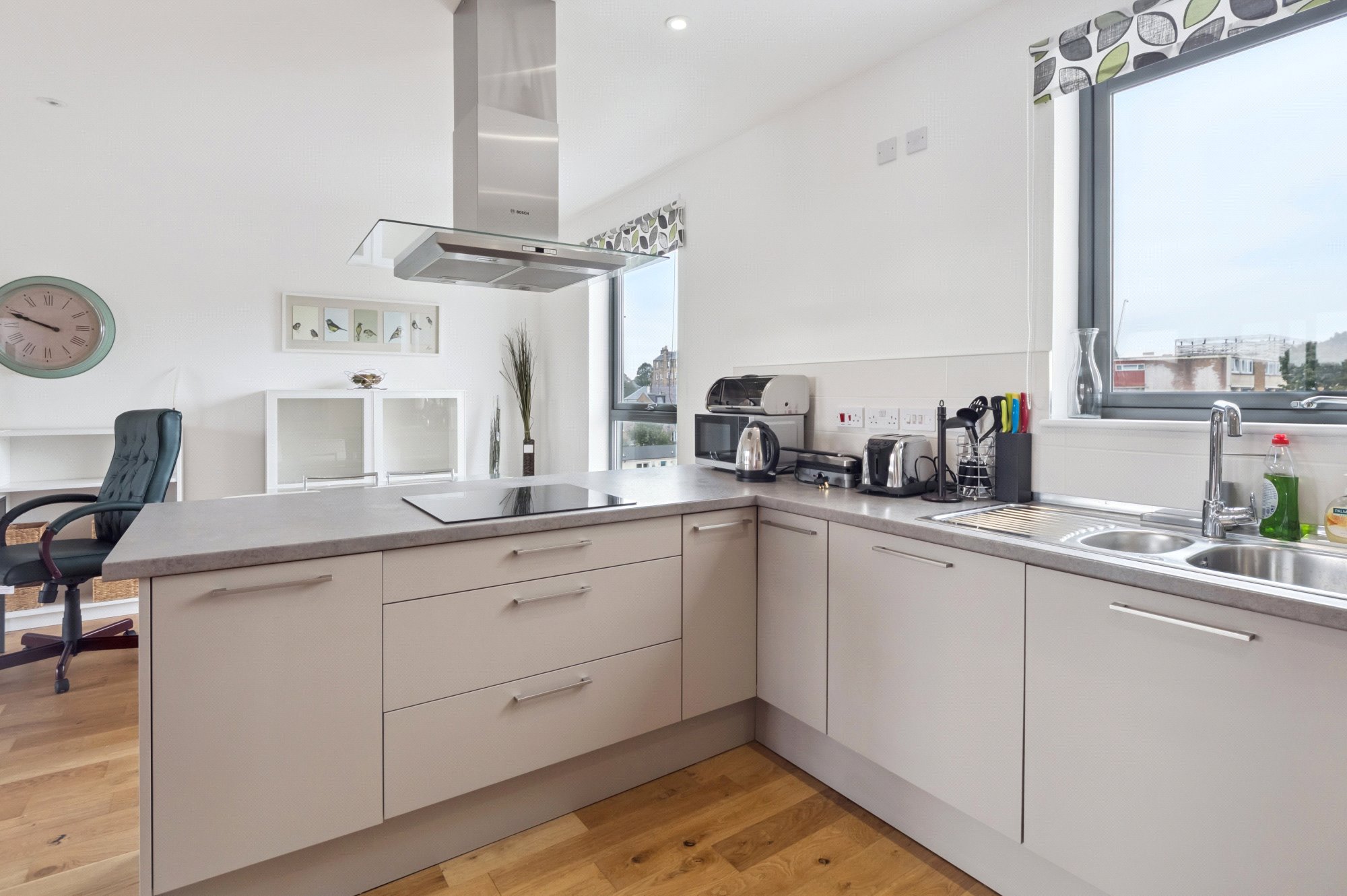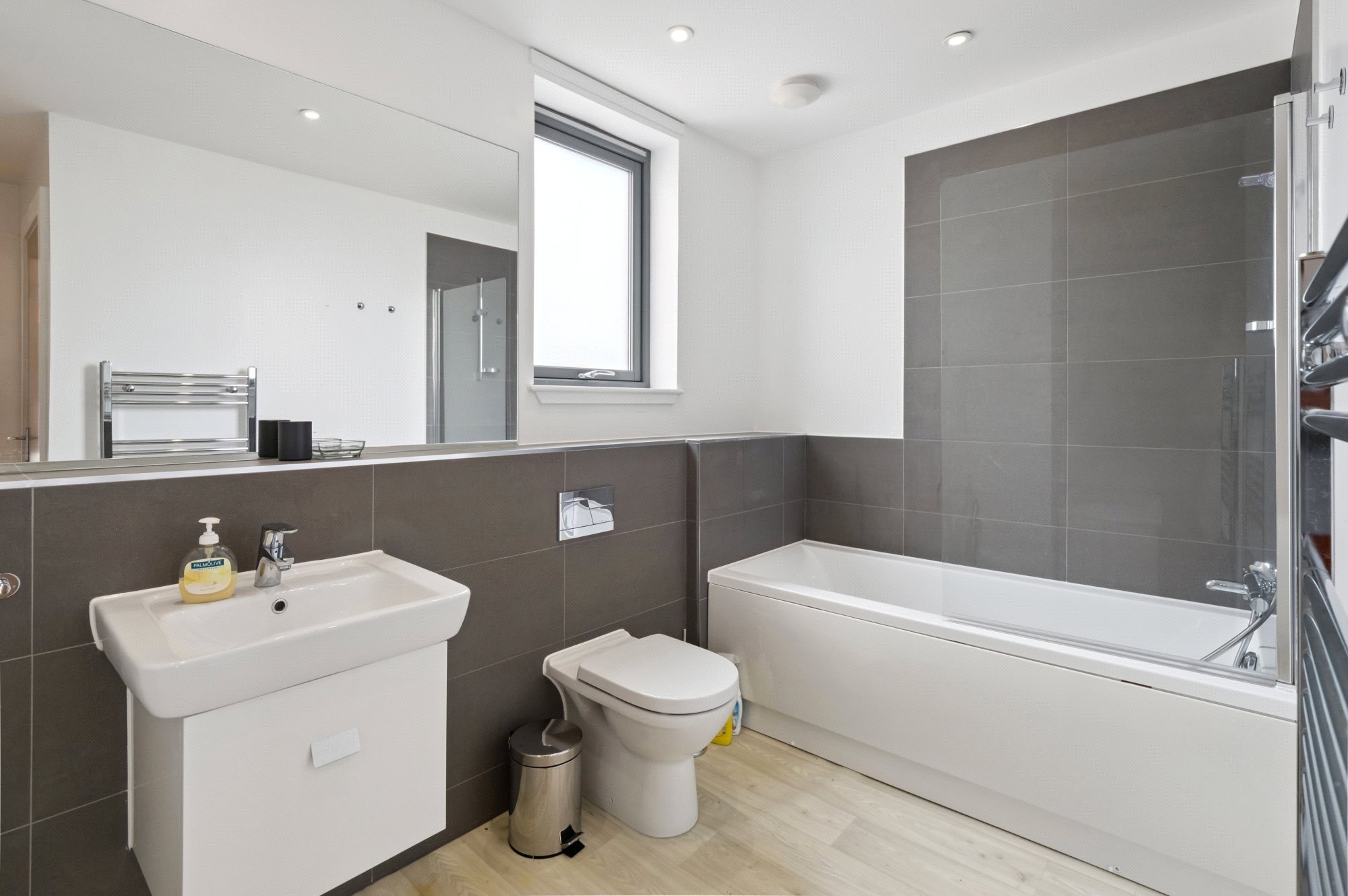 Entrance hall with storage cupboards; Open plan kitchen / living / dining space offering bright and modern flexible living. Contemporary kitchen with integrated appliances and balcony with gorgeous views all the way to Calton Hill; Two double bedrooms, both with fitted wardrobes and one benefitting from ensuite shower room; Family bathroom with shower over bath.