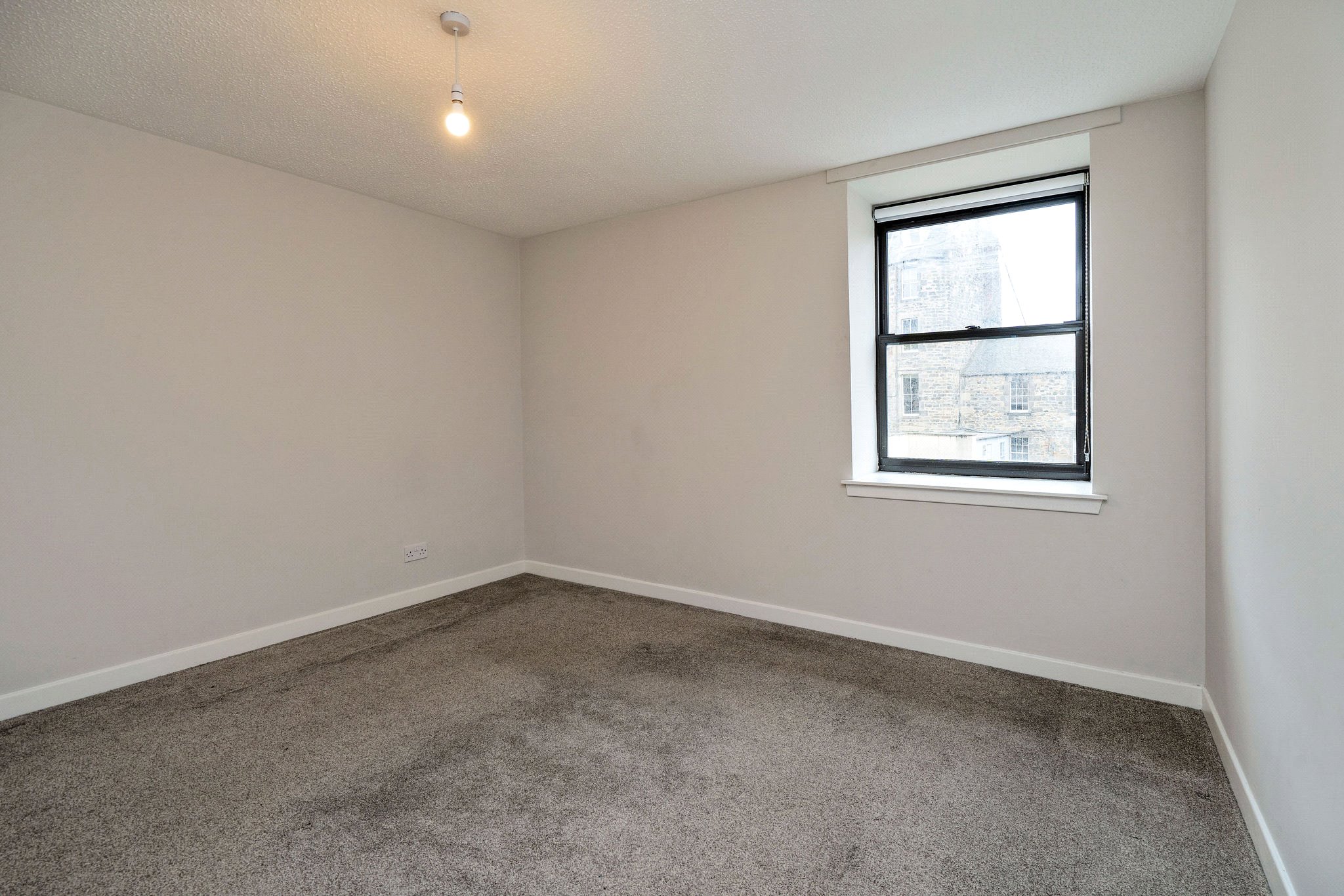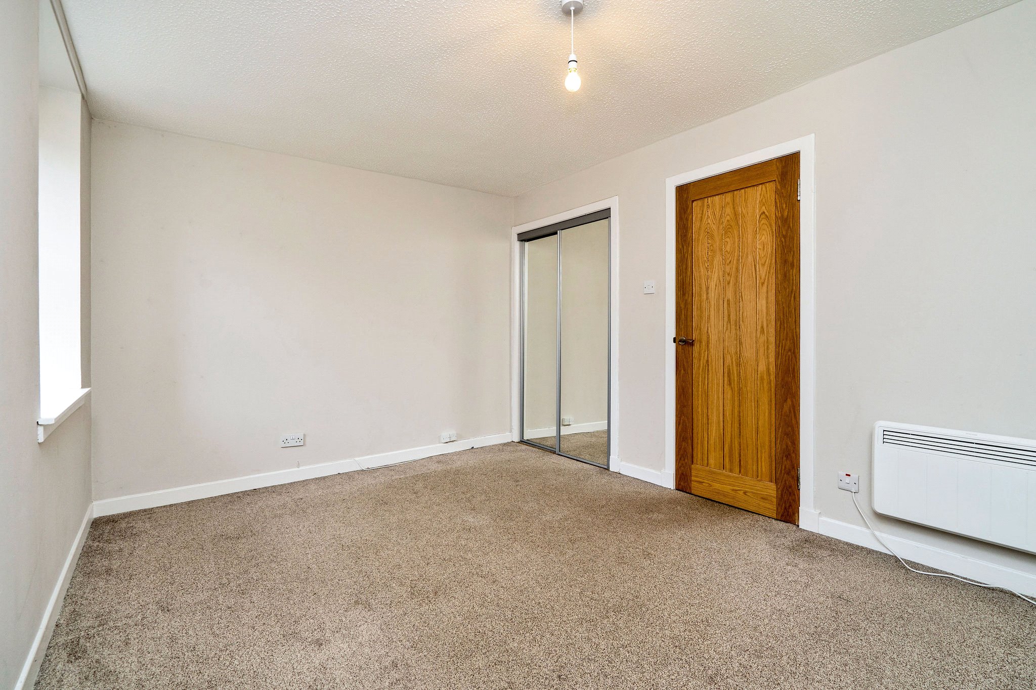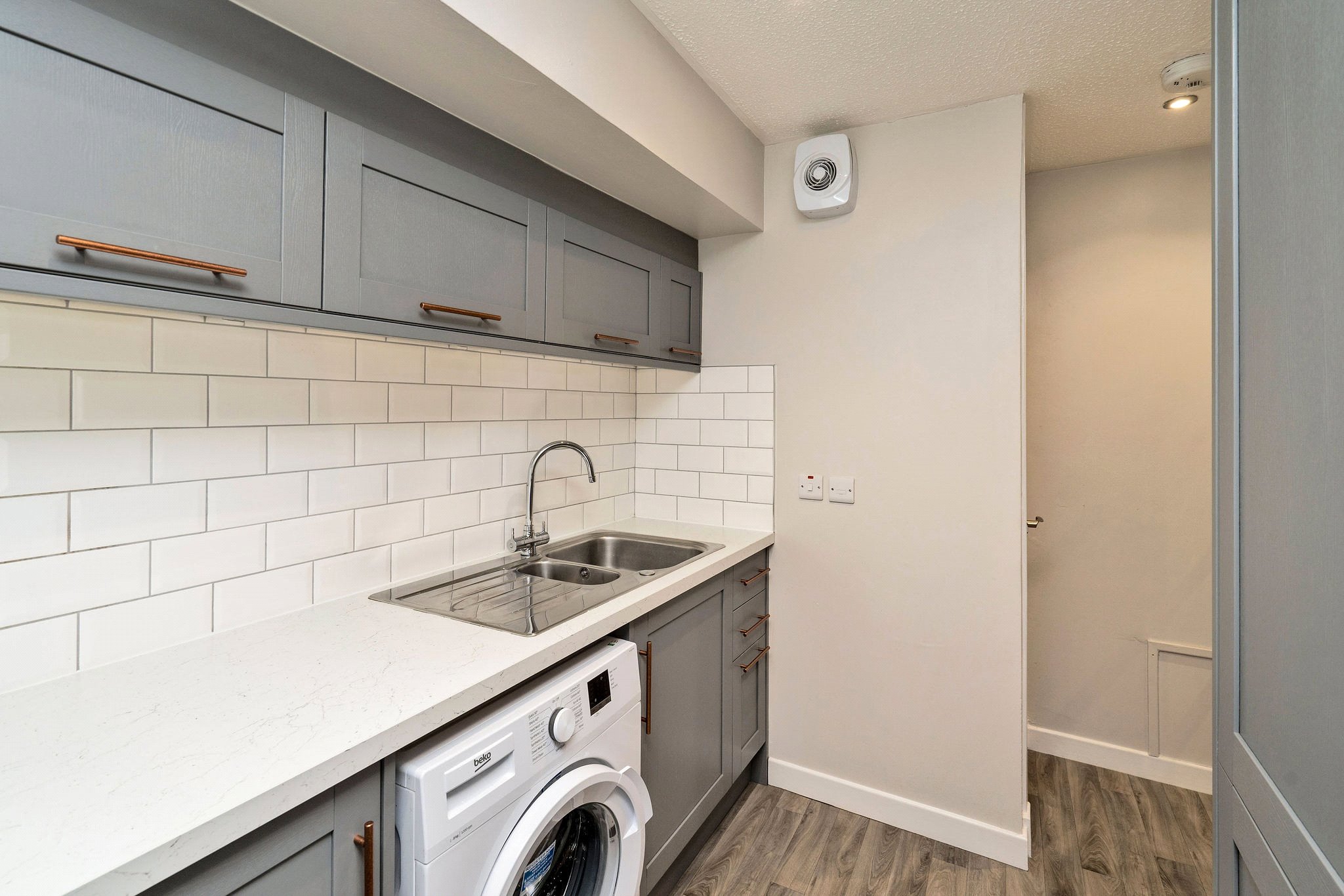 The accommodation comprises a welcoming hallway leading to a modern bathroom with shower over the bath. The spacious living room provides ample room for dining, and is complemented by a separate kitchen to the rear featuring modern grey units with stylish copper handles. Further along the hallway, you’ll find two double bedrooms, both benefiting from fitted wardrobes. Additional storage space is available with 2 cupboards, and the property is equipped with electric central heating (ECH) and DG. It is quietly situated to the rear of the building with a quiet outlook over the carpark and Constitution Street buildings.