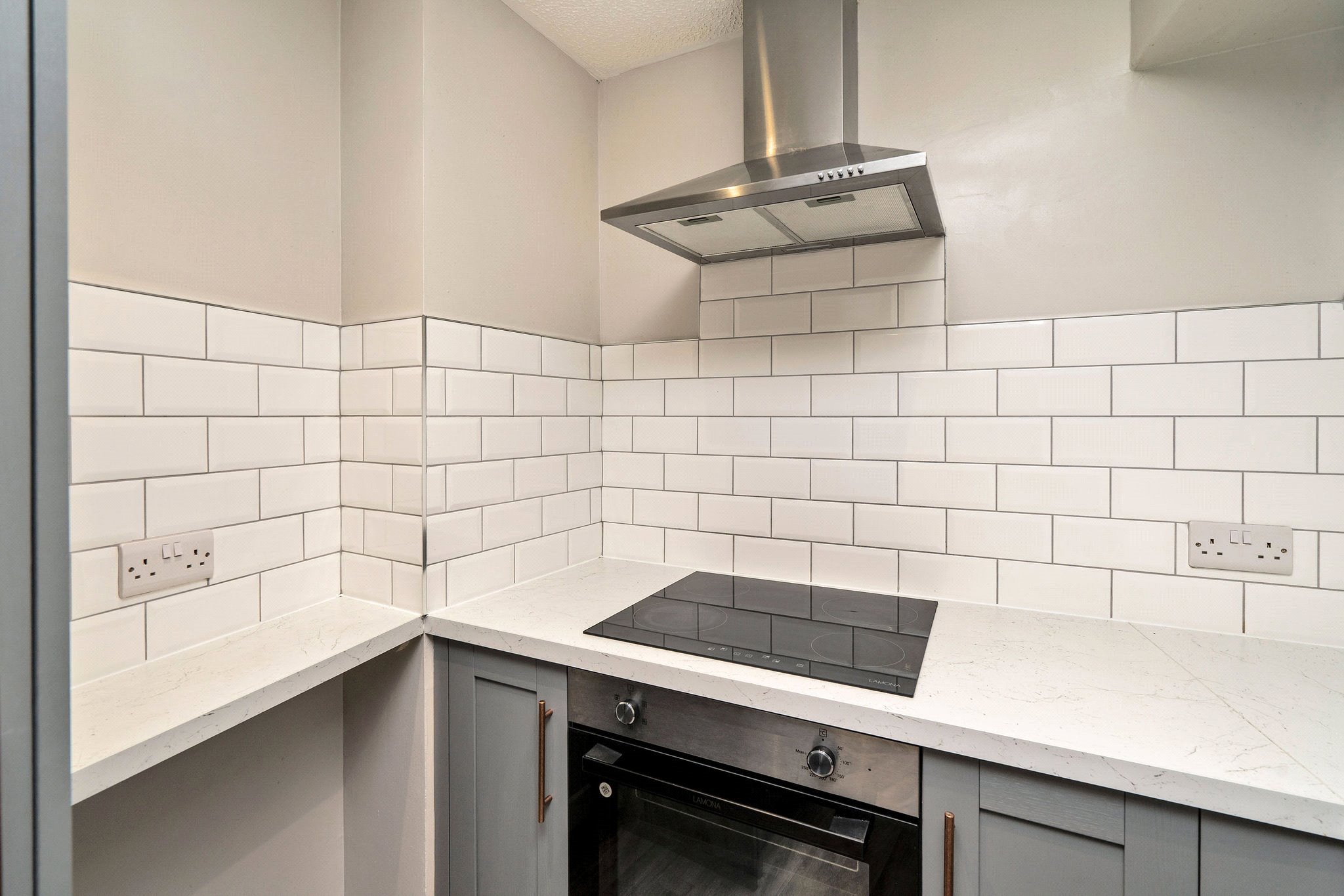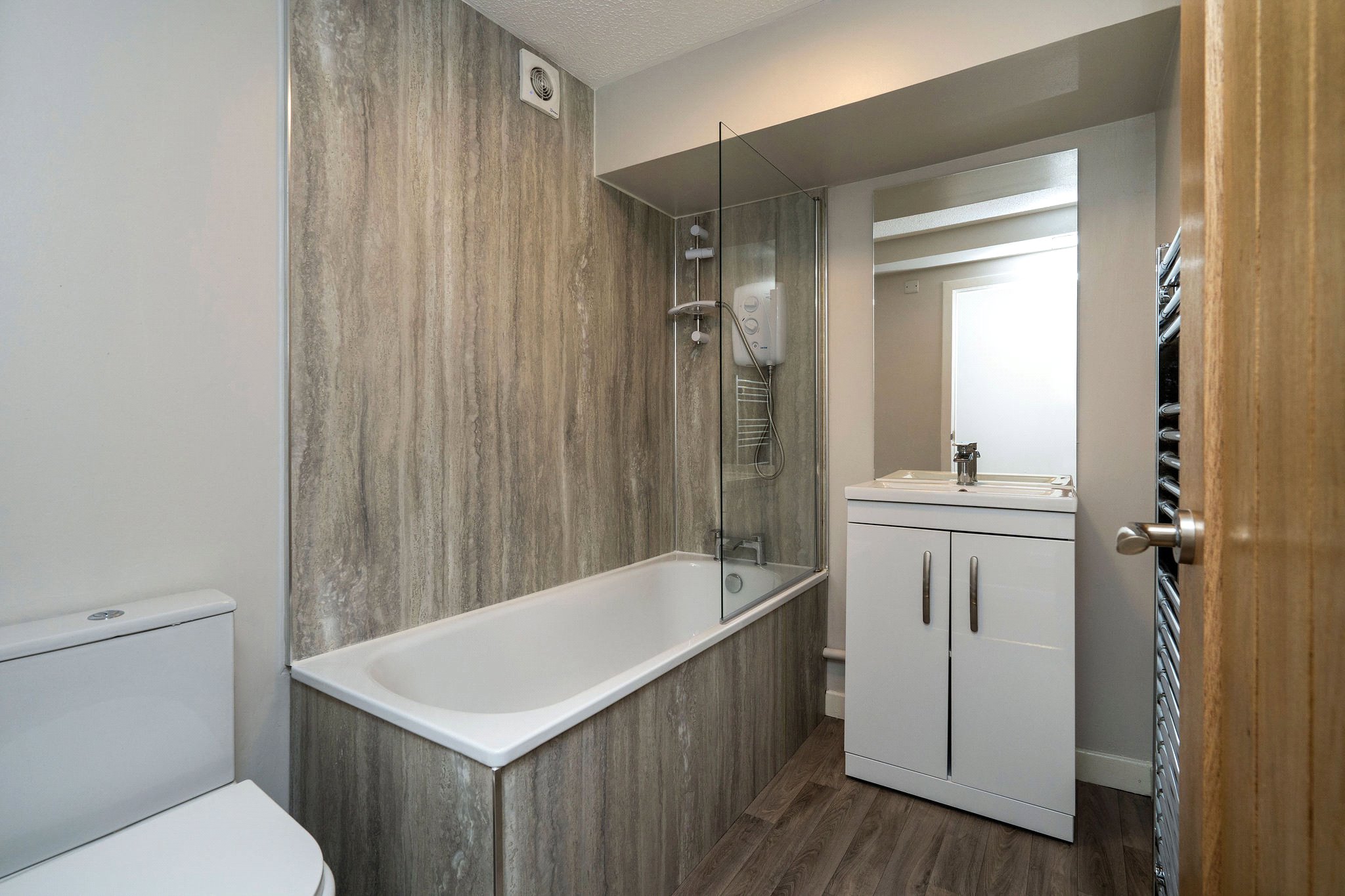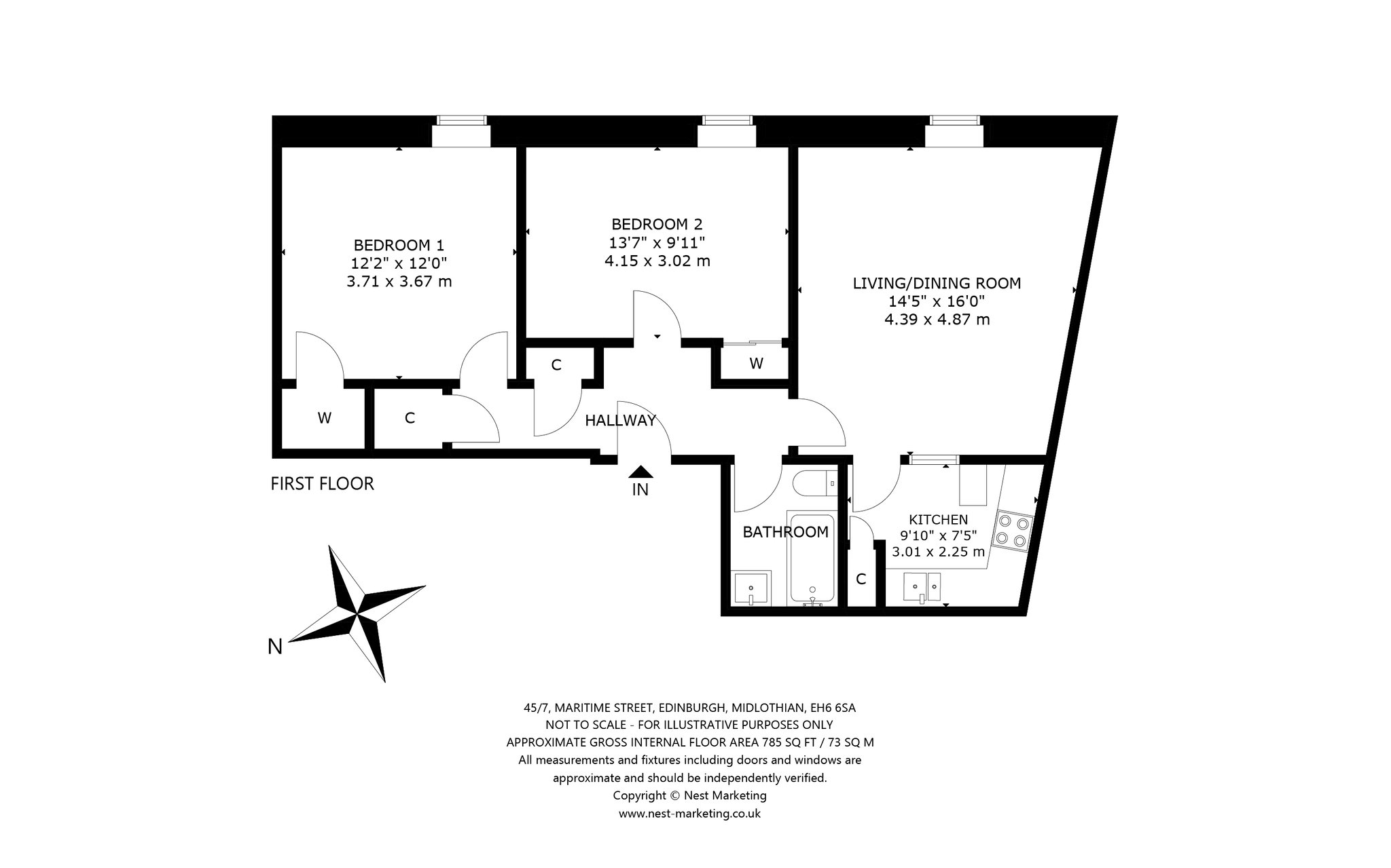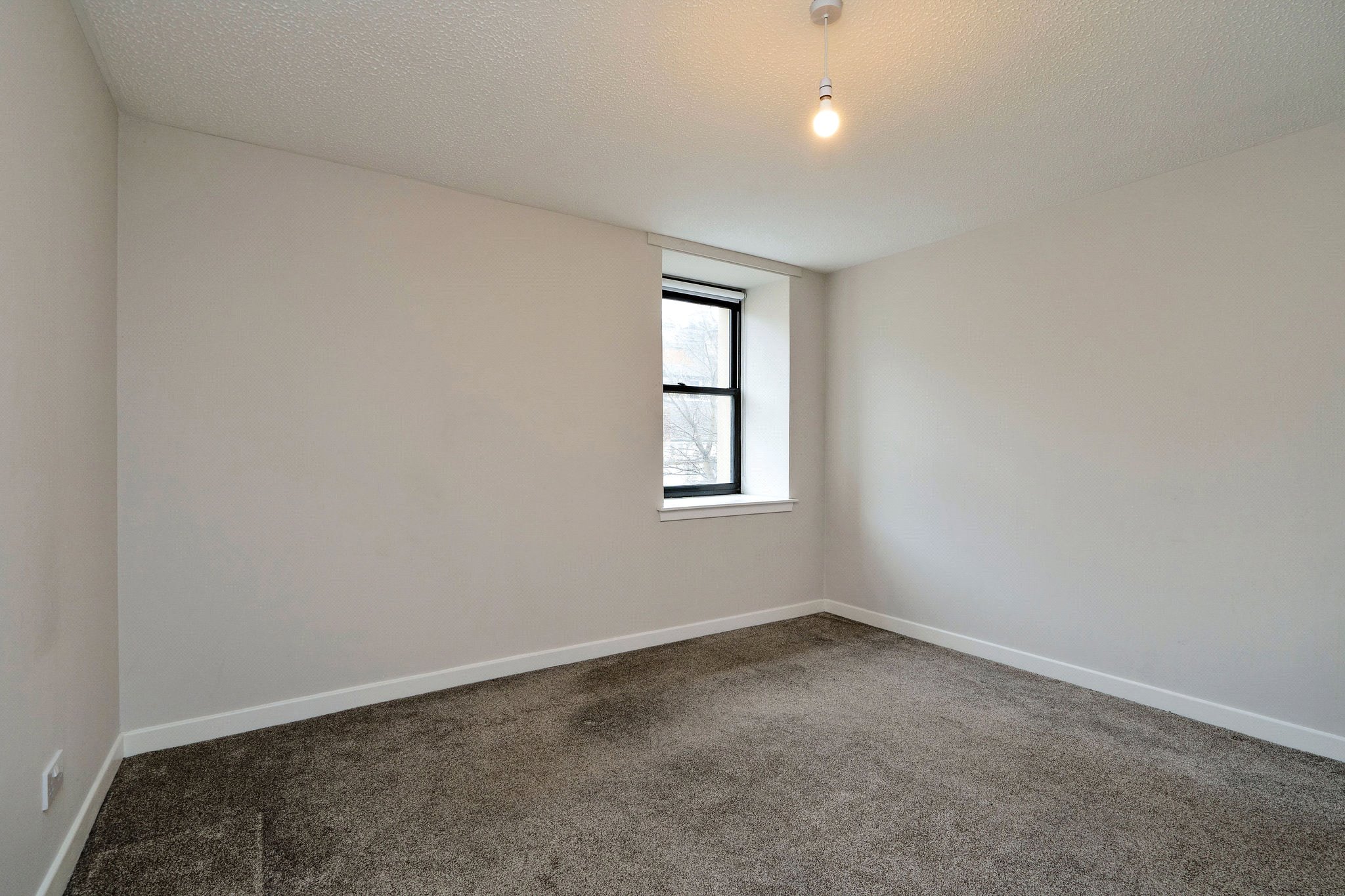 The accommodation comprises a welcoming hallway leading to a modern bathroom with shower over the bath. The spacious living room provides ample room for dining, and is complemented by a separate kitchen to the rear featuring modern grey units with stylish copper handles. Further along the hallway, you’ll find two double bedrooms, both benefiting from fitted wardrobes. Additional storage space is available with 2 cupboards, and the property is equipped with electric central heating (ECH) and DG. It is quietly situated to the rear of the building with a quiet outlook over the carpark and Constitution Street buildings.