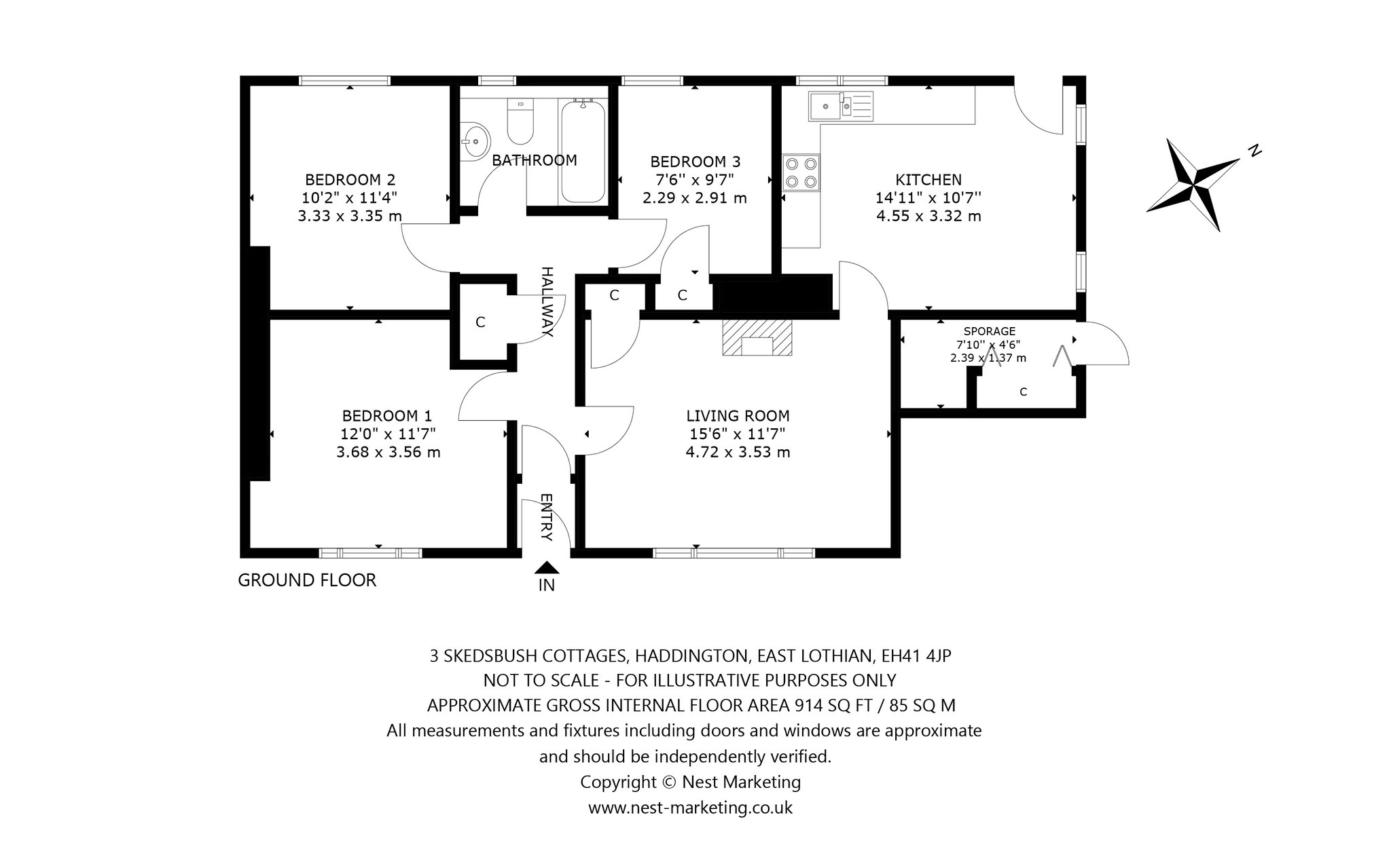 Hallway; Spacious living room with open fireplace; Dining kitchen with back door leading to garden; Three double bedrooms; Family bathroom with shower over bath, sink, WC and heated towel rail.