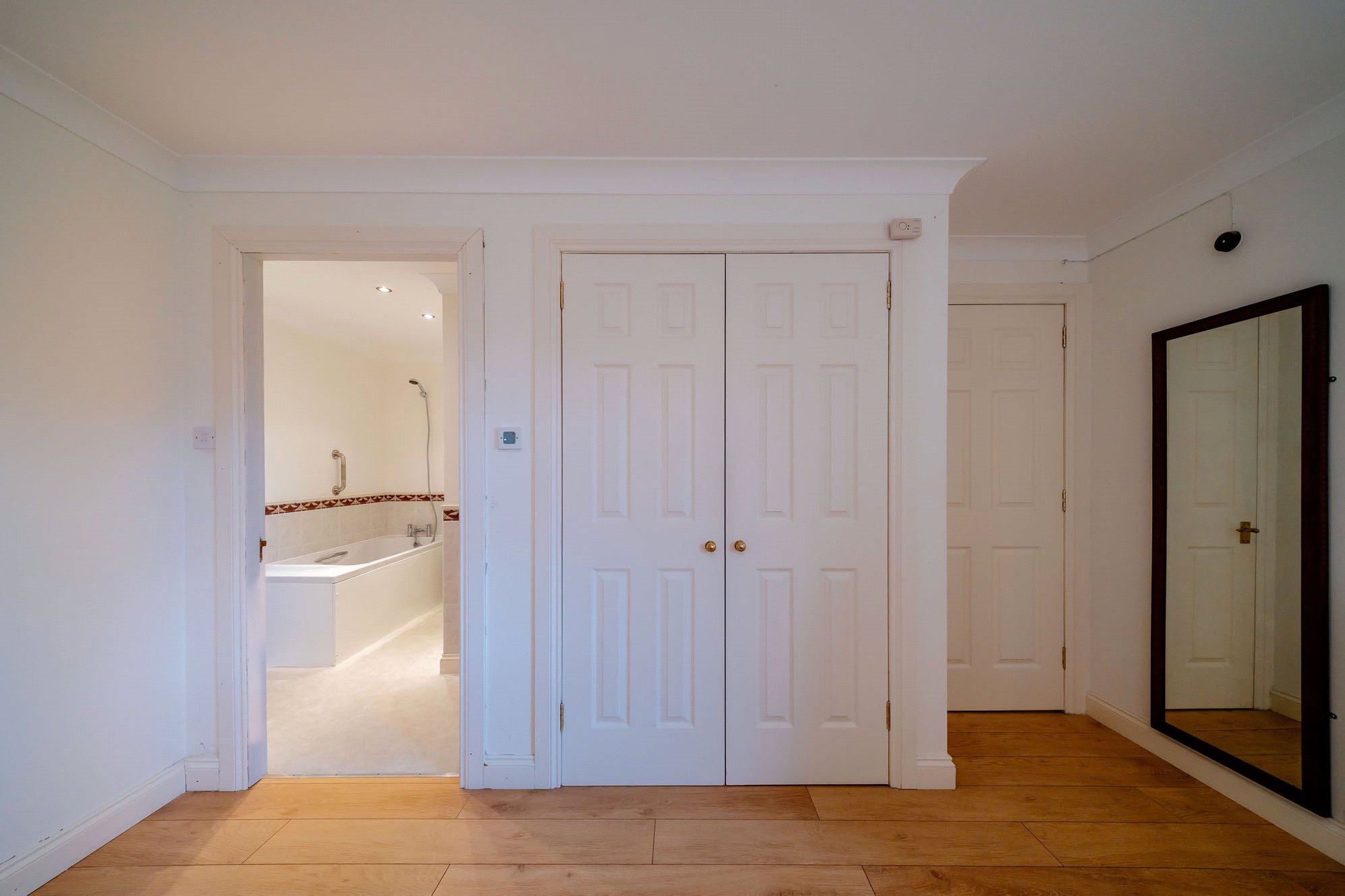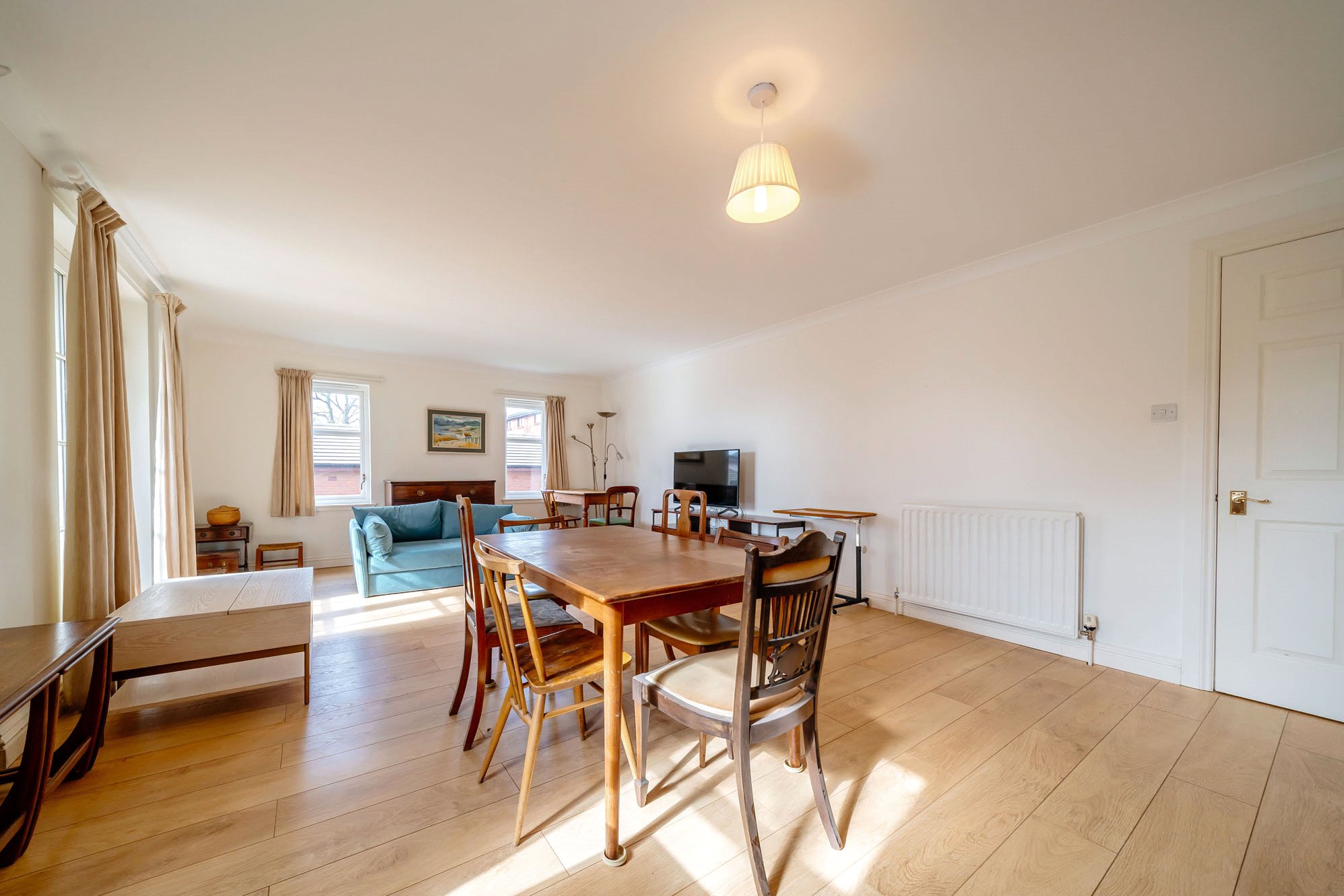 Vestibule; Hall with good storage; Generous open-plan living and dining area, creating a welcoming and versatile space with direct access out to a private balcony overlooking the peaceful surroundings; Modern kitchen with integrated appliances; Principal bedroom with ensuite bathroom; Second double bedroom; Newly installed contemporary shower room.