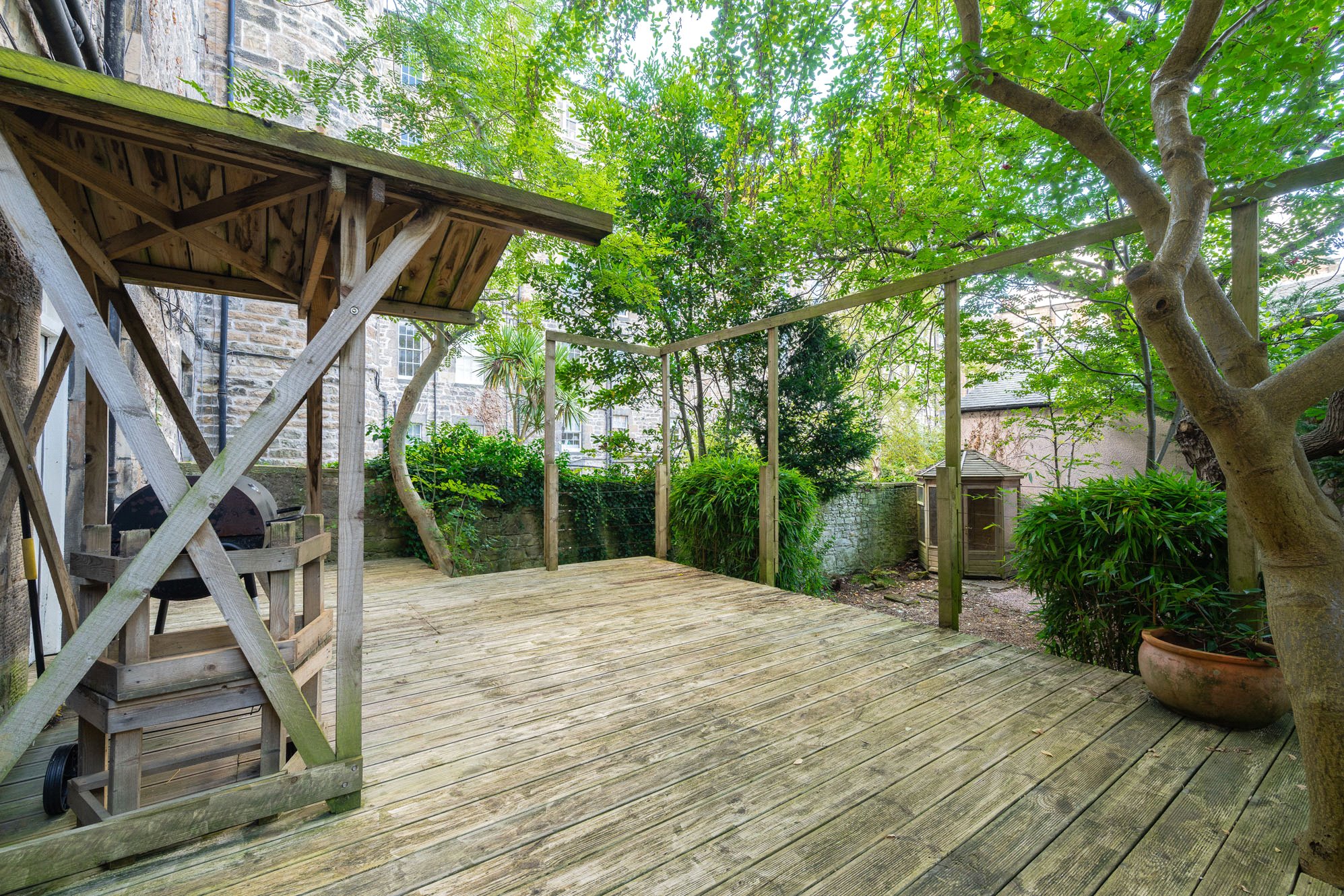Externally the low maintenance garden provides an oasis of calm, with a large decked area and BBQ station, and a gravel area with summer house. Please note that work is currently underway to cut back some of the trees. There is also a private front patio, with log store, one cellar and space for a seating area.