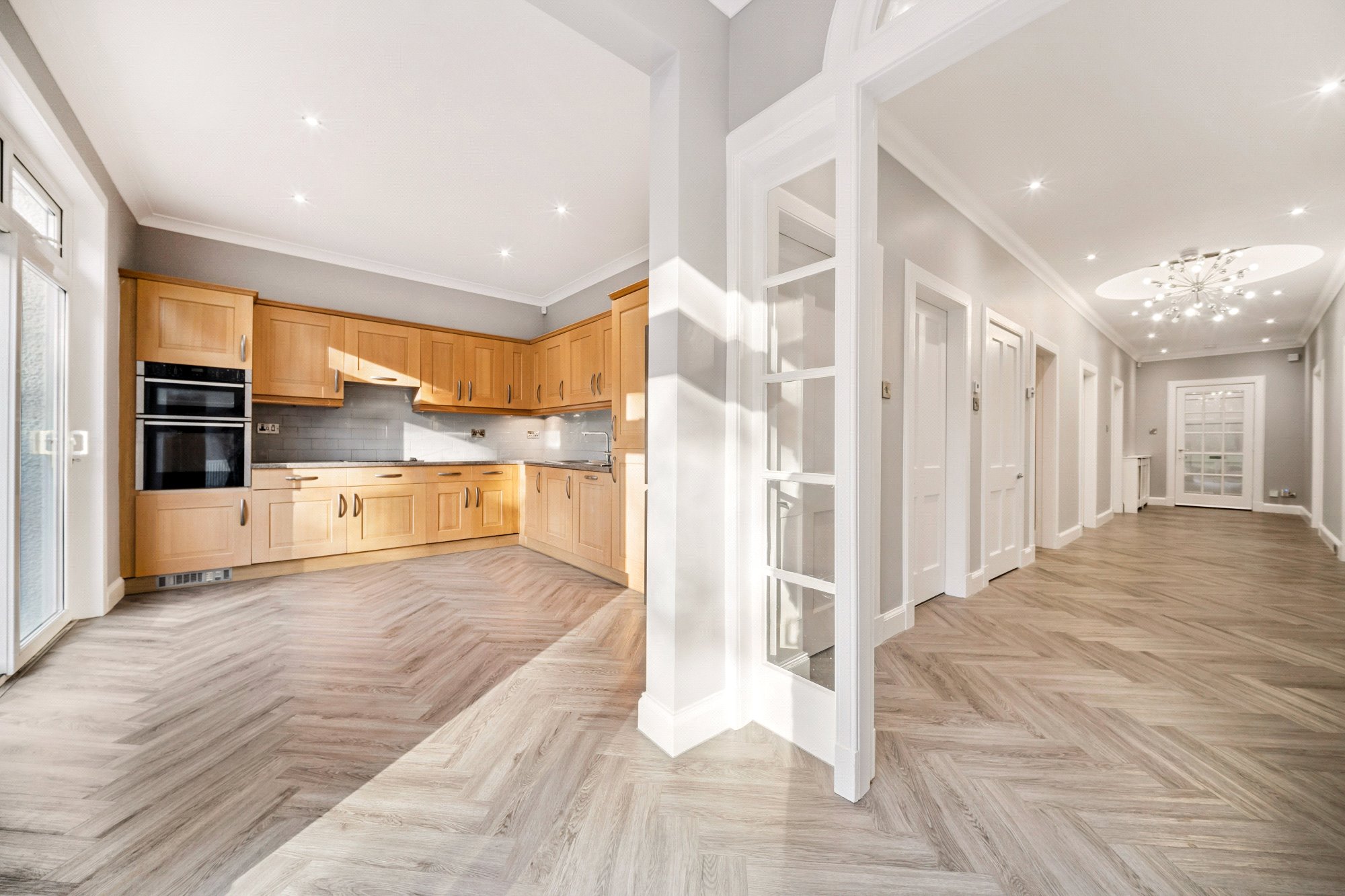Entrance vestibule leading through to a beautiful hallway, with a feature arched doorway and impressive view straight through to the rear garden; Large lounge with gas fire and bay window; Sunny contemporary dining kitchen, with an American-style fridge freezer, induction hob, electric oven and grill, dishwasher and doors leading straight out to the rear garden; Four double bedrooms, three of which have bespoke fitted wardrobes; Two shower rooms with underfloor heating; Practical utility room with washing machine, tumble dryer, ceiling-mounted wooden clothes dryer, ceiling-to-floor sliding door storage cupboards and door leading to the side of the house.