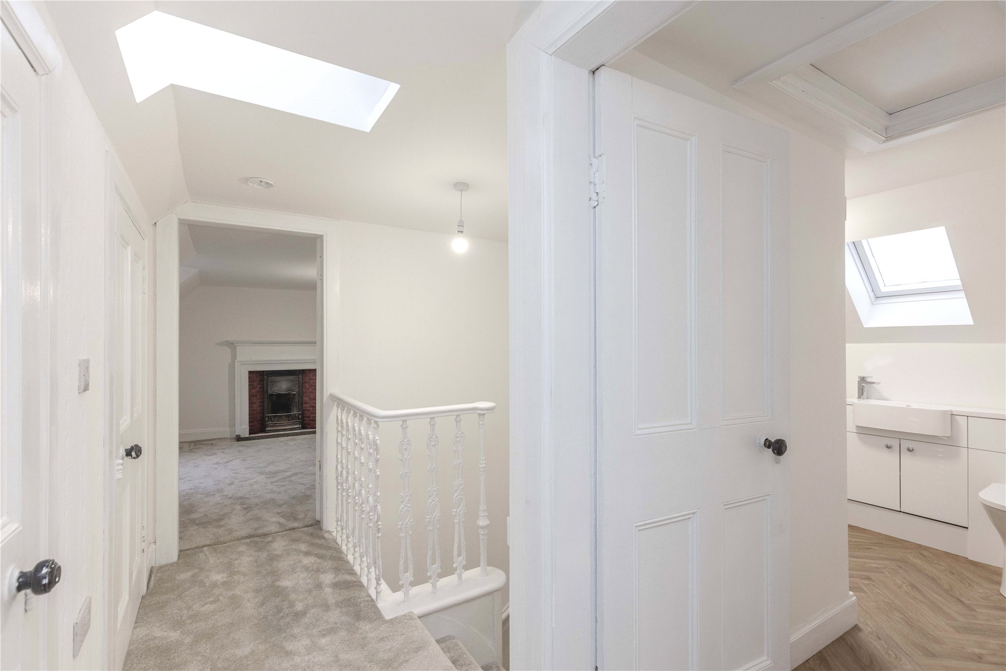 First floor – Landing with good storage; Two double bedrooms with feature fireplaces (non-operational); Shower room.