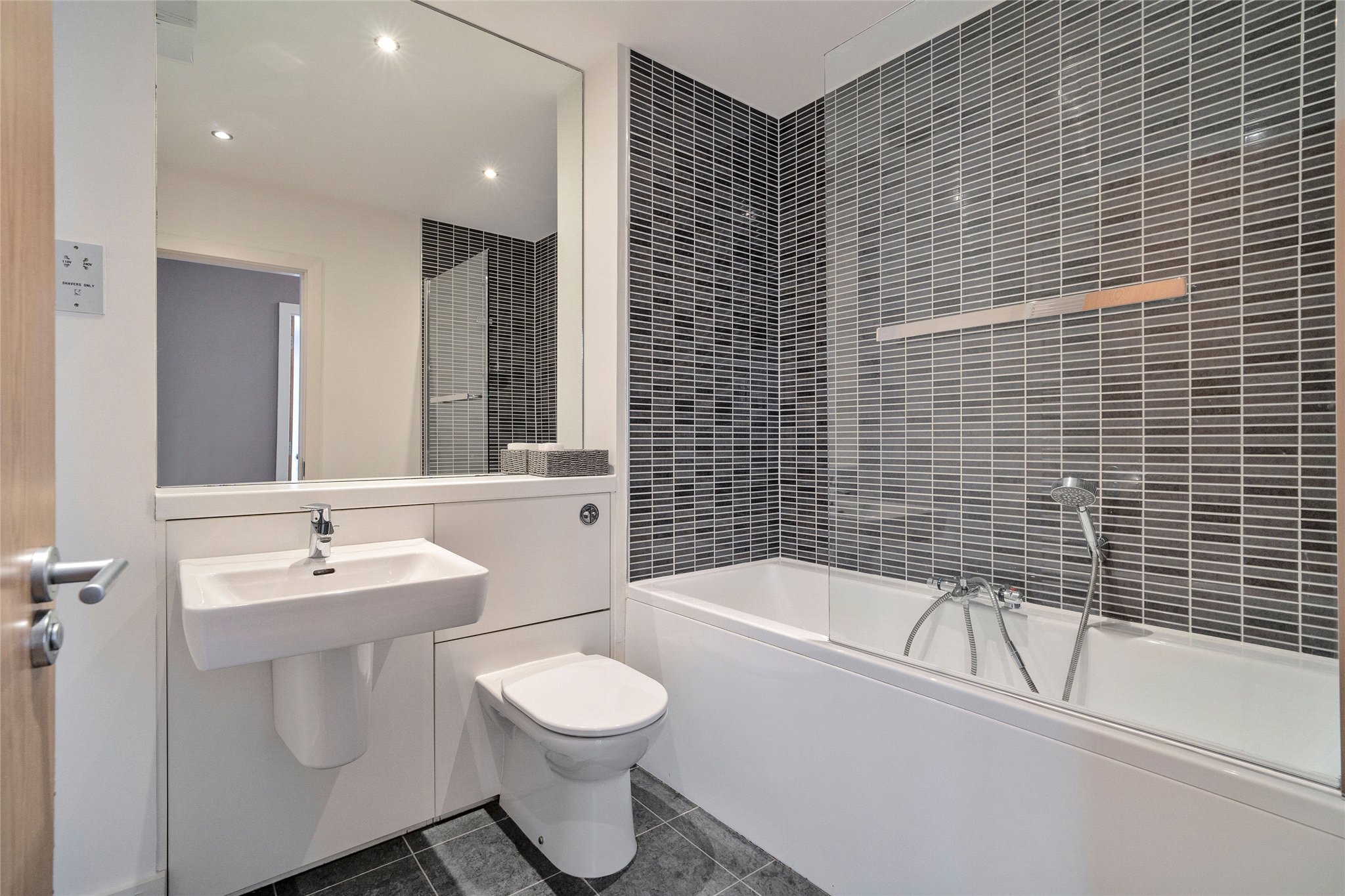 The accommodation includes two well appointed double bedrooms, both hosting built in wardrobe space and designed with comfort and functionality in mind. The principal bedroom enjoys the added luxury of an en suite shower room. A stylish family bathroom serves the rest of the flat, completing the living space with high quality fixtures and fittings. Additional benefits include allocated parking within a secure underground garage, access to well maintained shared garden grounds, secure door entry system and lift access.
