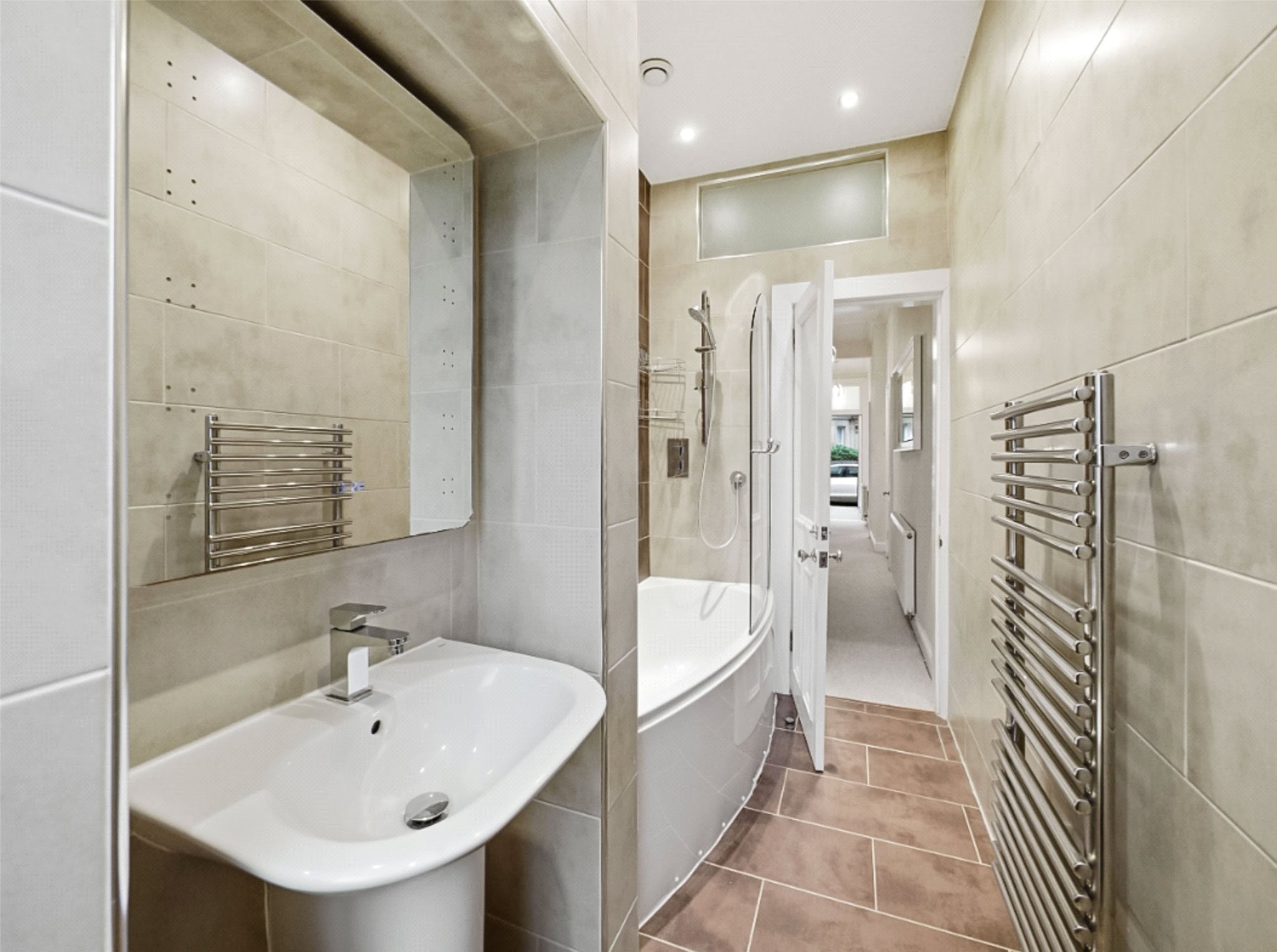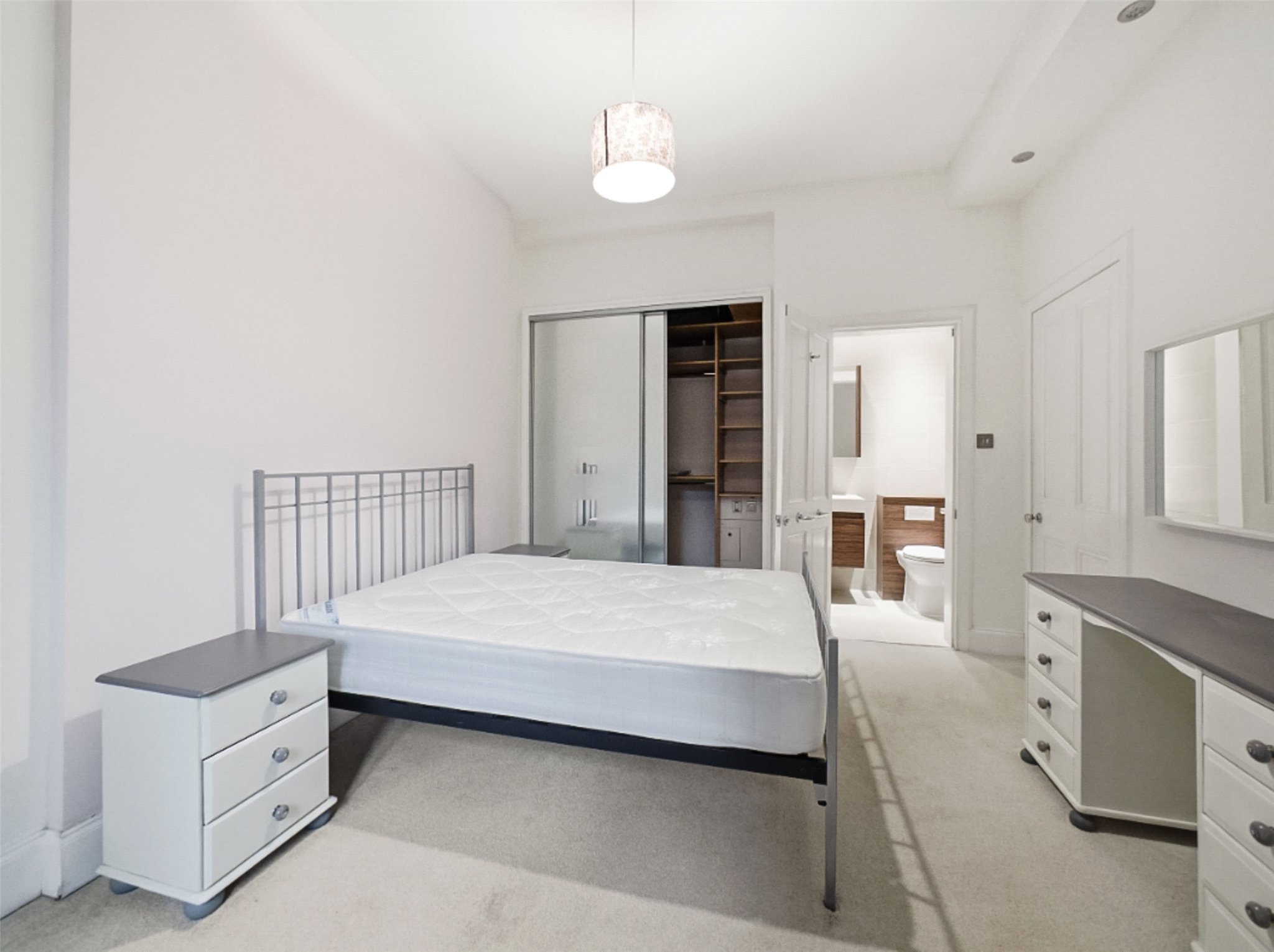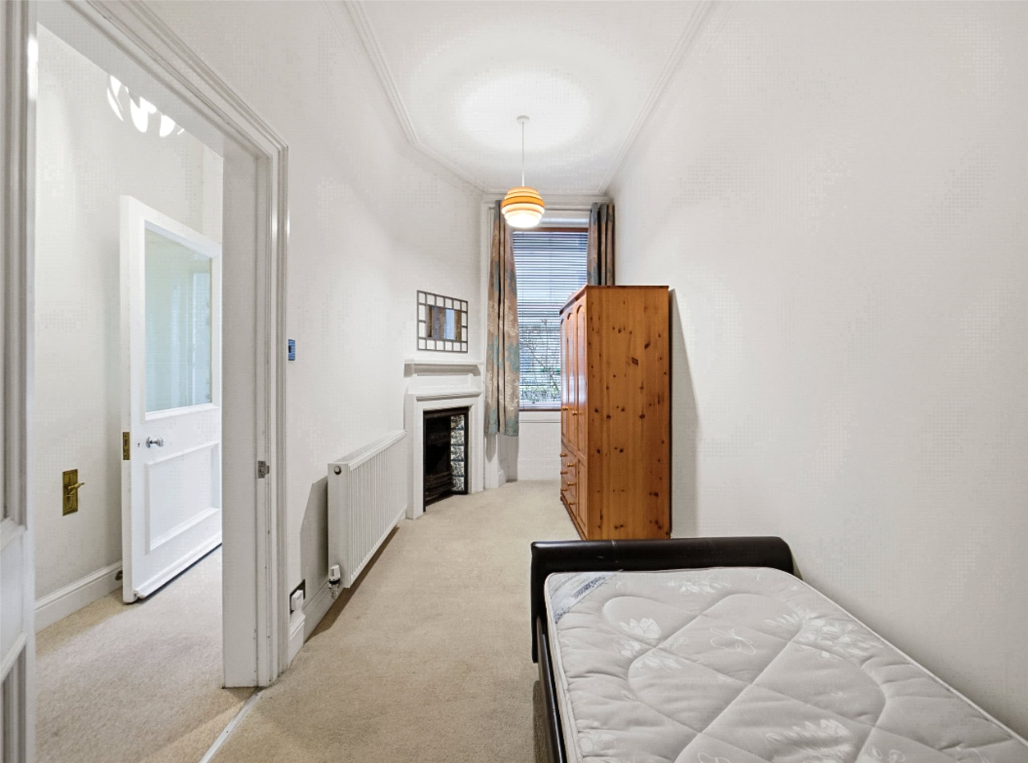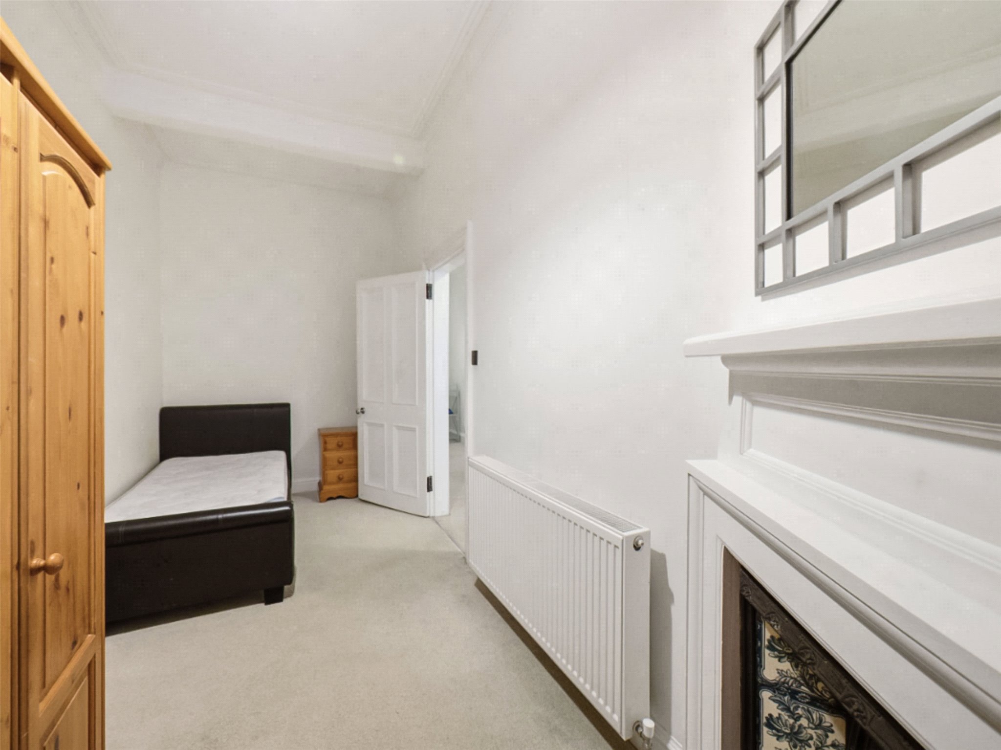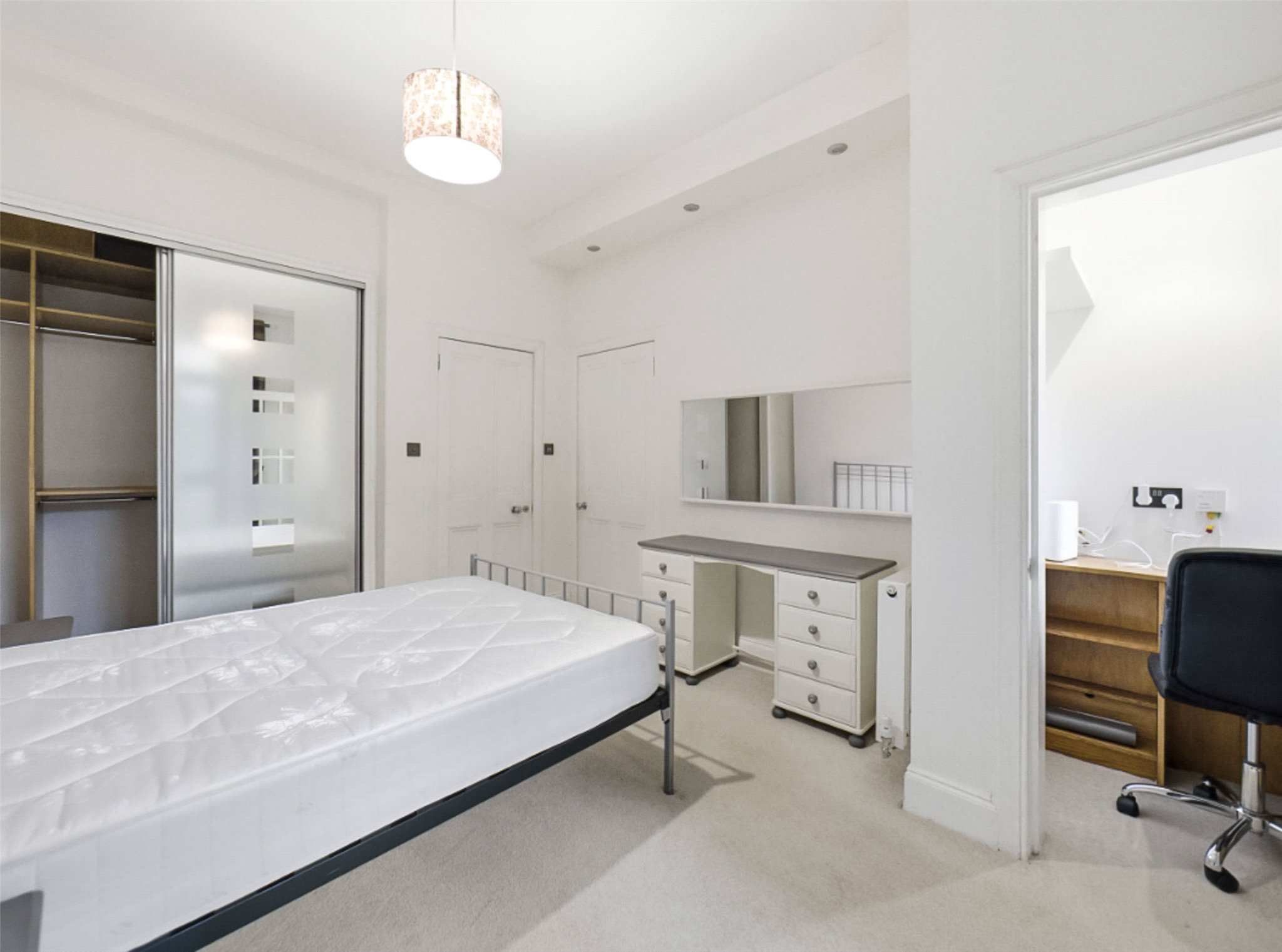 Entrance vestibule; Hall; Elegant living room with feature fireplace and dining area in bay window; Kitchen; Principal double bedroom with fitted wardrobes, a useful study cupboard and the added convenience of its own WC; Comfortable single room, ideal as a guest bedroom, nursery or home office, with French doors opening out to the shared rear garden; Modern bathroom with shower over bath, sink, WC, heated towel rail and underfloor heating.