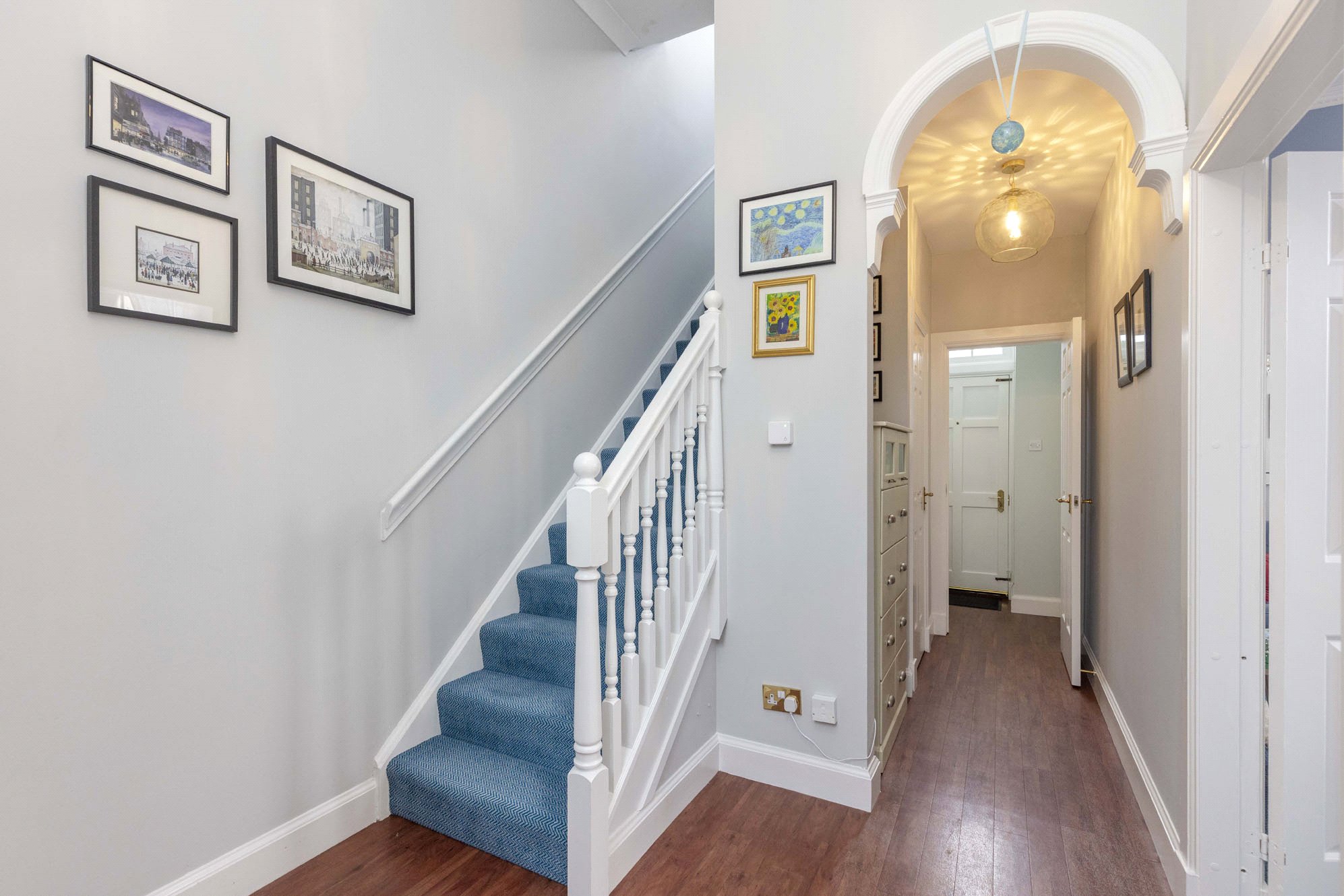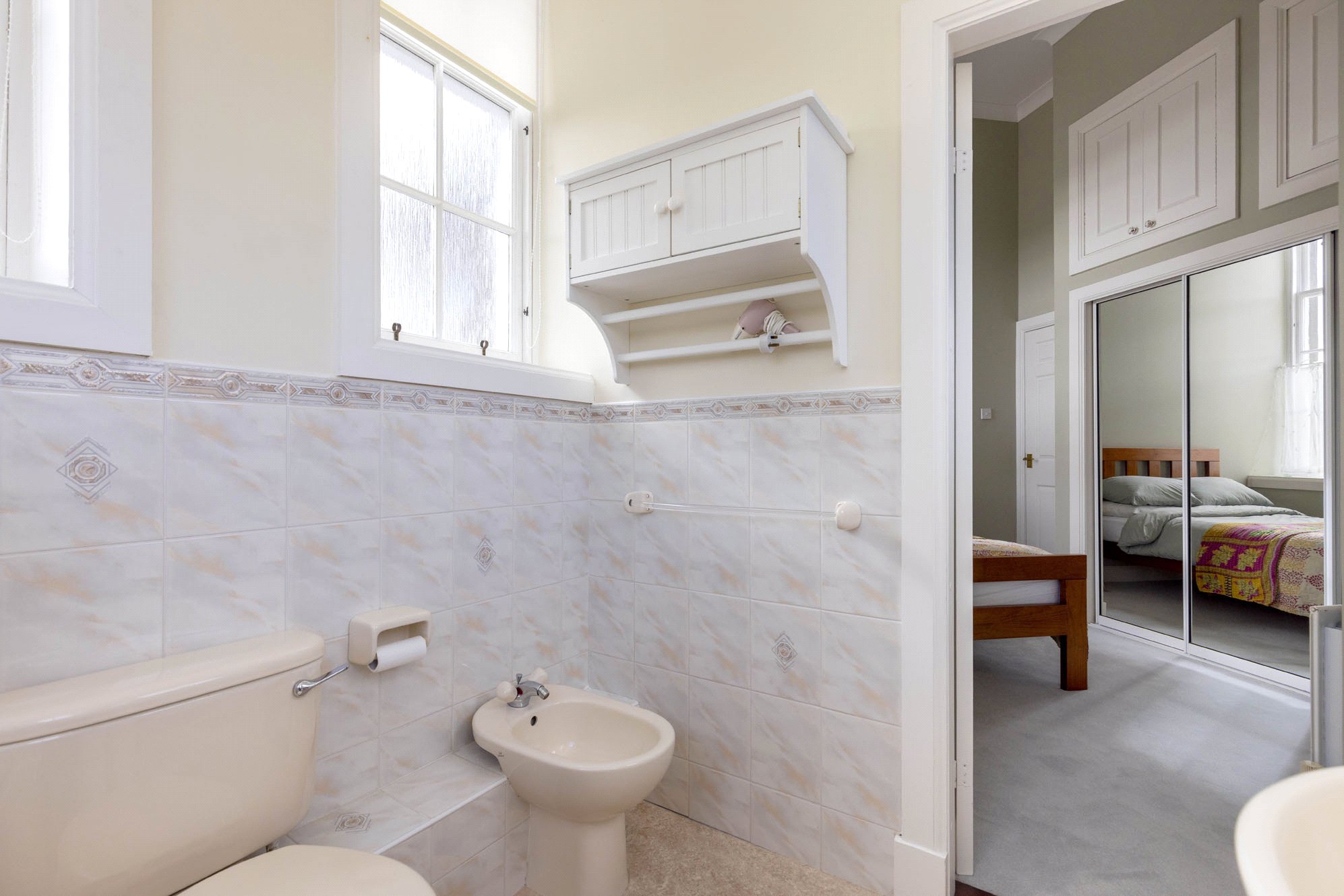 Upstairs, the first floor features a central landing giving access to two generously sized bedrooms. The principal bedroom benefits from its own ensuite bathroom, while a separate main bathroom serves the rest of the property. A large cupboard and multiple additional storage spaces throughout the home ensure excellent capacity for everyday living.