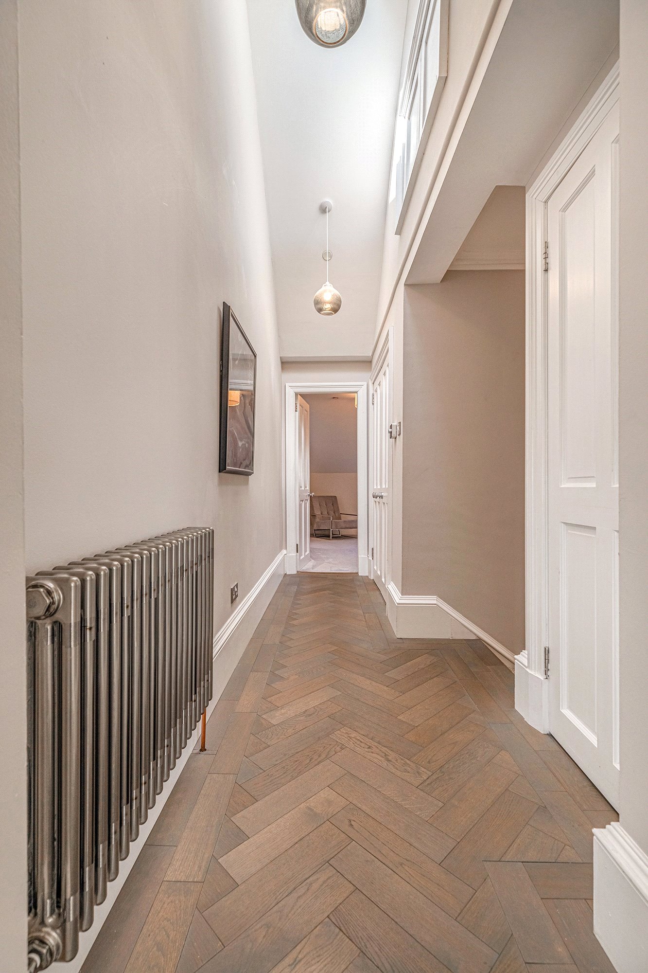 - Welcoming hallway with ceiling cornice, excellent storage, beautiful herringbone oak flooring, utility cupboard with stacked appliance, and column radiator