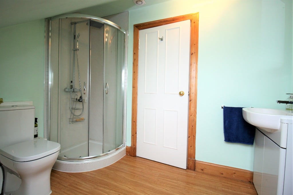Accessed through its own front door, the stairs lead you up to the first floor which comprises; a large comfortable living room with a large bay window, the fully equipped kitchen with a dining table to seat four, and access to a pantry/utility room and bathroom with shower over the bath to the rear. A large double bedroom, and a home office.