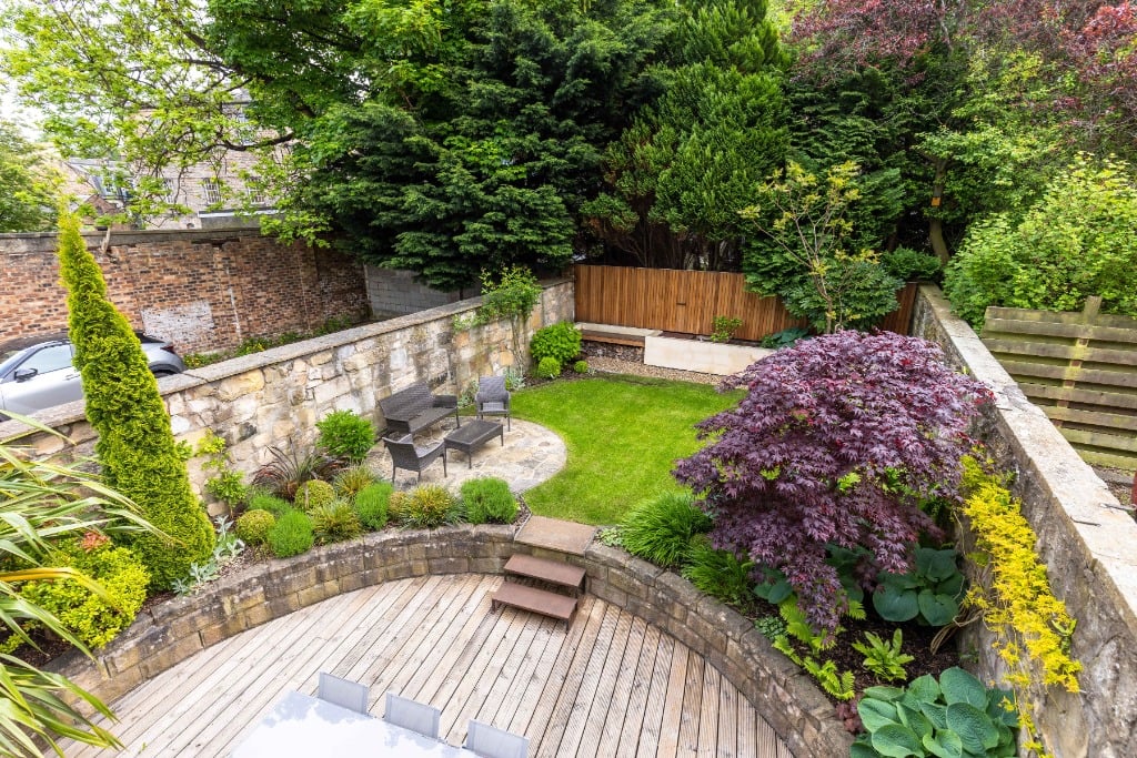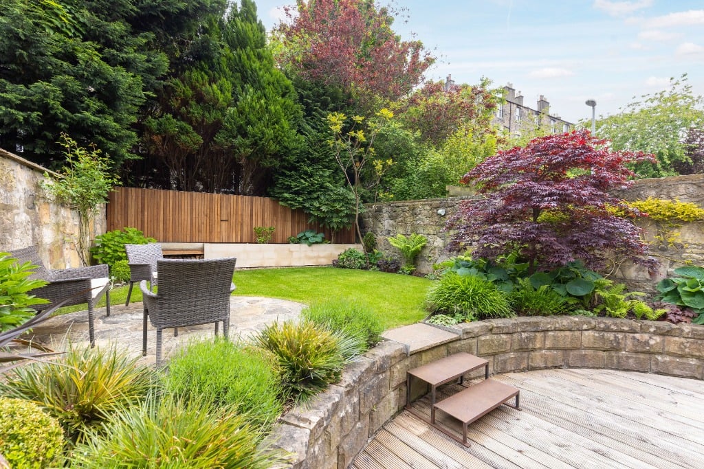 French windows open to a south facing, private walled garden with timber decked outdoor dining area, a suntrap stone patio, landscaped garden and lawn.