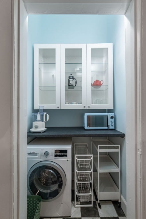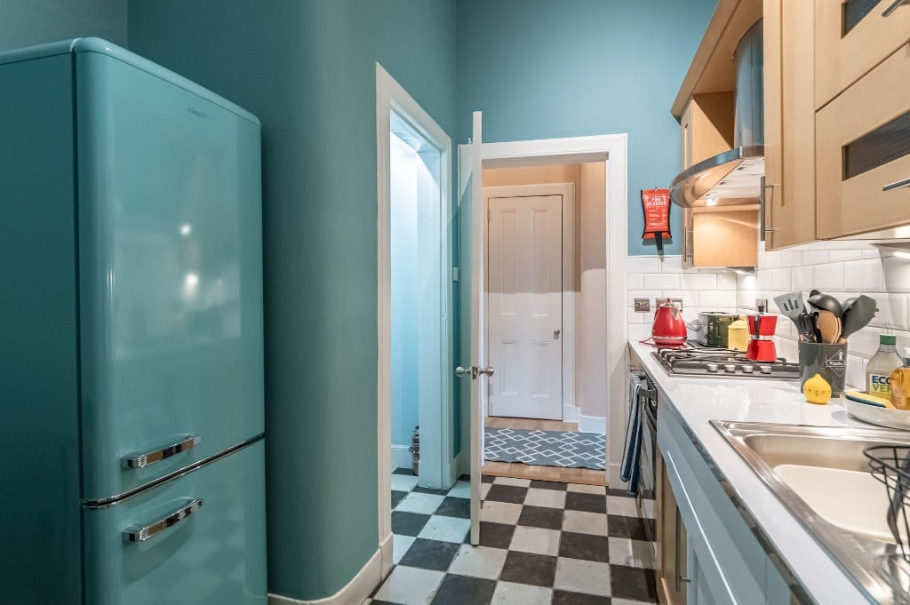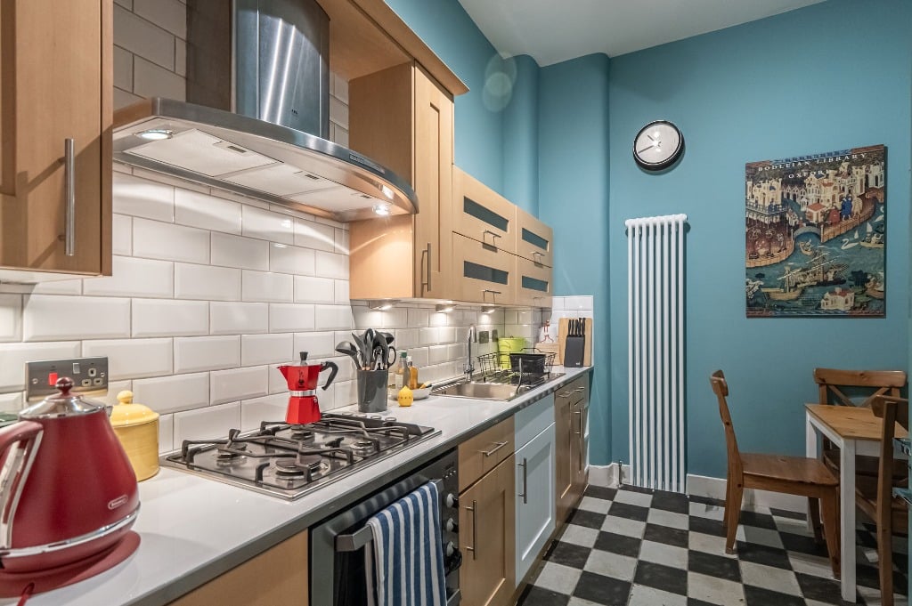 The bedroom features a comfortable double bed and generous storage space, perfect for longer stays or travellers with extra luggage. The well-equipped kitchen includes everything you need to cook at home, and the flat is filled with thoughtful touches to make your stay as comfortable as possible.