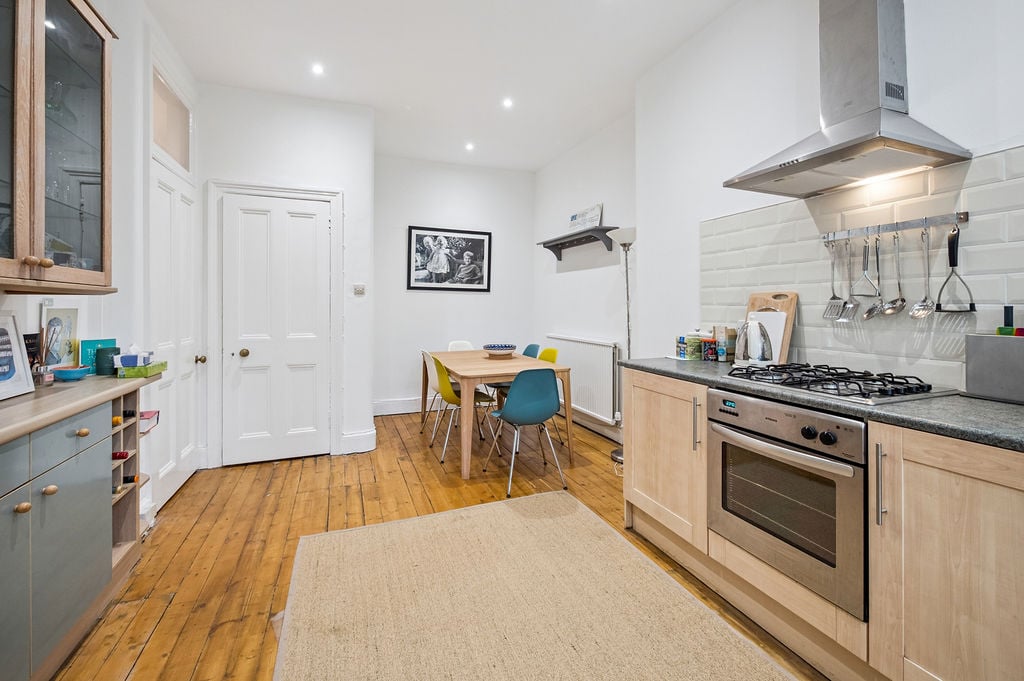 The property features a generously proportioned lounge with large sash-and-case windows, ornate cornicing, and a decorative fireplace, retaining the characterful features of its Victorian heritage. The spacious dining kitchen provides ample room for everyday living and entertaining, with modern fitted units and space for a dining table.