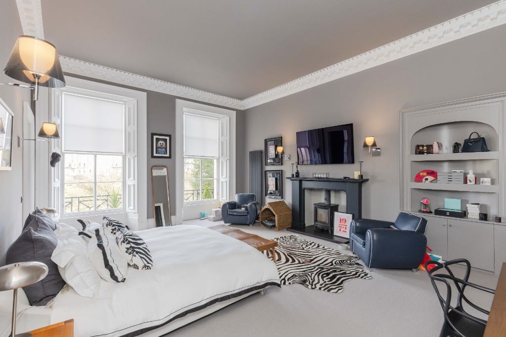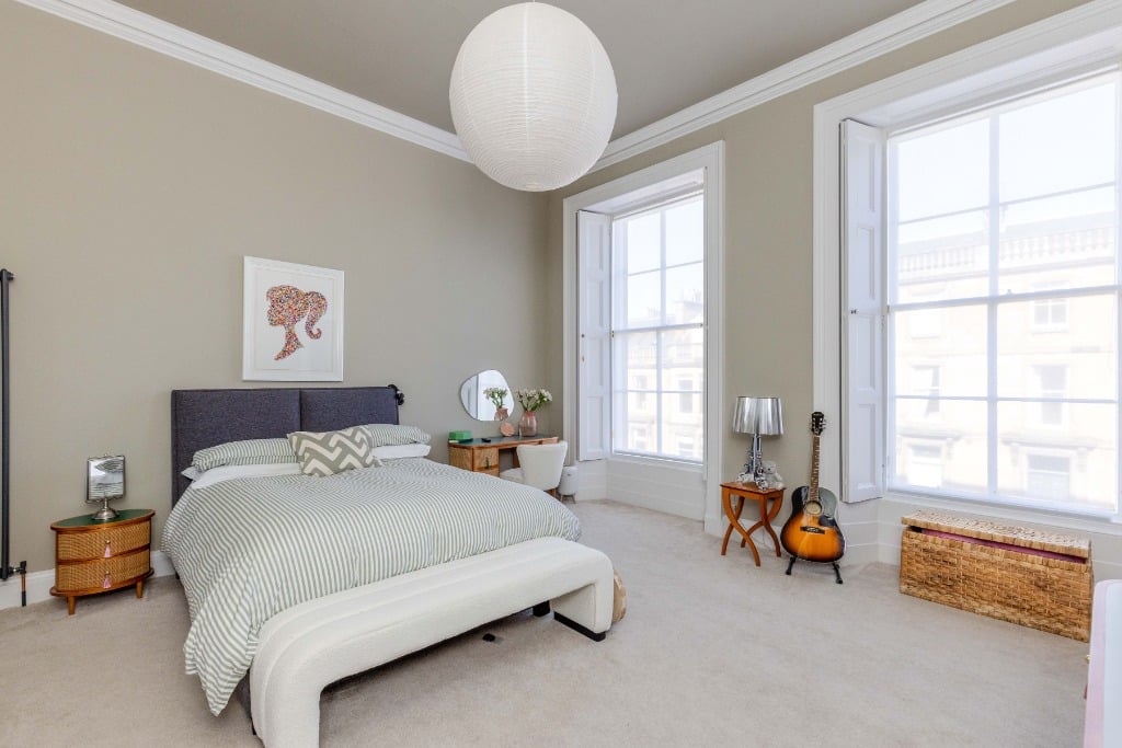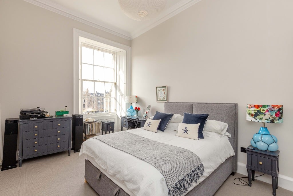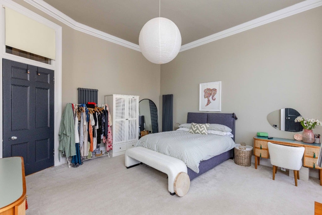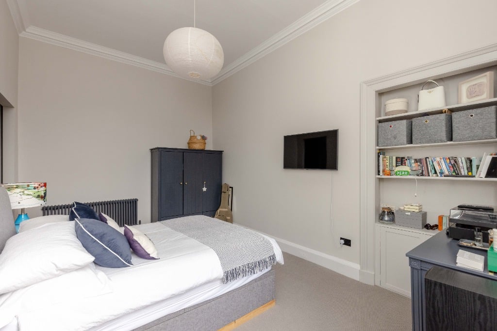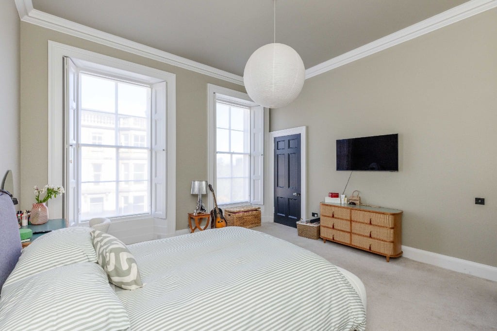 The apartment is fully equipped with everything you would expect from a property which has been meticulously styled to blend it’s traditional features and contemporary finishes. The apartment is the ideal base for providing a comfortable and stylish space to relax in after a day of festival performances, exploring Edinburgh, or enjoying the city’s iconic attractions. Stunning sitting room with three full length widows with working shutters; Kitchen/dining room with appliances; Principal double bedroom which is generously proportioned and benefits from a spacious dressing room and modern ensuite shower room and log burner; two further spacious double bedrooms (1 with ensuite shower room); modern family bathroom and WC.