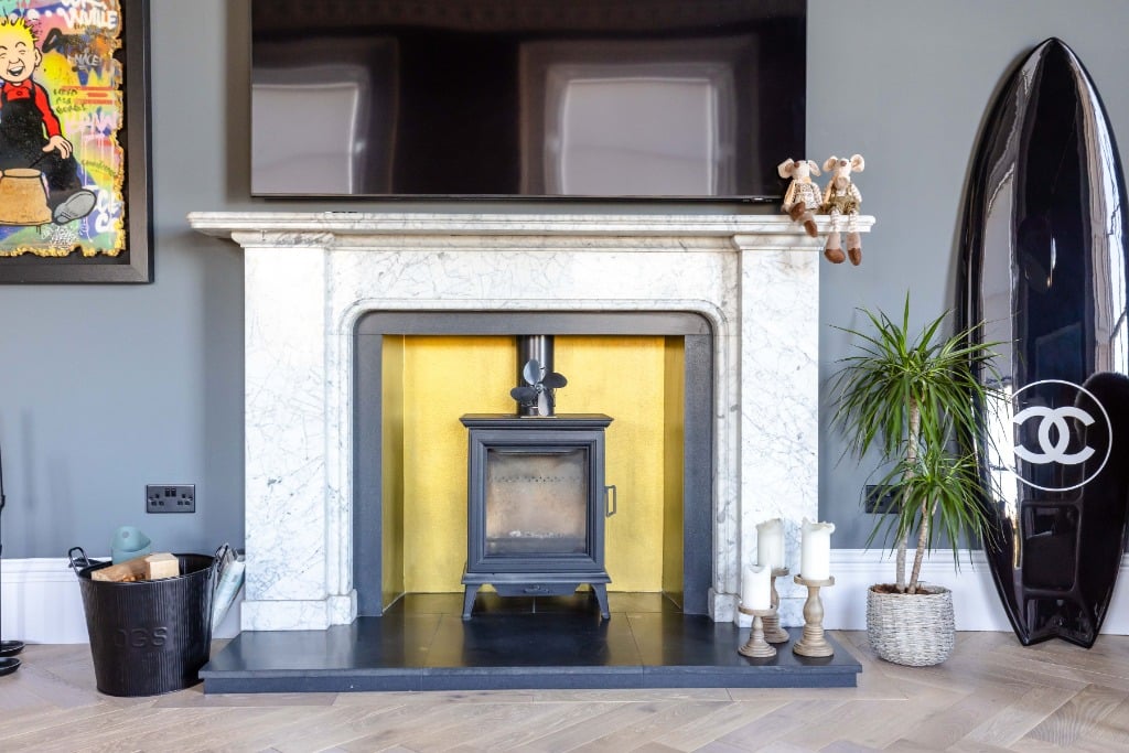 - Bright, spacious sitting room with 3 large full length windows with shutters and wood burner