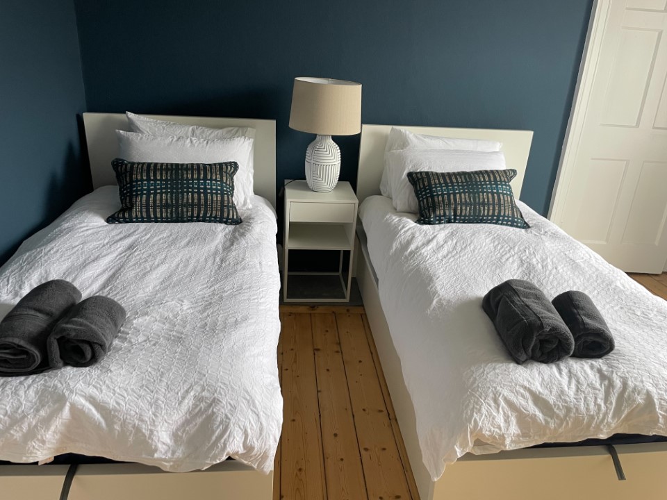 The property features a large double bedroom with a private en-suite bathroom, as well as a twin bedroom ideal for friends, family, or colleagues travelling together. A second modern bathroom ensures plenty of convenience for all guests.