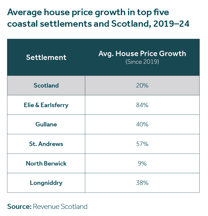 Over the last 12 months, 13 of the top 20 settlements in Scotland (ranked in terms of average house price) were located by the coast.