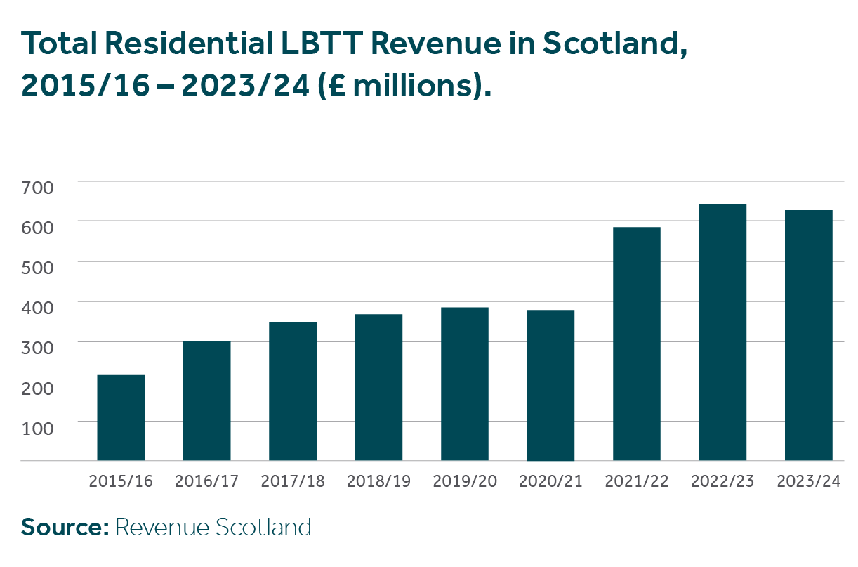 Residential LBTT revenues decreased slightly in 2023/24 compared with the previous year. When LBTT was introduced in 2015/16, over 50% of transactions fell under the £145,000 threshold. However, as house prices have risen, only 35% of sales are now under this threshold.