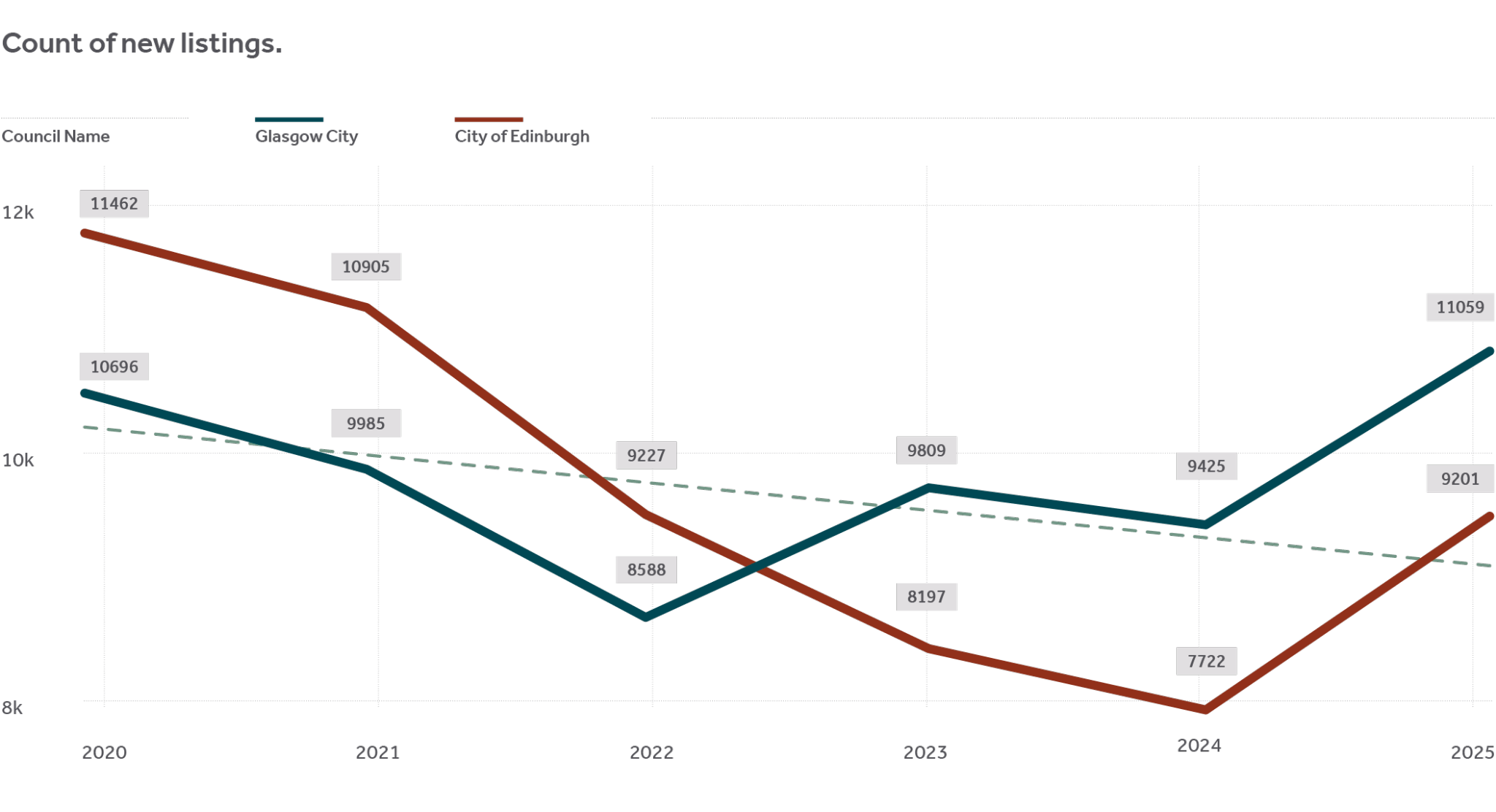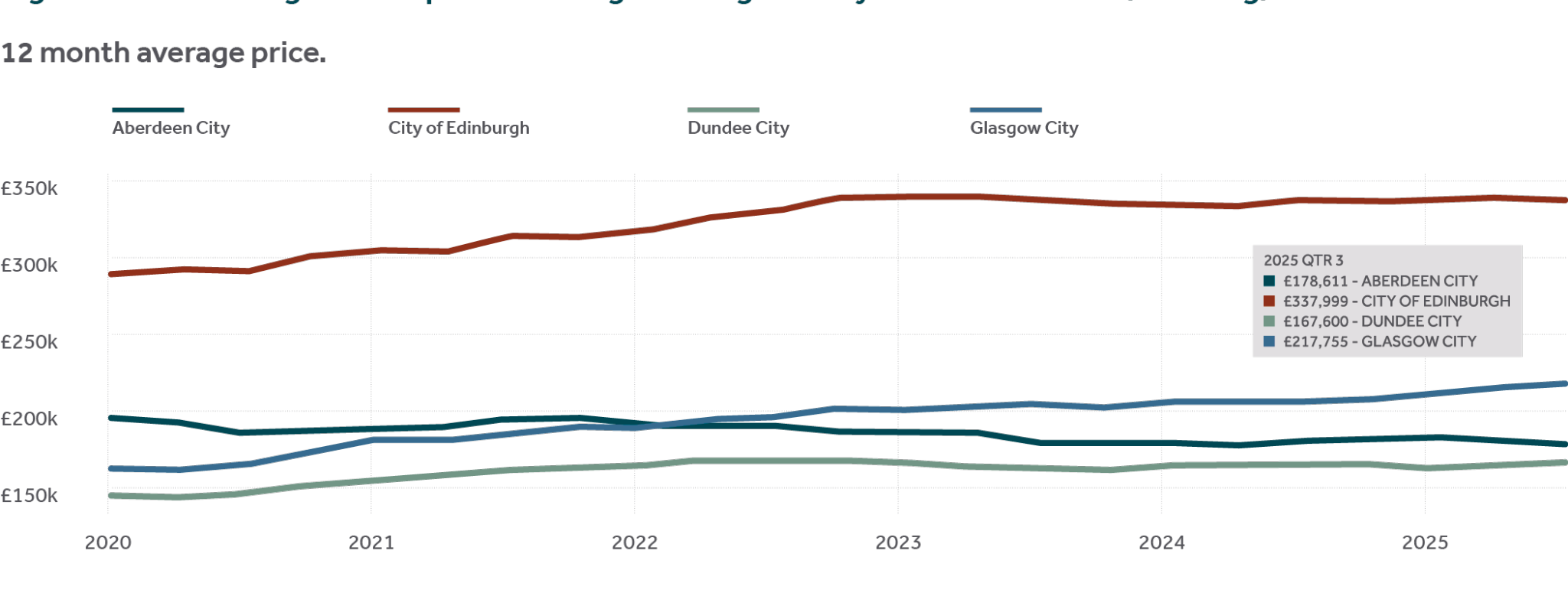 On a 12-month rolling basis, the average house price in Glasgow has continued to outpace Scotland’s main cities, growing by over 5% to nearly £218,000. Edinburgh and Dundee have both grown by c.1%, while the average price in Aberdeen has continued to decline (down 1.2%). However, the average house price in Edinburgh (c.£338,000) continues to surpass other areas.