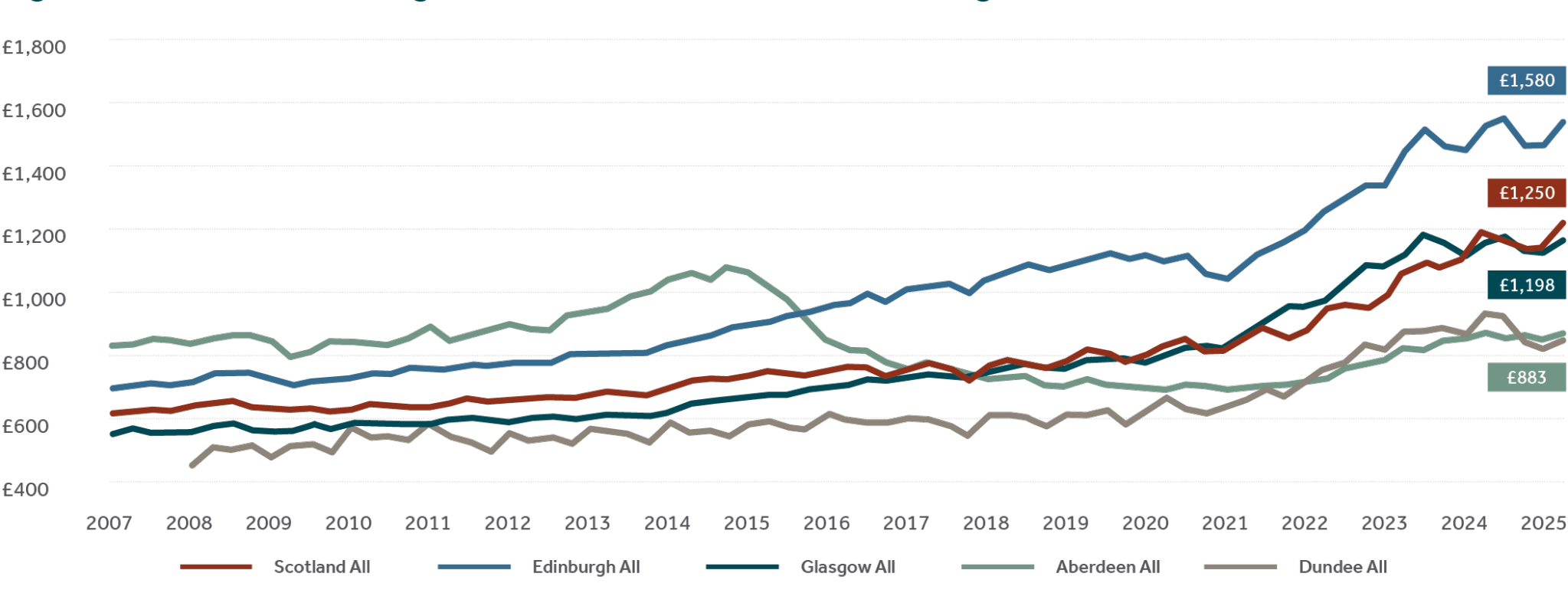 The average advertised rent in Scotland rose sharply following the Covid-19 pandemic and currently stands at £1,250pcm as of Q2 2025, which is the highest on record. Over the last three years, the average rent has grown at a compounded annual rate of 9.4% nationally, which is more than double the ten-year rate. The recent growth reflects the diminishing rental supply and persistent demand, particularly among students and young adults. However, it has also been caused by political intervention.