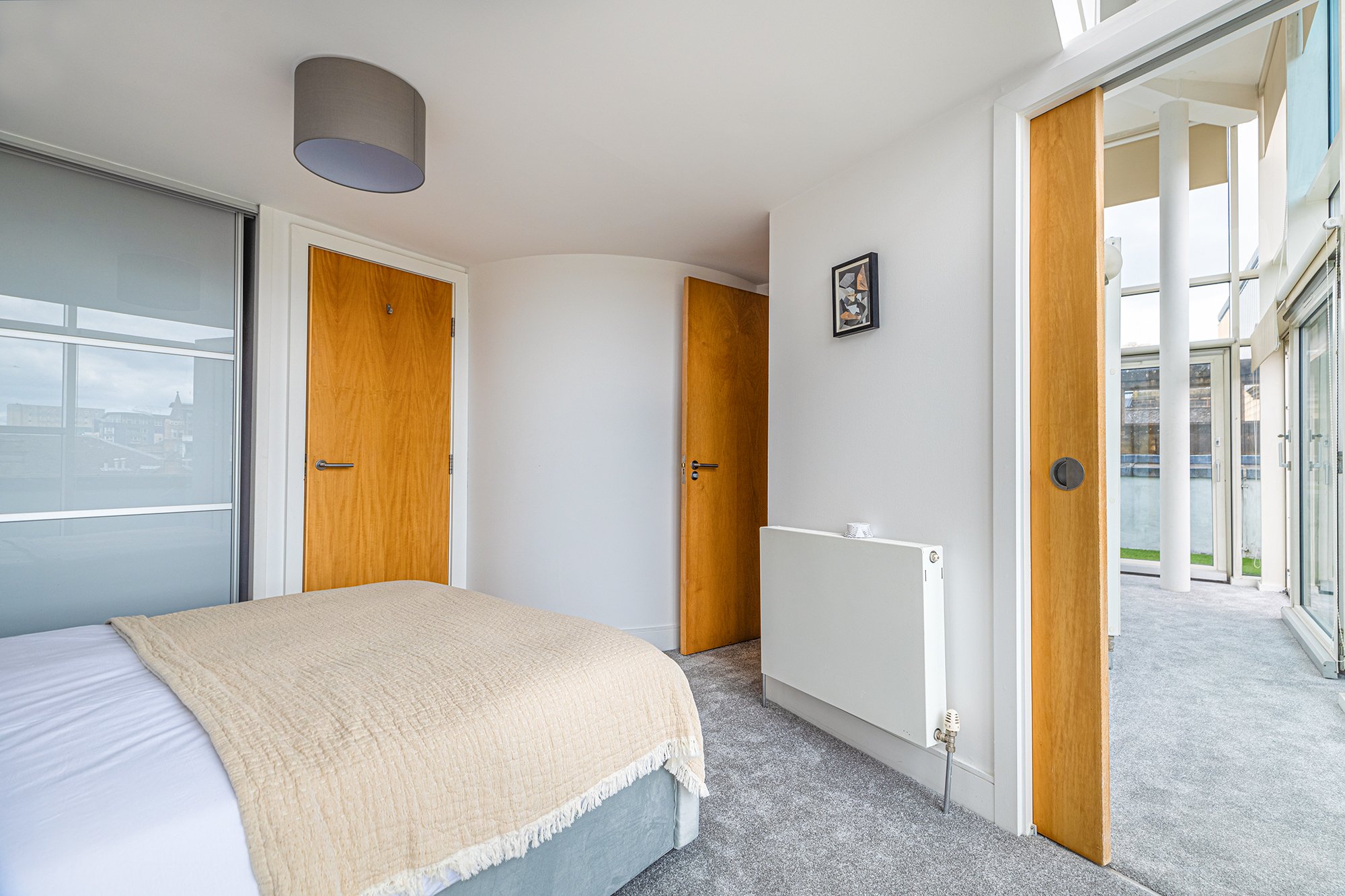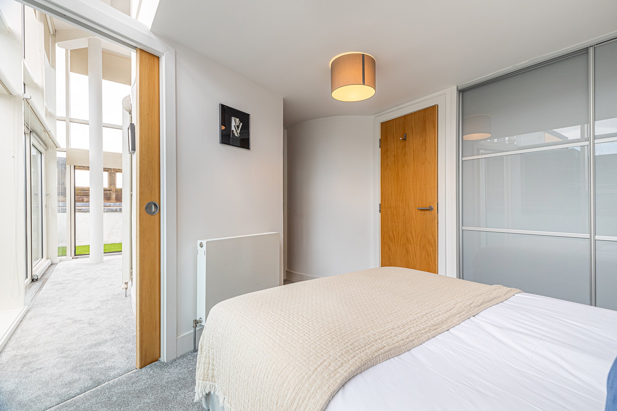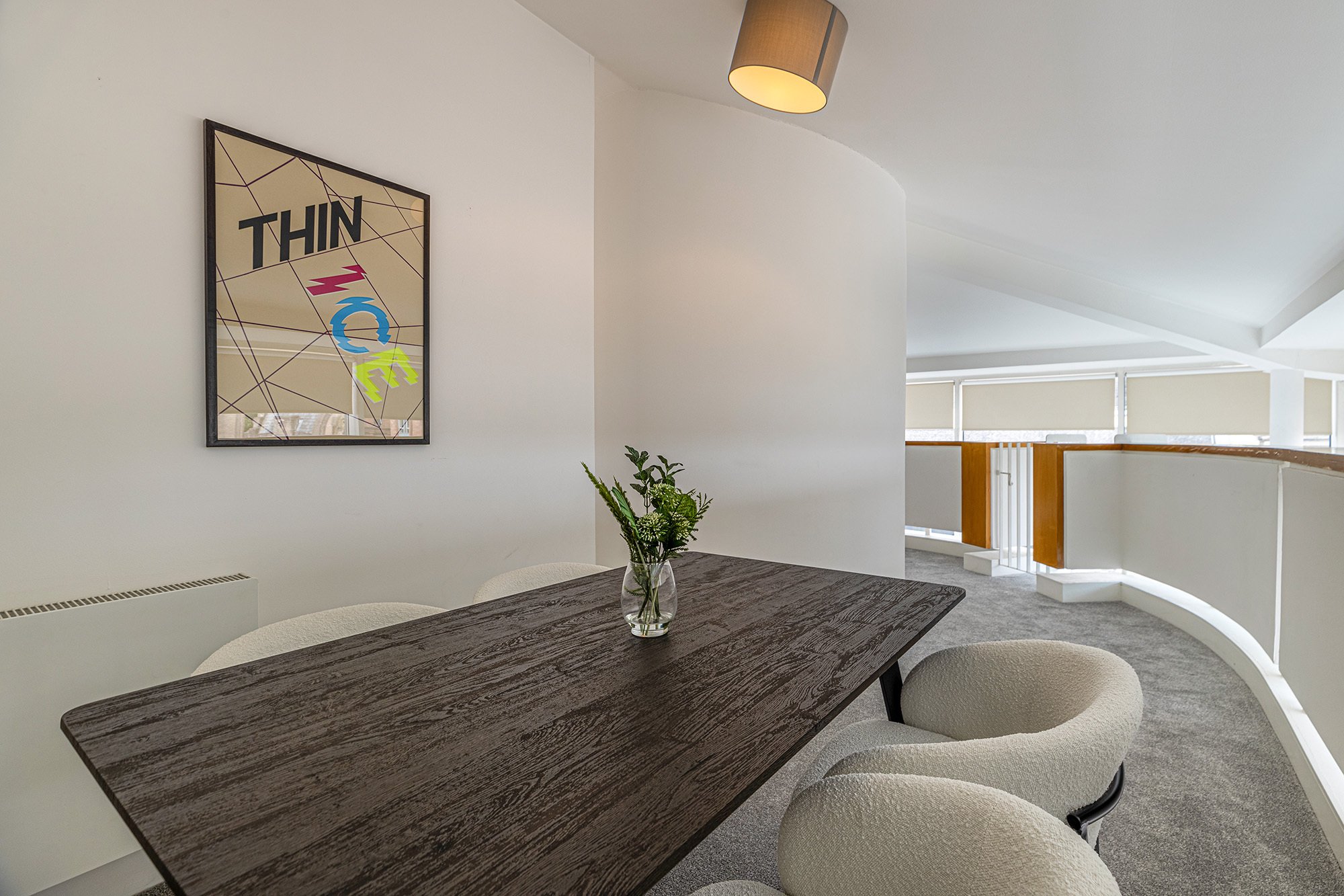 The stylish apartments centres around a substantial spiral stair, both upper and lower floors are flooded with natural light from the full height walls of glass spanning the full length of the apartment, patio doors lead to the 372 sq ft terrace and notable features include curved mezzanine and galleried ‘L’-shaped living space with vaulted ceilings, spanning over 30 ft, and with off-set mezzanine room, currently used as dining area and ideal as a third spare bedroom. On the lower floor there are two generous bedrooms both with fitted wardrobes and connected by a Jack & Jill style shower room as well as the walkway to the terrace. Viewing is highly recommended to appreciate this lovely, contemporary and characterful property.