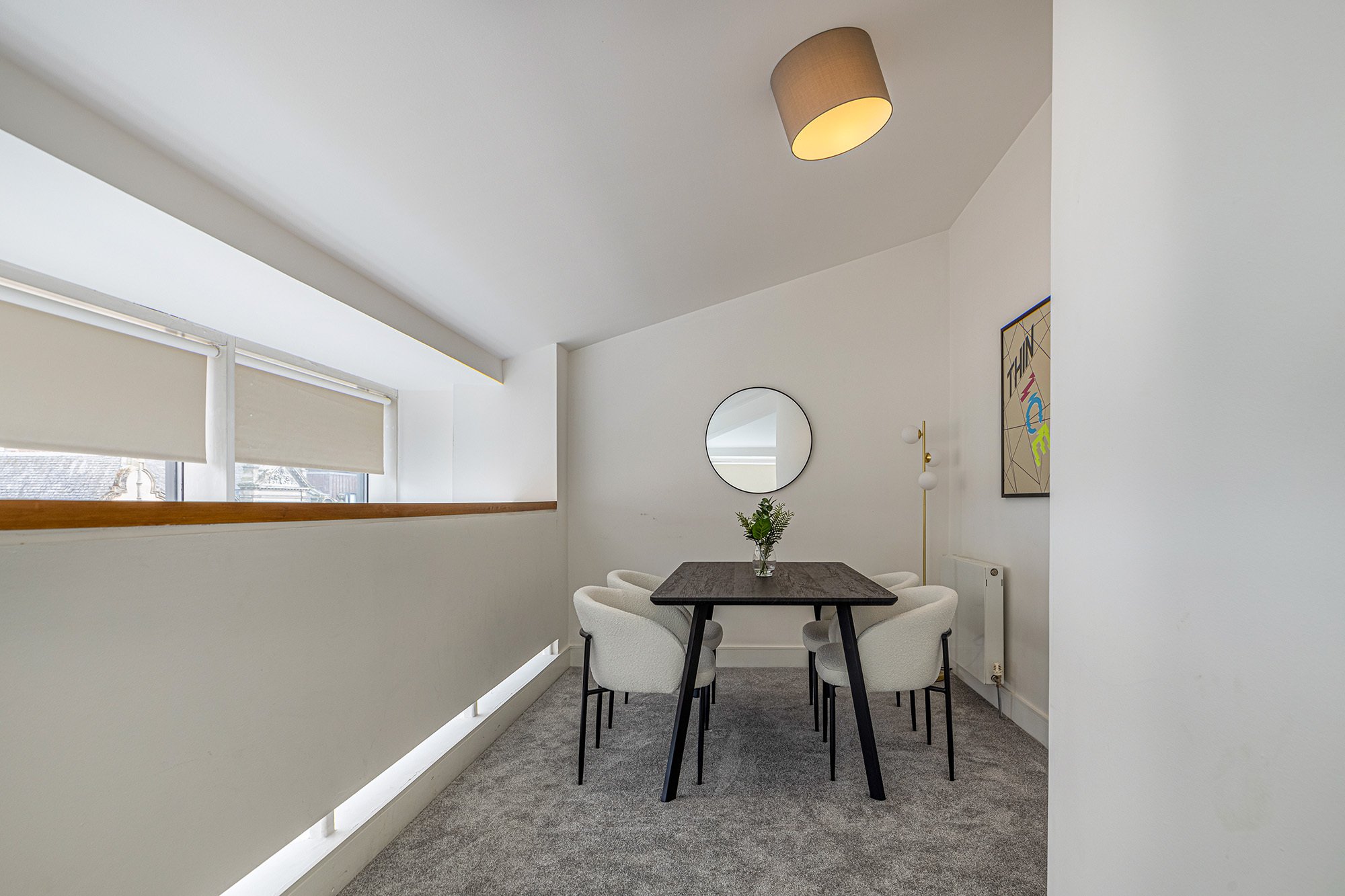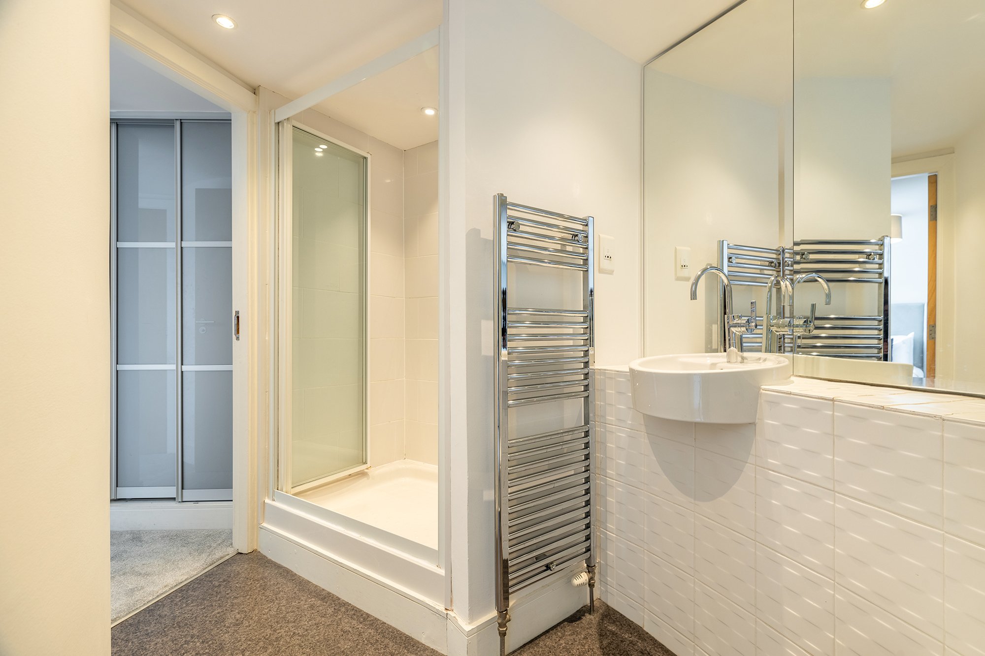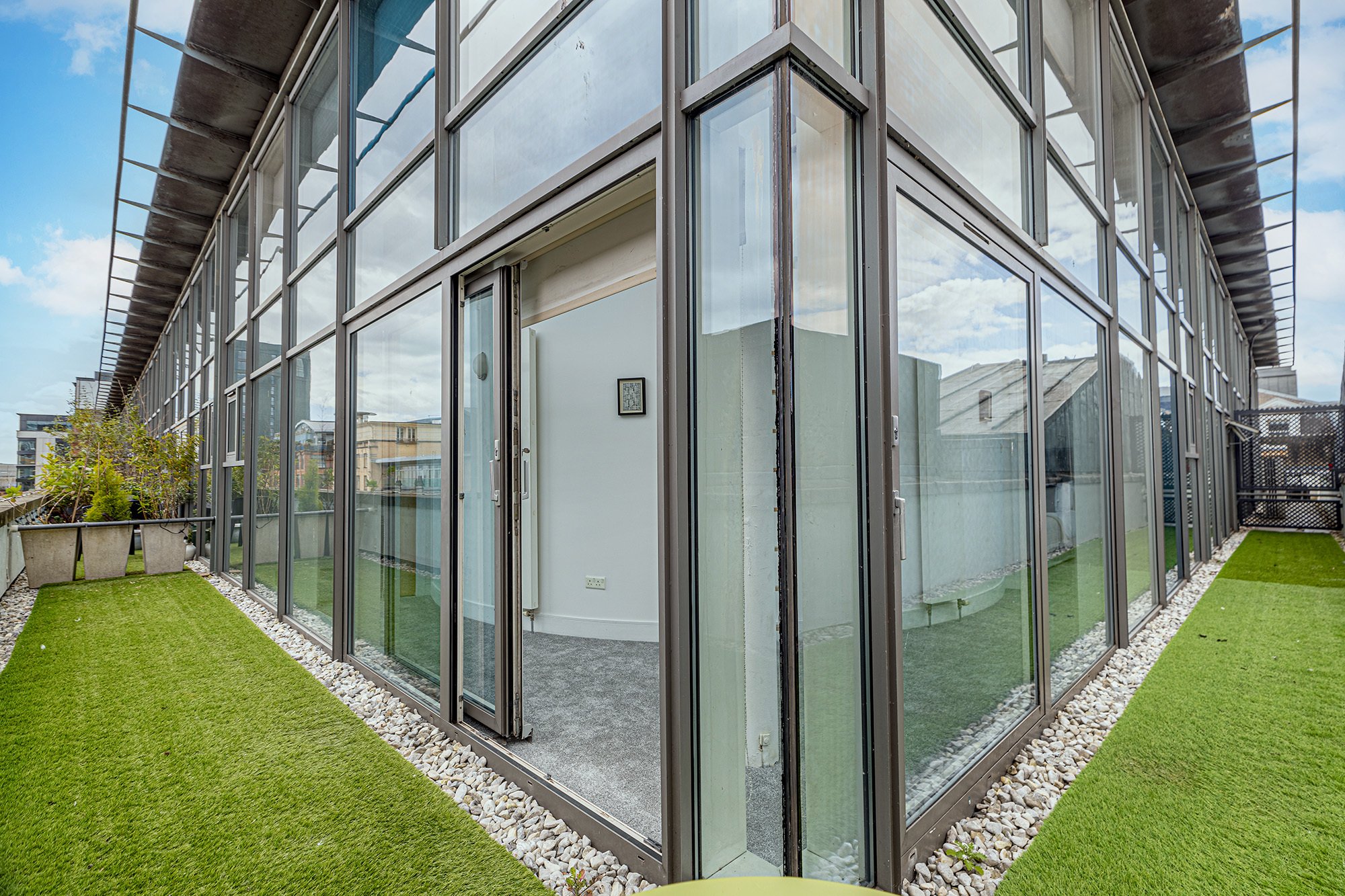 The stylish apartments centres around a substantial spiral stair, both upper and lower floors are flooded with natural light from the full height walls of glass spanning the full length of the apartment, patio doors lead to the 372 sq ft terrace and notable features include curved mezzanine and galleried ‘L’-shaped living space with vaulted ceilings, spanning over 30 ft, and with off-set mezzanine room, currently used as dining area and ideal as a third spare bedroom. On the lower floor there are two generous bedrooms both with fitted wardrobes and connected by a Jack & Jill style shower room as well as the walkway to the terrace. Viewing is highly recommended to appreciate this lovely, contemporary and characterful property.