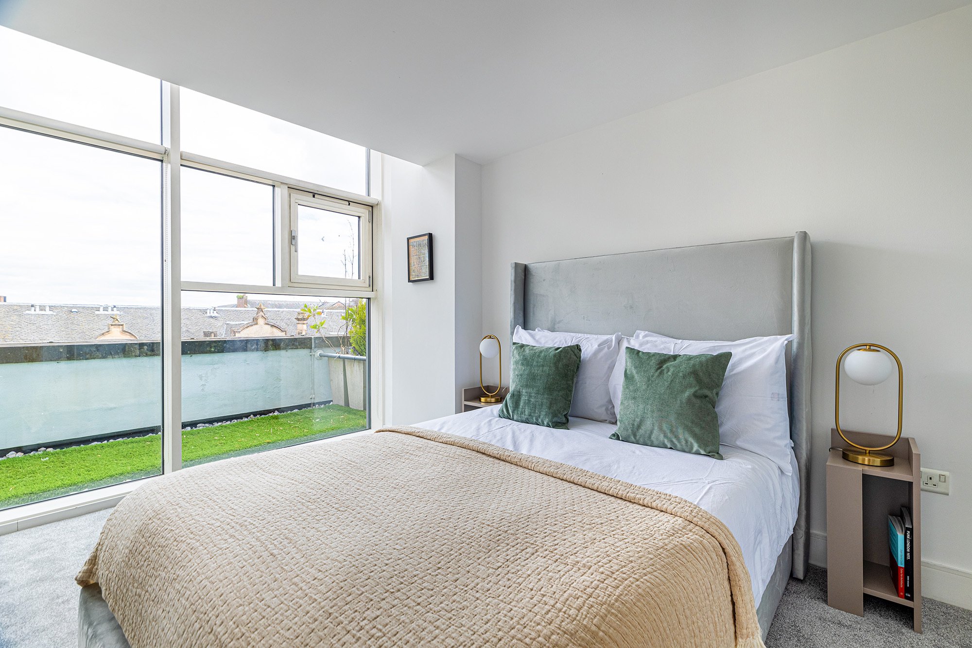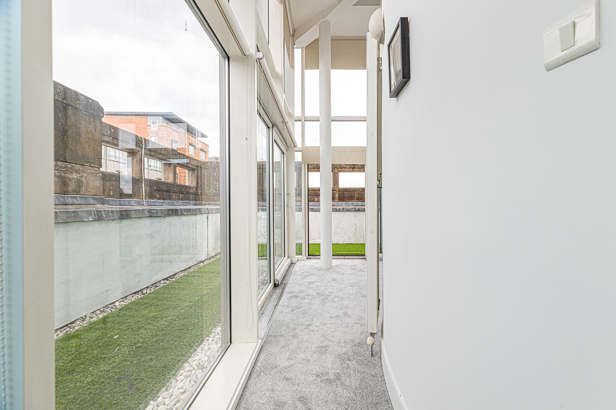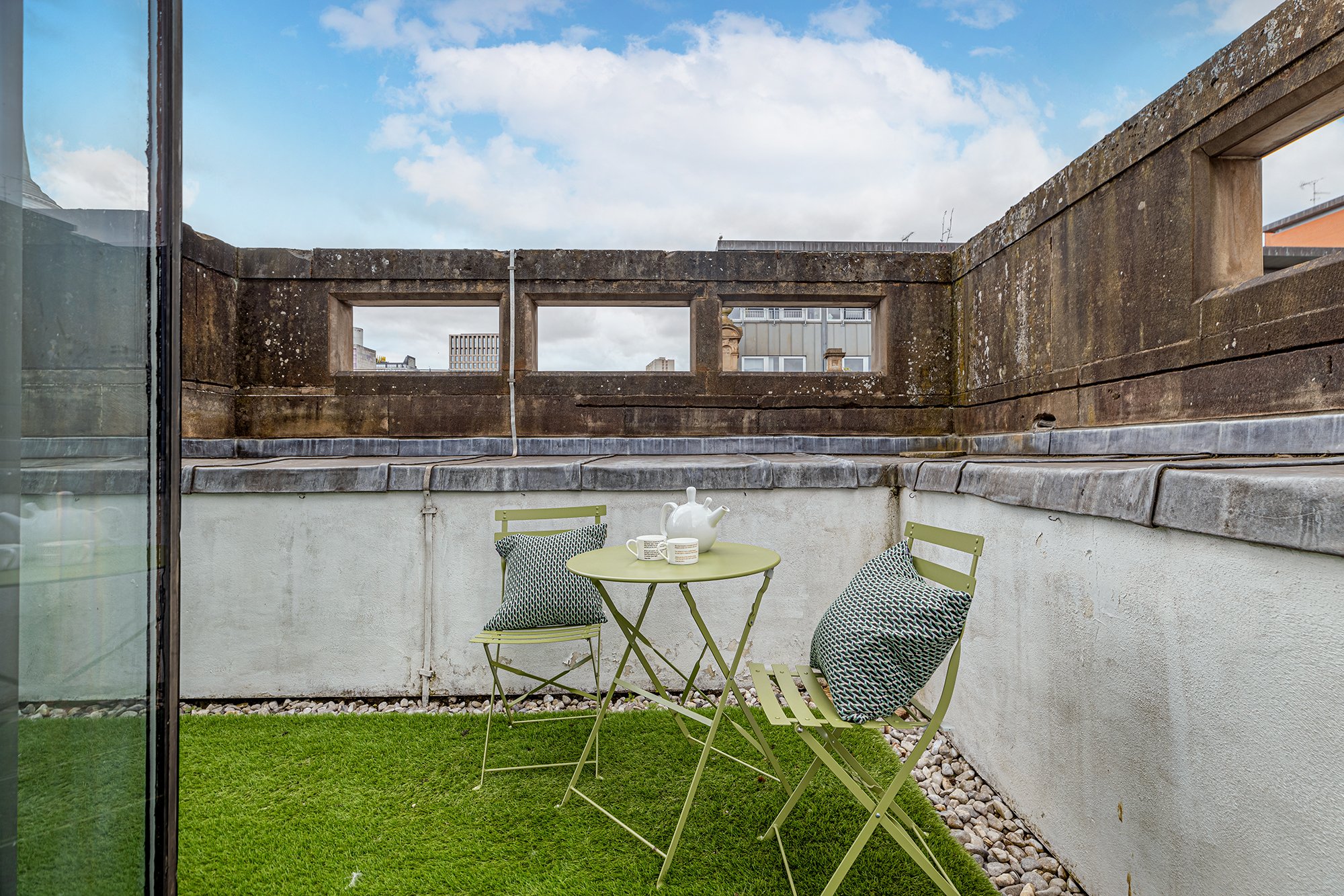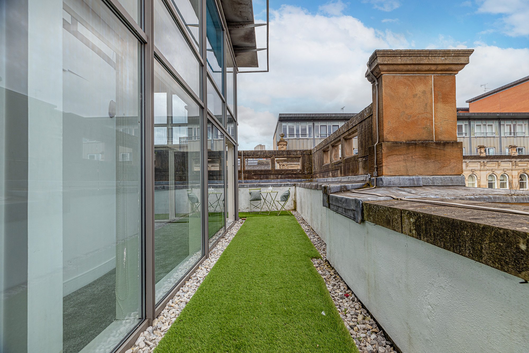 With a private terrace and lovely city views north, east and south over the Merchant City buildings and skyline beyond, this spacious duplex penthouse apartment extends to circa 1,399 sq ft. Completed in 2005 by Persimmon City Developments, the ‘Old Sheriff Court’ B listed neo-classical exterior was built circa 1844 and very successfully converted into 62 residential apartments, complete with a concierge, residents’ gym, and two resident’s courtyard gardens.