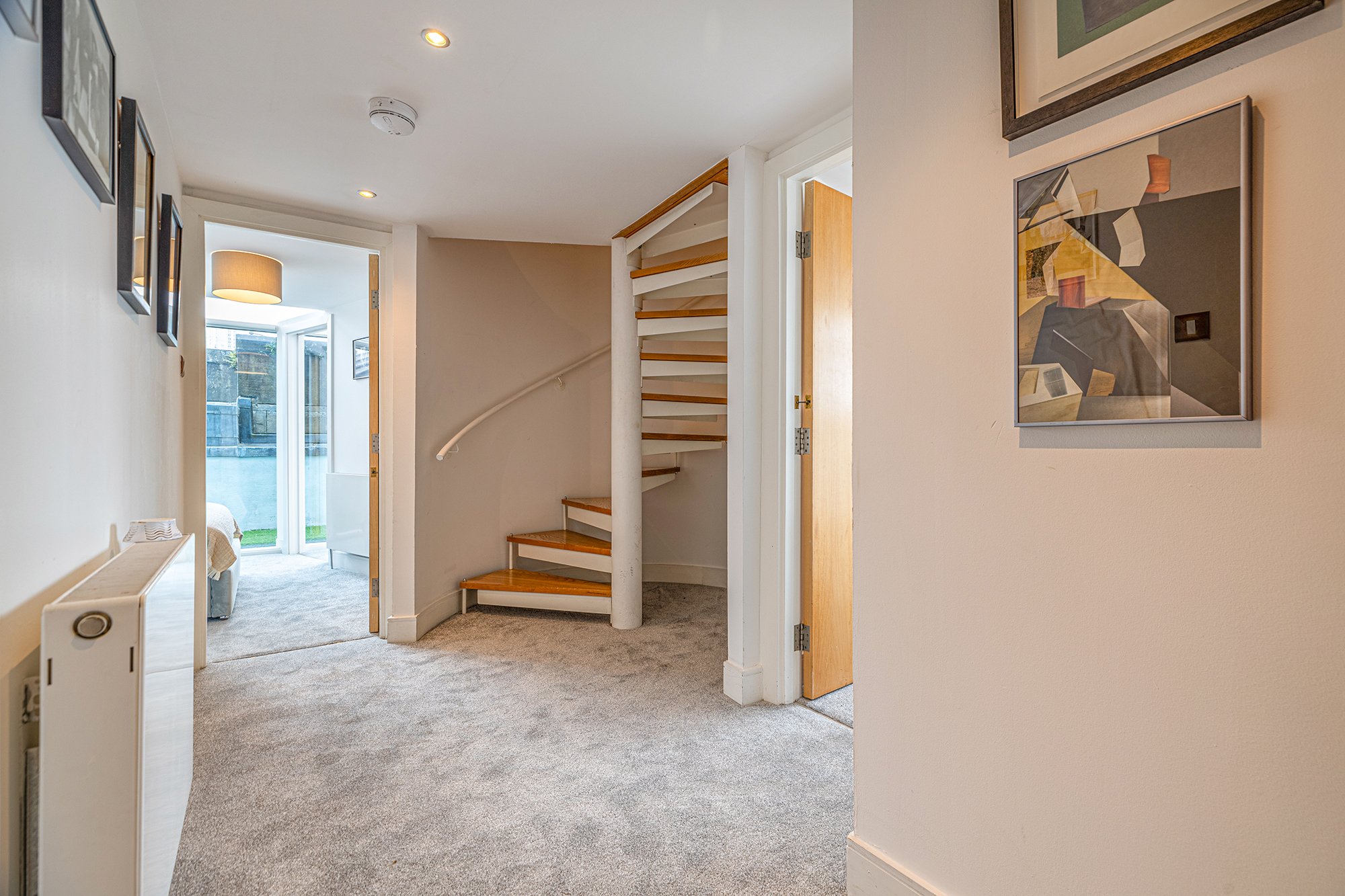 - Welcoming reception hallway with carpeted floor coverings and spiral stair to upper floor, access to the lower living accommodation and patio doors to the private terrace.