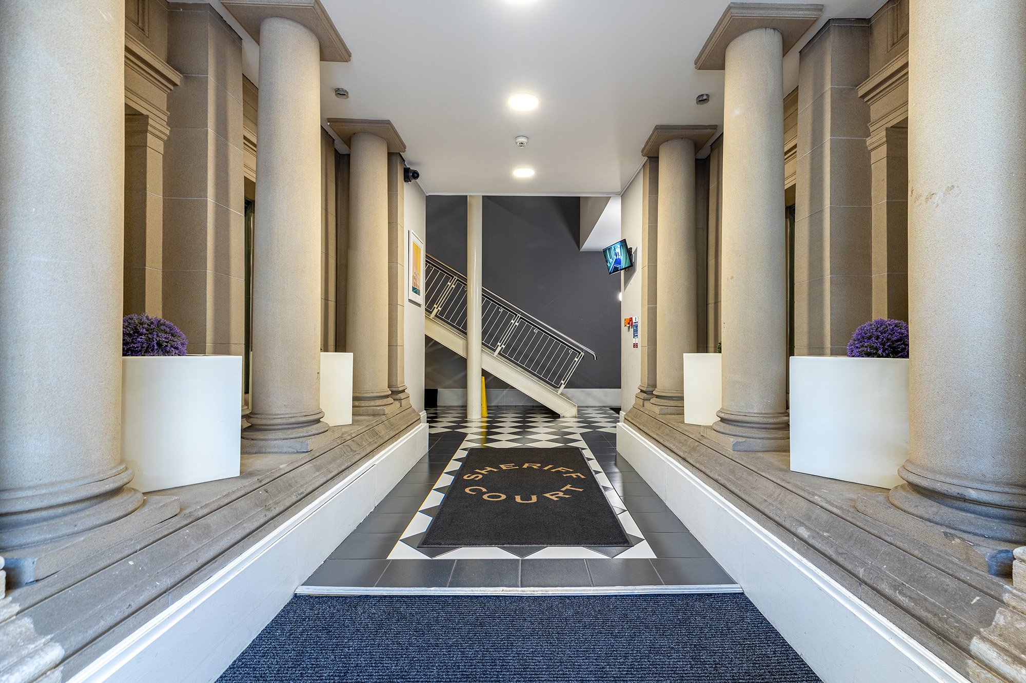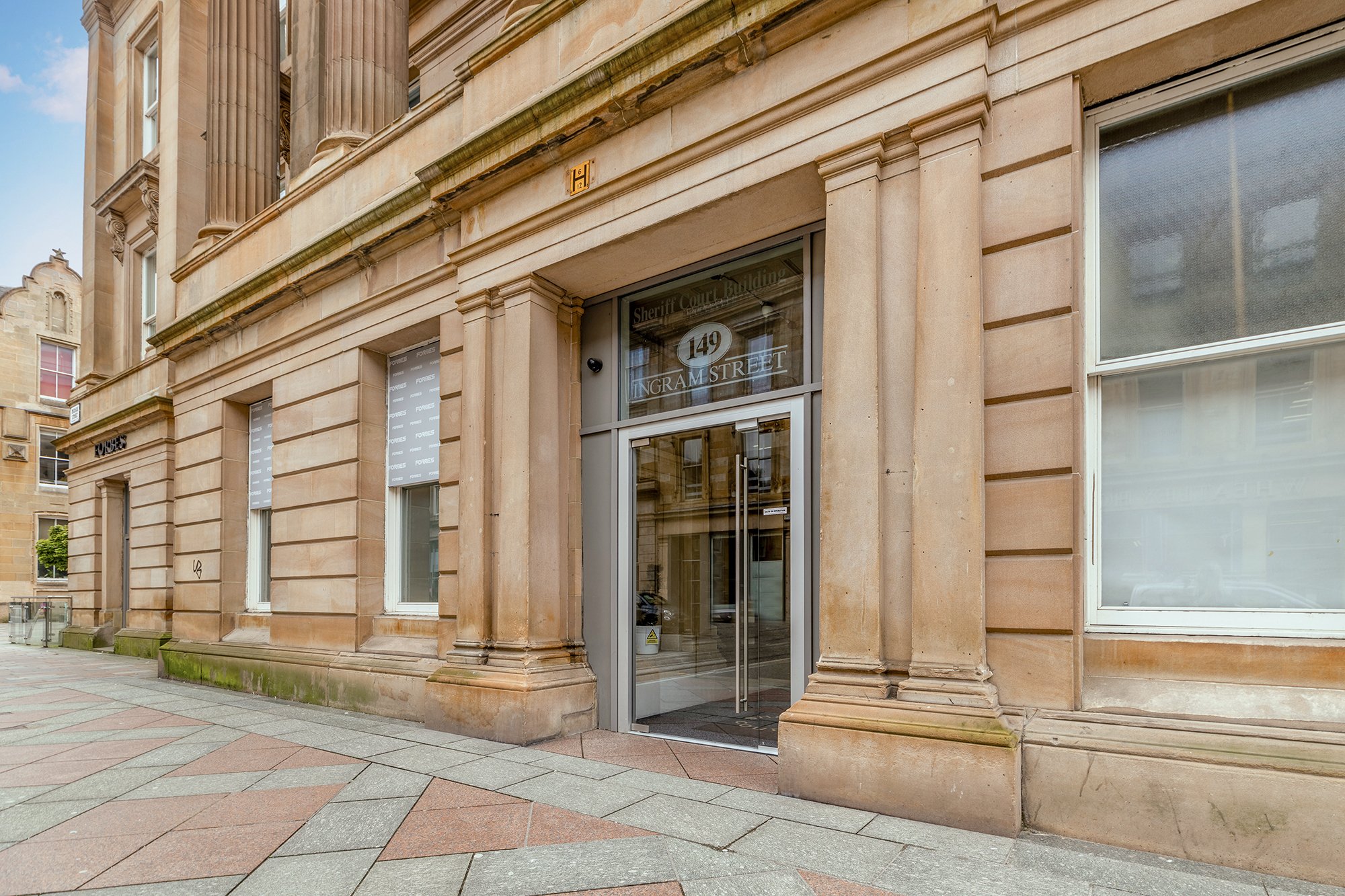 Walking from George Square continue South onto South Frederick Street. At the lights turn left onto Ingram Street passing by the Italian Centre on the left. Crossing at the pedestrian lights on the Glassford Street Junction, continue heading east on Ingram Street, cross over Hutchison Street. where you will find The Sheriff Court Building entrance at No. 149 almost immediately on the right-hand side. Once inside the building, take the lift to level three and follow the corridor to the first corner of the building passing the residents gym and courtyard gardens.