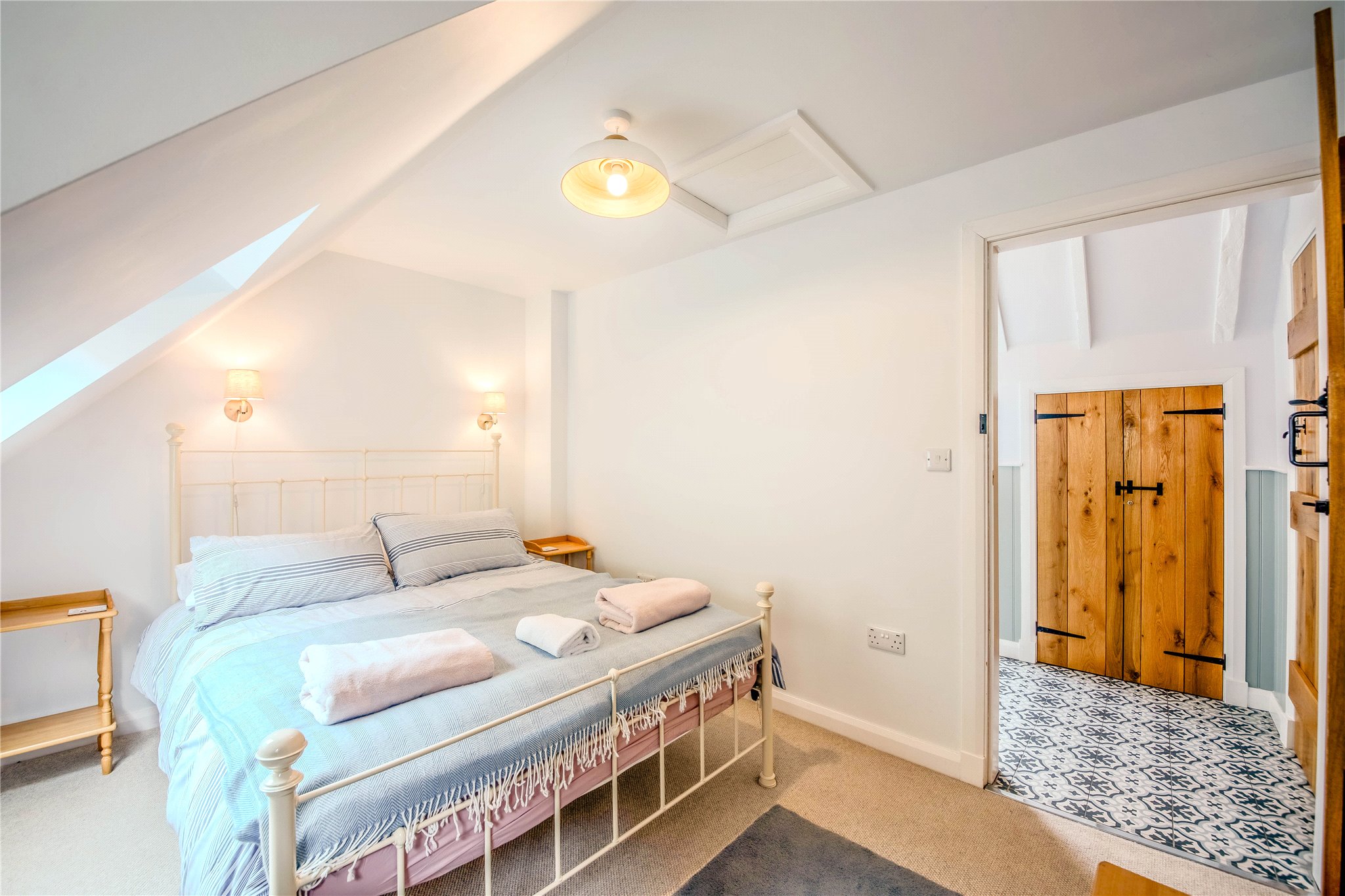 A wide staircase leads to the first floor where there are two generous double bedrooms with ample space for bedroom furniture, each benefit from Velux windows maximising the light and airy feel of the cottage. The bedrooms are served by a good-sized Jack & Jill bathroom with white three-piece suite and a roll-top bathtub.